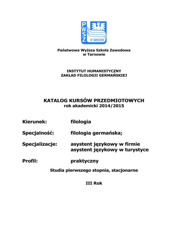 Państwowa WyŜsza Szkoła Zawodowa w Tarnowie INSTYTUT HUMANISTYCZNY ZAKŁAD FILOLOGII GERMAŃSKIEJ KATALOG KURSÓW PRZEDMIOTOWYCH rok akademicki 2014/2015 Kierunek: filologia Specjalność: filologia germańska; Specjalizacje: asystent językowy w firmie asystent językowy w turystyce Profil: praktyczny Studia pierwszego stopnia, stacjonarne III Rok Państwowa WyŜsza Szkoła Zawodowa w Tarnowie – Zakład Filologii Germańskiej Katalog kursów przedmiotowych kierunek: filologia, specjalność: filologia germańska, III rok A. Przedmioty podstawowe ............................................................................................................ 3 Praktyczna Nauka Języka Niemieckiego (PNJN) ........................................................................... 3 B. Przedmioty kierunkowe .............................................................................................................11 Historia literatury niemieckiej ....................................................................................................11 Opcja: Współczesne problemy krajów niemieckojęzycznych ........................................................14 Opcja: Film niemiecki................................................................................................................17 Wprowadzenie do teorii i praktyki tłumaczeń..............................................................................19 Opcja: Tłumaczenie tekstów specjalistycznych ...........................................................................22 Opcja: Tłumaczenie tekstów uŜytkowych ...................................................................................25 Seminarium dyplomowe............................................................................................................28 Opcja: Komunikacja językowa w biurze......................................................................................32 Opcja: Geografia turystyczna krajów obszaru języka niemieckiego...............................................34 Opcja: Język niemiecki prawa i administracji ..............................................................................38 Opcja: Język niemiecki w hotelarstwie .......................................................................................40 Opcja: Język niemiecki techniki .................................................................................................43 Opcja: język niemiecki w gastronomii ........................................................................................46 Opcja: Tłumaczenie tekstów ekonomicznych i prawniczych .........................................................50 Opcja: Tłumaczenie tekstów promocyjnych ................................................................................53 C. Pozostałe przedmioty................................................................................................................55 Lektorat języka obcego – patrz katalog kursów dla 1. roku..........................................................55 Etyka i kultura ..........................................................................................................................56 Ochrona własności intelektualnej...............................................................................................59 2 Państwowa WyŜsza Szkoła Zawodowa w Tarnowie – Zakład Filologii Germańskiej Katalog kursów przedmiotowych kierunek: filologia, specjalność: filologia germańska, III rok A. Przedmioty podstawowe Nr pola Nazwa pola Opis Instytut Humanistyczny Zakład Filologii Germańskiej Filologia, specjalność: filologia germańska Praktyczna Nauka Języka Niemieckiego (PNJN) 1 Jednostka 2 Kierunek studiów 3 Nazwa modułu kształcenia/ przedmiotu 4 Kod modułu kształcenia/ przedmiotu 5 6 7 8 9 Kod Erasmusa Punkty ECTS Rodzaj modułu Rok studiów Semestr 09.0 14 ECTS (6 + 8) obowiązkowy III 5, 6 10 Typ zajęć 11 12 Liczba godzin Koordynator ćwiczenia praktyczne 135 h (60 + 75) dr Robert Kołodziej mgr Magdalena Bodniak mgr Maria Lustofin mgr Anna Sikora j. niemiecki, j. polski 13 Prowadzący 14 Język wykładowy 15 Zakres nauk podstawowych obszar nauk humanistycznych 16 Zajęcia ogólnouczelniane/ na innym kierunku NIE 17 Wymagania wstępne 18 Efekty kształcenia Zaliczenie IV semestru studiów, znajomość języka niemieckiego na poziomie B2 Student: - ma uporządkowaną wiedzę podstawową o budowie języka niemieckiego zorientowaną na zastosowania praktyczne w wybranych dziedzinach Ŝycia (FI1P_W01) - student ma umiejętności językowe zgodne z wymaganiami określonymi dla poziomu B2/C1+ ESOKJ (język niemiecki) (FI1P _U01) - posiada umiejętność przygotowania złoŜonych wypowiedzi pisemnych w języku niemieckim odnoszących się do róŜnych dziedzin Ŝycia społecznego i zawodowego, z wykorzystaniem róŜnych źródeł (FI1P _U04) - posiada umiejętność przygotowania i przedstawienia wystąpień ustnych dłuŜszych i o złoŜonej strukturze w języku niemieckim na wybrany temat, z wykorzystaniem róŜnych źródeł (FI1P _U05) - potrafi skutecznie stosować strategie uczenia 3 Państwowa WyŜsza Szkoła Zawodowa w Tarnowie – Zakład Filologii Germańskiej Katalog kursów przedmiotowych kierunek: filologia, specjalność: filologia germańska, III rok się i uŜycia języka niemieckiego (FI1P _U16) - student ma świadomość poziomu swojej wiedzy i umiejętności, rozumie potrzebę uczenia się przez całe Ŝycie, a szczególnie doskonalenia własnych kompetencji językowych (FI1P _K01) - potrafi efektywnie współdziałać i kreatywnie pracować w grupie, przyjmując w niej róŜne role z uwzględnieniem niemieckojęzycznego kontekstu społeczno-kulturowego (FI1P _K02) - charakteryzuje się tolerancją, otwartością na odmienność i róŜnorodność kulturową wobec uŜytkowników języków obcych, a takŜe jest świadomy wyzwań globalnych (FI1P _K07) 19 Stosowane metody dy