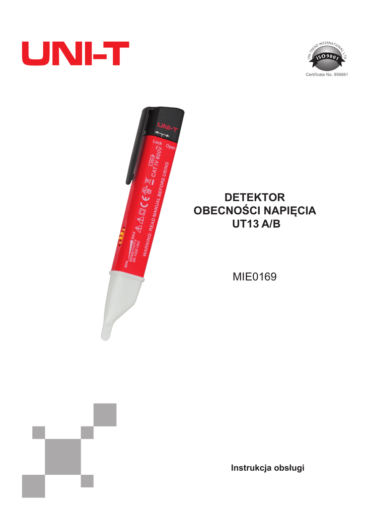 DETEKTOR OBECNOŚCI NAPIĘCIA UT13 A/B MIE0169 Instrukcja obsługi Drogi użytkowniku, Dziękujemy za wybranie naszego produktu Detektor obecności napięcia, seria UT13 A/B. Aby używanie przyrządu było bezpieczne, prosimy przeczytać uważnie niniejszą instrukcję, w szczególności część dotyczącą bezpieczeństwa pracy. Po jej przeczytaniu zalecamy przechowywanie jej w miejscu, z którego w razie potrzeby można by było łatwo, ponownie po nią sięgnąć. Spis treści I. WPROWADZENIE 1. Zasady bezpieczeństwa 2. Symbole elektryczne 3. Wymagania środowiskowe II. Obsługa 1. Włączanie 2. Detekcja napięcia zmiennego AC 3. Dostosowanie czułości 4 4 4 4 5 5 5 5 III. Zasilanie 5 IV. Wymiana baterii 6 V. Czyszczenie i konserwacja 6 I. WPROWADZENIE 1. Zasady bezpieczeństwa Ostrzeżenie! Poniższa instrukcja zawiera informacje dotyczące obsługi i warunków bezpieczeństwa podczas używania detektora. Przed rozpoczęciem pracy należy dokładnie zapoznać się z zawartymi w niej wskazówkami. Nieprzestrzeganie wskazówek zawartych w instrukcji może być przyczyną poważnych obrażeń lub śmierci. W celu ograniczenia ryzyka wystąpienia uszkodzenia lub obrażeń: 1. Nie należy używać urządzenia jeśli zostało uszkodzone lub nie działa poprawnie. W takim wypadku należy skontaktować się z autoryzowanym punktem serwisowym w celu sprawdzenia / naprawy. 2. Nie należy stosować napięcia pomiędzy końcówkową urządzenia i gruntem wyższego niż napięcie znamionowe. 3. W przypadku napięcia przekraczającego 30 VAC należy zachować szczególne środki ostrożności, ponieważ istnieje możliwość porażenia prądem. 4. Należy przestrzegać lokalne przepisy i standardy dotyczące warunków bezpieczeństwa. 2. Symbole elektryczne Podwójna izolacja Uwaga! Ryzyko porażenia prądem! ⚠ Ostrzeżenie! Należy odnieść się do instrukcji obsługi CAT IV: Podstawowy poziom zasilania, linie napowietrzne, systemy kabli. Urządzenie spełnia standardy bezpieczeństwa zgodne z: EMC:EN61326-1:2006, LVD: EN610101:2010 EN61010-031:2002+A1:2008, UL: UL61010-1 drugiego wydania z 2005-07-22, CAN/ CSA-C22.2 nr.61010-1, drugiego wydania z 2004-07. Uwaga!: Zabrania się dotykać końcówki detektora oznaczonej na biało. 3. Wymagania środowiskowe • Napięcie pracy: UT13A: 24 - 600 V AC; UT13B: 50 - 1000 V AC • Częstotliwość pracy: 50 - 60 Hz • Temperatura pracy: 0ºC ~ 40ºC - 4- • Temperatura przechowywania: -10ºC ~ 50ºC • Wilgotność: ≤ 95% • Wysokość: ≤ 2000 m • Urządzenie wyłącznie do użytku wewnątrz pomieszczeń • Ochrona środowiska stopnia drugiego II. Obsługa 1. Włączanie Naciśnij przycisk zasilania, urządzenie wyda dwa sygnały dźwiękowe, wskaźnik LED zaświeci dwa razy. W trybie gotowości do pomiaru, wskaźnik LED miga dwa razy co 1,5 sekundy. 2. Detekcja napięcia zmiennego AC Zbliż detektor do testowanego obiektu. Jeżeli detektor wykryje napięcie w swoim zakresie: UT13A: wskaźnik LED zaświeci się, urządzenie wyda sygnał dźwiękowy. UT13B: wskaźnik LED zaświeci się, urządzenie zawibruje oraz wyda sygnał dźwiękowy. 3. Dostosowanie czułości Bezpośrednio po włączeniu urządzenia, czułość może być nieco obniżona. Poziom czułości należy dostosować za pomocą pokrętła. Uwaga: Zabrania się dotykać końcówki detektora oznaczonej na biało. Obudowa Nie dotykać! III. Zasilanie Jeżeli napięcie baterii wynosi mniej niż 1(+/-0,2) V, wskaźnik LED będzie migać raz na 1,5 sekundy. Buzer i wibracje nie będą działały. - 5- IV. Wymiana baterii Zasilanie: 1x 1,5 V AAA (UT13B – bateria alkaliczna) Aby wymienić baterię należy: 1. Odłączyć detektor od testowanego obwodu. 2. Jedna ręką trzymać detektor, natomiast kciuk drugiej umieścić na osłonie (jak wskazano na ilustracji) 3. Przekręć końcówkę przeciwnie do ruchów wskazówek zegara. 4. Wymień baterię na nową (zgodnie z zaznaczoną polaryzacją). 5. Zamknij obudowę. V. Czyszczenie i konserwacja Należy okresowo czyścić obudowę detektora za pomocą miękkiej, suchej ściereczki. Zabrania się używać urządzenie jeśli jest wilgotne. Powyższa instrukcja oraz specyfikacja techniczna urządzenia mogą ulec zmianie bez wcześniejszego powiadomienia. Niniejszym firma Lechpol oświadcza, że urządzenie MIE0169 jest zgodne z zasadniczymi wymaganiami oraz innymi stosownymi postanowieniami dyrektywy 1999/5/WE. Właściwa deklaracja do pobrania na stronie www. lechpol.eu. Poland Prawidłowe usuwanie produktu (zużyty sprzęt elektryczny i elektroniczny) Oznaczenie umieszczone na produkcie lub w odnoszących się do niego tekstach wskazuje, że po upływie okresu użytkowania nie należy usuwać z innymi odpadami pochodzącymi z gospodarstw domowych. Aby uniknąć szkodliwego wpływu na środowisko naturalne i zdrowie ludzi wskutek niekontrolowanego usuwania odpadów, prosimy o oddzielenie produktu od innego typu odpadów oraz odpowiedzialny recykling w celu promowania ponownego użycia zasobów materialnych jako stałej praktyki. W celu uzyskania informacji na temat miejsca i sposobu bezpiecznego dla środowiska recyklingu tego produktu użytkownicy w gospodarstwach domowych powinni skontaktować się z punktem sprzedaży detalicznej, w którym dokonali zakupu produkt, lub z organem władz lokalnych Użytkownicy w firmach powinni skontaktować się ze swoim dostawcą i sprawdzić warunki umowy zakupu. Produkt nie należy usuwać razem z innymi odpadami komercyjnymi. Wyprodukowano w CHRL dla LECHPOL Zbigniew Leszek, Miętne ul. Garwolińska 1, 08-400 Garwolin. - 6- www.uni-t.eu