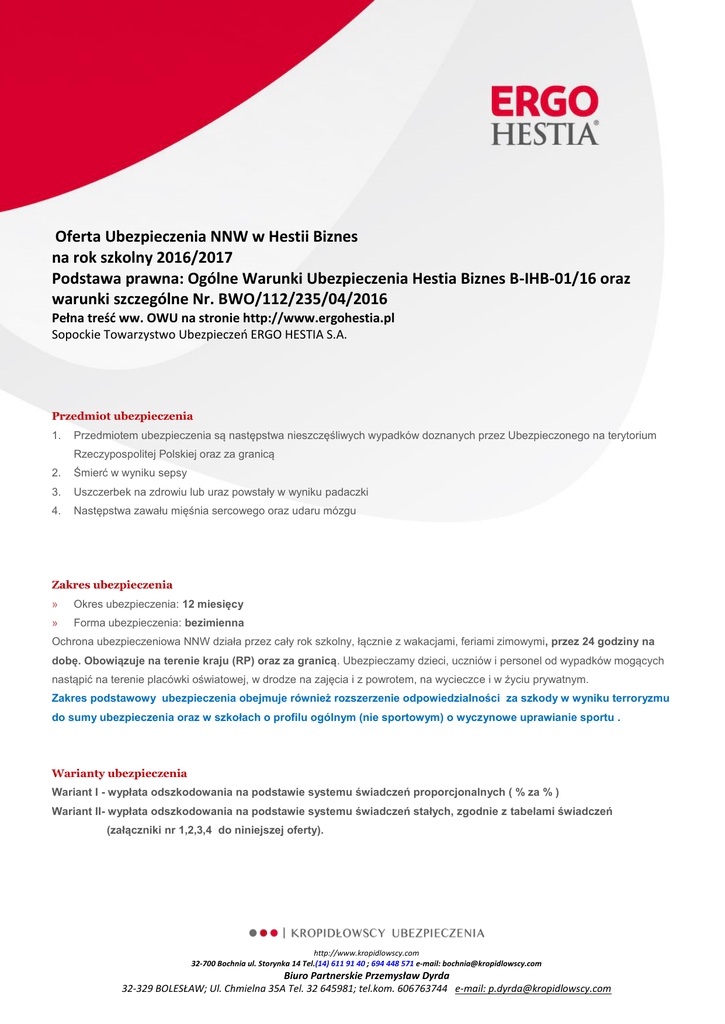 Oferta Ubezpieczenia NNW w Hestii Biznes na rok szkolny 2016/2017 Podstawa prawna: Ogólne Warunki Ubezpieczenia Hestia Biznes B-IHB-01/16 oraz warunki szczególne Nr. BWO/112/235/04/2016 Pełna treść ww. OWU na stronie http://www.ergohestia.pl Sopockie Towarzystwo Ubezpieczeń ERGO HESTIA S.A. Przedmiot ubezpieczenia 1. Przedmiotem ubezpieczenia są następstwa nieszczęśliwych wypadków doznanych przez Ubezpieczonego na terytorium Rzeczypospolitej Polskiej oraz za granicą 2. Śmierć w wyniku sepsy 3. Uszczerbek na zdrowiu lub uraz powstały w wyniku padaczki 4. Następstwa zawału mięśnia sercowego oraz udaru mózgu Zakres ubezpieczenia » Okres ubezpieczenia: 12 miesięcy » Forma ubezpieczenia: bezimienna Ochrona ubezpieczeniowa NNW działa przez cały rok szkolny, łącznie z wakacjami, feriami zimowymi, przez 24 godziny na dobę. Obowiązuje na terenie kraju (RP) oraz za granicą. Ubezpieczamy dzieci, uczniów i personel od wypadków mogących nastąpić na terenie placówki oświatowej, w drodze na zajęcia i z powrotem, na wycieczce i w życiu prywatnym. Zakres podstawowy ubezpieczenia obejmuje również rozszerzenie odpowiedzialności za szkody w wyniku terroryzmu do sumy ubezpieczenia oraz w szkołach o profilu ogólnym (nie sportowym) o wyczynowe uprawianie sportu . Warianty ubezpieczenia Wariant I - wypłata odszkodowania na podstawie systemu świadczeń proporcjonalnych ( % za % ) Wariant II- wypłata odszkodowania na podstawie systemu świadczeń stałych, zgodnie z tabelami świadczeń (załączniki nr 1,2,3,4 do niniejszej oferty). http://www.kropidlowscy.com 32-700 Bochnia ul. Storynka 14 Tel.(14) 611 91 40 ; 694 448 571 e-mail: [email protected] Biuro Partnerskie Przemysław Dyrda 32-329 BOLESŁAW; Ul. Chmielna 35A Tel. 32 645981; tel.kom. 606763744 e-mail: [email protected] Zakres podstawowy Rodzaj świadczenia (świadczenia związane z następstwem nieszczęśliwego wypadku) Wysokość wypłaty Śmierć Ubezpieczonego w wyniku NNW oraz sepsydo 2 lat od daty wystąpienia Śmierć Ubezpieczonego w wyniku niewydolności wielonarządowej do 2 lat od daty wystąpienia Całkowity 100% uszczerbku na zdrowiu (trwałe inwalidztwo) 100% sumy ubezpieczenia 100 % sumy ubezpieczenia 100% sumy ubezpieczenia Częściowy trwały uszczerbek na zdrowiu, w tym też: » skutki pogryzienia przez psa, pokąsania lub pogryzienia przez inne zwierzęta oraz ukąszenia owadów » poparzenie » odmrożenie » złamanie, zwichniecie, skręcenie, » wstrząśnienie mózgu, obicie mózgu, » zranienie, rany szarpane, rany cięte » uszkodzenie narządu słuchu lub wzroku » obrażenia ciała spowodowane atakiem epilepsji, upadkiem na % sumy ubezpieczenia, w jakim Ubezpieczony doznał trwałego uszczerbku skutek omdlenia, utraty przytomności o nieustalonej przyczynie » następstwa zawału mięśnia sercowego » następstwa udaru mózgu Jednorazowe świadczenie , leczenie szpitalne (min 7 dni) - bez trwałego uszczerbku na zdrowiu Jednorazowe świadczenie na wypadek leczenia ambulatoryjnego (min 22 dni) - bez trwałego uszczerbku na zdrowiu 3% sumy ubezpieczenia 1% sumy ubezpieczenia Koszty nabycia środków pomocniczych, protez, gipsów miękkich i do 25 % sumy ubezpieczenia, w tym koszty innych przedmiotów ortopedycznych odbudowy zębów stałych jak poniżej Koszty odbudowy zębów stałych Uszczerbek na zdrowiu w wyniku nieudanej próby samobójczej max 500 zł za każdy ząb stały nie więcej niż 3 000 zł % Sumy Ubezpieczenia w jakim Ubezpieczony doznał trwałego uszczerbek Śmierć w wyniku popełnienia samobójstwa 100 % Sumy Ubezpieczenia 2 Koszty dodatkowych badań lekarskich zleconych przez STU Ergo Hestia SA dla uzasadnienia roszczeń Uszczerbek w wyniku rekreacyjnego uprawiania sportu w czasie wg załączonych rachunków % sumy ubezpieczenia, w jakim Ubezpieczony zajęć szkolnych i pozaszkolnych (nie dotyczy zajęć w ramach doznał trwałego uszczerbku Zarejestrowanych Klubów Sportowych i Szkół Mistrzostwa Sportowego ) Zwrot kosztów przeszkolenia zawodowego inwalidów do 30 % sumy Ubezpieczenia Odpowiedzialność Ergo Hestii ma miejsce tylko w sytuacji, gdy do rozpoznania i zdiagnozowania choroby lub zdarzenia nieszczęśliwego wypadku doszło w okresie ubezpieczenia. Terroryzm : Za terroryzm uważa się nielegalne akcje organizowane z pobudek ideologicznych lub politycznych, indywidualne lub grupowe , skierowane przeciwko osobą lub obiektu w celu wprowadzenia chaosu, zastraszenia ludności i dezorganizacji życia publicznego przy użyciu przemocy oraz skierowane przeciw społeczeństwu z zamiarem jego zastraszenia dla osiągnięcia celów politycznych lub społecznych . Zakres rozszerzony – świadczenia dodatkowe Zwrot kosztów leczenia, czyli wydatków poniesionych wskutek NNW na terytorium RP z tytułu Udzielenia doraźnej pomocy lekarskiej lub ambulatoryjnej, pobytu w szpitalu, badań ( w tym rezonans magnetyczny, tomograf komputerowy), Do wysokości 5 % sumy zabiegów ambulatoryjnych i operacji . Zakup niezbędnych ubezpieczenia lekarstw lub środków opatrunkowych przepisanych przez lekarza Brak udziału własnego Koszty wypłacane są na podstawie oryginałów rachunków. Dzienne świadczenie szpitalne (związane z NNW) - płatne od 1 dnia pobytu, max 90 dni ( jeżeli pobyt w szpitalu trwał co najmniej 48 godzin) Dzienne świadczenie szpitalne związane z chorobą płatne od 1 dnia pobytu, max 20 zł za każdy dzień 20 zł za każdy dzień 90 dni ( jeżeli pobyt w szpitalu trwał co najmniej 48 godzin) 3 Zakres ubezpieczenia na rok szkolny 2016/2017 z zachowaniem dotychczasowej składki (48,00zł) Lp. Rodzaje świadczeń – Zakres podstawowy Suma ubezpieczenia i wysokość świadczenia w zł 1 16 000,00 / 160,00 6 Za 100% trwałego uszczerbku / 1% trwałego uszczerbku Śmierć Ubezpieczonego w wyniku nieszczęśliwego wypadku oraz sepsy do 2 lat od daty wystąpienia Śmierć Ubezpieczonego w wyniku niewydolności wielonarządowej do 2 lat od daty wystąpi