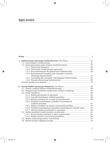 Spis treści Wstęp . . . . . . . . . . . . . . . . . . . . . . . . . . . . . . . . . . . . . . . . ...................................................... 9 1. Budżetowanie operacyjne krótkookresowe (Jan Śliwa).............................. 1.1. Istota budżetu i budżetowania . . .................................................... 1.2. Istota planowania i jego związek z budżetowaniem................................ 1.2.1. Planowanie finansowe. . . . . .................................................... 1.2.2. Planowanie i budżetowanie operacyjne...................................... 1.2.3. Baza informacyjna dla planowania i budżetowania......................... 1.2.4. Rachunkowość zarządcza jako narzędzie tworzenia informacji planistycznych . .................................................... 1.2.5. Controlling jako narzędzie wspomagające budżetowanie.................. 1.2.6. Warunki skutecznego budżetowania......................................... Pytania i problemy do dyskusji . . . . . . . . .................................................... 11 15 19 20 22 24 11 25 36 37 2. Roczny budżet operacyjno-finansowy (Jan Śliwa) .................................... 38 2.1. Zasady i zadania budżetu krótkookresowego ....................................... 38 2.2. Przygotowanie budżetów cząstkowych i budżetu wiodącego ..................... 44 2.3. Budżet handlowy. . . . . . . . . . . . . . . . . . .................................................... 46 2.3.1. Budżet przychodów ze sprzedaży ............................................ 46 2.3.2. Czynniki kształtujące wielkość sprzedaży.................................... 48 2.3.3. Metody ustalania cen i zasady ich kształtowania ........................... 49 2.3.4. Przykład wyodrębniania czynników kształtujących wielkość sprzedaży . . . . . . . . .................................................... 52 2.3.5. Wpływ czynników na zmiany rentowności produktu....................... 54 2.3.6. Przykład wyodrębniania czynników kształtujących wielkość zysku ....... 55 2.3.7. Zbiorczy budżet przychodów ze sprzedaży .................................. 58 2.4. Budżet produkcji i budżet kosztów wytwarzania ................................... 61 2.4.1. Roczny budżet produkcji w ujęciu syntetycznym ........................... 62 2.4.2. Budżet kosztów wytworzenia produktów.................................... 64 2.5. Budżet technicznego kosztu wytworzenia ...........................................70 2.6. Budżet kosztów ogólnego zarządu................................................... 72 5 spis.indd 5 10-10-12 06:34 Spis treści 2.7. Budżet kosztów sprzedaży. . . . . . . . . . .................................................. 75 2.8. Budżet kosztów własnych uzyskania przychodów.................................. 76 Pytania i problemy do dyskusji . . . . . . . . . . .................................................. 77 3. Budżetowanie finansowe (Jan Śliwa) . .................................................. 78 3.1. Budżet wpływów i wydatków . . . . . .................................................. 78 3.2. Budżet nakładów kapitałowych na majątek obrotowy ............................. 82 3.3. Rachunek zysków i strat pro forma .................................................. 88 3.4. Budżet wyrobów gotowych. . . . . . . . . .................................................. 89 3.5. Bilans pro forma. . . . . . . . . . . . . . . . . . . . . .................................................. 90 3.6. Budżet przepływów pieniężnych . . .................................................. 91 3.7. Wskaźniki efektywnościowe budżetu................................................ 96 Pytania i problemy do dyskusji . . . . . . . . . . . ................................................ 100 4. Budżetowanie operacyjne średniookresowe (Jan Śliwa) ........................... 4.1. Istota budżetowania średniookresowego .......................................... 4.2. Części składowe biznesplanu . . . . . . . ................................................ 4.2.1. Część koncepcyjna biznesplanu ............................................. 4.2.2. Część budżetowa biznesplanu............................................... 4.2.3. Projekcja przepływów pieniężnych jako finansowy wyraz biznesplanu .. Pytania i problemy do dyskusji . . . . . . . . . . . ................................................ 101 101 104 104 110 117 127 5. Wprowadzenie do budżetowania kapitałowego (Wiesław Szczęsny) .............. 5.1. Istota budżetowania kapitałowego . ................................................ 5.2. Klasyfikacja inwestycji rzeczowych ................................................ 5.3. Zasady szacowania przepływów pieniężnych ..................................... 5.3.1. Operacyjne przepływy pieniężne a zysk księgowy......................... 5.3.2. Wpływ metody amortyzacji na wielkość przepływów pieniężnych ......... 5.3.3. Przepływy pieniężne a zmiany w kapitale obrotowym netto ............. 5.4. Preliminarz całkowitych przepływów pieniężnych ............................... Pytania i problemy do dyskusji . . . . . . . . . . . ................................................ 128 128 130 133 133 135 139 141 142 6. Ilościowe kryteria w budżetach inwestycji (Wiesław Szczęsny)..................... 6.1. Wartość inwestycji . . . . . . . . . . . . . . . . . . ................................................ 6.2. Stopa wartości bieżącej netto . . . . . . . ................................................ 6.3. Wewnętrzna stopa zwrotu . . . . . . . . . . ................................................ 6.4. Stopa zwrotu z uwzględnieniem reinwestowania przepływów pieniężnych ....... Pytania i problemy do dyskusji . . . . . . . . . . . ................................................ 144 144 146 148 151 153 7. Finansowanie i ryzyko inwestycji