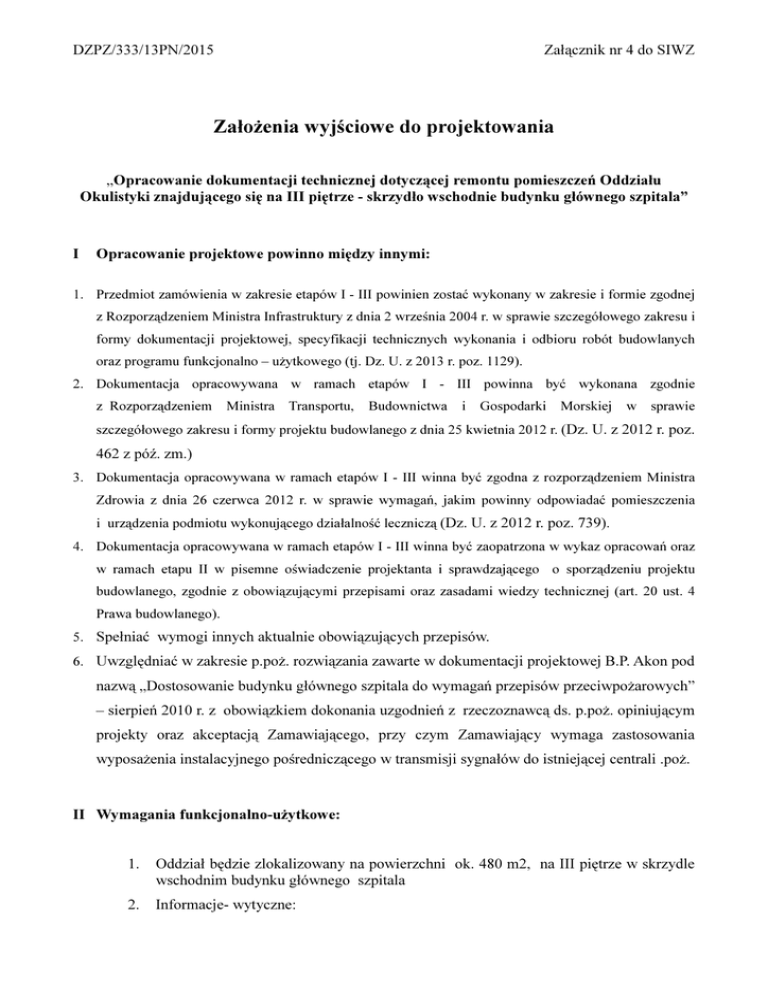 DZPZ/333/13PN/2015 Załącznik nr 4 do SIWZ Założenia wyjściowe do projektowania „Opracowanie dokumentacji technicznej dotyczącej remontu pomieszczeń Oddziału Okulistyki znajdującego się na III piętrze - skrzydło wschodnie budynku głównego szpitala” I Opracowanie projektowe powinno między innymi: 1. Przedmiot zamówienia w zakresie etapów I - III powinien zostać wykonany w zakresie i formie zgodnej z Rozporządzeniem Ministra Infrastruktury z dnia 2 września 2004 r. w sprawie szczegółowego zakresu i formy dokumentacji projektowej, specyfikacji technicznych wykonania i odbioru robót budowlanych oraz programu funkcjonalno – użytkowego (tj. Dz. U. z 2013 r. poz. 1129). 2. Dokumentacja opracowywana w ramach etapów I - III powinna być wykonana zgodnie z Rozporządzeniem Ministra Transportu, Budownictwa i Gospodarki Morskiej w sprawie szczegółowego zakresu i formy projektu budowlanego z dnia 25 kwietnia 2012 r. (Dz. U. z 2012 r. poz. 462 z póź. zm.) 3. Dokumentacja opracowywana w ramach etapów I - III winna być zgodna z rozporządzeniem Ministra Zdrowia z dnia 26 czerwca 2012 r. w sprawie wymagań, jakim powinny odpowiadać pomieszczenia i urządzenia podmiotu wykonującego działalność leczniczą (Dz. U. z 2012 r. poz. 739). 4. Dokumentacja opracowywana w ramach etapów I - III winna być zaopatrzona w wykaz opracowań oraz w ramach etapu II w pisemne oświadczenie projektanta i sprawdzającego o sporządzeniu projektu budowlanego, zgodnie z obowiązującymi przepisami oraz zasadami wiedzy technicznej (art. 20 ust. 4 Prawa budowlanego). 5. Spełniać wymogi innych aktualnie obowiązujących przepisów. 6. Uwzględniać w zakresie p.poż. rozwiązania zawarte w dokumentacji projektowej B.P. Akon pod nazwą „Dostosowanie budynku głównego szpitala do wymagań przepisów przeciwpożarowych” – sierpień 2010 r. z obowiązkiem dokonania uzgodnień z rzeczoznawcą ds. p.poż. opiniującym projekty oraz akceptacją Zamawiającego, przy czym Zamawiający wymaga zastosowania wyposażenia instalacyjnego pośredniczącego w transmisji sygnałów do istniejącej centrali .poż. II Wymagania funkcjonalno-użytkowe: 1. Oddział będzie zlokalizowany na powierzchni ok. 480 m2, na III piętrze w skrzydle wschodnim budynku głównego szpitala 2. Informacje- wytyczne: DZPZ/333/13PN/2015 Załącznik nr 4 do SIWZ a) sale chorych - oczekiwana całkowita ilość łóżek – min. 16 szt. - sale ogólne z węzłami sanitarnymi lub z dostępem do węzłów. - jedna izolatka mogąca spełniać rolę separatki (możliwość przełączania układów wentylacyjnych z podciśnienia na nadciśnienie i odwrotnie) b) pomieszczenia diagnostyki okulistycznej w tym : - gabinet nr 1 - ciemnia - gabinet nr 2 c) gabinety: zabiegowy nr 1 i nr 2 d) wygospodarowanie wnęk w ścianach korytarza na szafy wnękowe 3. Przygotowanie pomieszczeń dla pracowników zatrudnionych na najliczniejszej zmianie oddziału , dla personelu o strukturze i ilości jak niżej: Stanowisko Łącznie Kobiety Mężczyźni Ordynator 1 1 Lekarze kontraktowi 6(7) 6 1 Lekarze rezydenci 4(7) 4 3 Pielęgniarka oddziałowa 1 1 Pielęgniarki 4(6) 6 Sekretarki medyczne 2 2 Razem 18(24) 20 Adiunkci 4 UWAGA: w nawiasach podano całkowitą ilość zatrudnionego personelu w tym: - gabinet ordynatora - gabinet p. oddziałowej - gabinet lekarski (lekarzy + sekretarek) 4. Pozostałe funkcje stosownie do wymogów określonych w pkt. 2 i 3 oraz wynikające z innych potrzeb Zamawiającego powstałych w trakcie projektowania, w tym m.in. brudownik, pom. porządkowe, magazynki, kuchenka oddz., pomieszczenie lub miejsce pobytu dziennego, pkt pielęgniarski z pom. przygot. i pom. socjalnym, pom. DZPZ/333/13PN/2015 Załącznik nr 4 do SIWZ wc dla odwiedzających i niepełnosprawnych, węzeł sanitarny dla personelu, pom. na wózki. III Zakres opracowania projektowego powinien obejmować: 1. 2. Kompletne projekty – budowlany wraz z częścią technologiczną i projekt wykonawczy wraz z wszelkimi opracowaniami branżowymi w ilości 6 kpl. w wersji papierowej i 2 kpl. w wersji elektronicznej edytowalnej w formatach obsługiwanych przez program autocad oraz program kosztorysowy norma a także wersja do odczytu pdf na płycie DVD, CD lub masowej pamięci przenośnej (pendrive). Projekty aranżacji wnętrz wraz z kolorystyką i wyceną wyposażenia objętego projektem technologii – w tym zabudowy meblowej montowanej na stałe. Łącznie z rysunkami wykonawczymi mebli (zabudowywanych na stałe i ruchomych) uzgodnionymi z Zamawiającym. 3. Inwentaryzację stanu istniejącego. 4. Kosztorys inwestorski sporządzony zgodnie z Rozporządzeniem Ministra Infrastruktury z dnia 18 maja 2004 r. (Dz. U. 2004 nr 130 poz. 1389) w sprawie metod i podstaw sporządzania kosztorysu inwestorskiego, obliczania planowanych kosztów prac projektowych oraz planowanych kosztów robót budowlanych określonych w programie funkcjonalno-użytkowym w wersji szczegółowej z przedmiarem robót - 3 szt wersji papierowej + 2 szt. wersji elektronicznej. 5. Specyfikację techniczną odnoszące się do pozycji kosztorysowych - 6 szt. wersji papierowej + 2 szt. wersji elektronicznej. 6. Zbiorcze Zestawienie Kosztów. 7. Kartę Informacyjną Przedsięwzięcia z uzyskaniem Decyzji Środowiskowej 8. Projekt technologii wymaga uzgodnienia z Zamawiającym oraz Powiatowym Inspektorem Sanitarnym w Olsztynie. 9. Architektura i projekty branżowe wymagają uzgodnienia z Zamawiającym i winny uwzględniać wszystkie potrzeby Zamawiającego zlokalizowane na przedmiotowej powierzchni i poza nią Państwowym 10. Wykonawca zobowiązany jest uzyskać wszystkie niezbędne pozwolenia, uzgodnienia i opinie oraz uzyskać decyzję o pozwoleniu na budowę. 11. Przedmiot zamówienia obejmuje również wykonywanie nadzoru autorskiego w ramach ceny. 12. Przedmiot zamówienia obejmuje także wystąpienie elementów nieprzewidzianych, które mogą wyniknąć w trakcie projektowania i okażą się ni