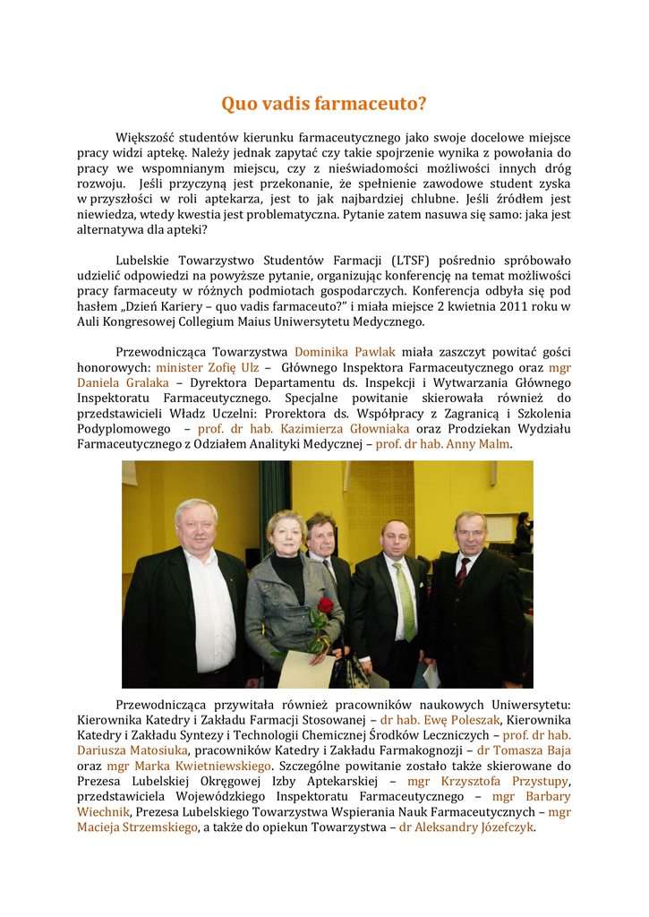 Quo vadis farmaceuto? Większość studentów kierunku farmaceutycznego jako swoje docelowe miejsce pracy widzi aptekę. Należy jednak zapytać czy takie spojrzenie wynika z powołania do pracy we wspomnianym miejscu, czy z nieświadomości możliwości innych dróg rozwoju. Jeśli przyczyną jest przekonanie, że spełnienie zawodowe student zyska w przyszłości w roli aptekarza, jest to jak najbardziej chlubne. Jeśli źródłem jest niewiedza, wtedy kwestia jest problematyczna. Pytanie zatem nasuwa się samo: jaka jest alternatywa dla apteki? Lubelskie Towarzystwo Studentów Farmacji (LTSF) pośrednio spróbowało udzielić odpowiedzi na powyższe pytanie, organizując konferencję na temat możliwości pracy farmaceuty w różnych podmiotach gospodarczych. Konferencja odbyła się pod hasłem „Dzień Kariery – quo vadis farmaceuto?” i miała miejsce 2 kwietnia 2011 roku w Auli Kongresowej Collegium Maius Uniwersytetu Medycznego. Przewodnicząca Towarzystwa Dominika Pawlak miała zaszczyt powitać gości honorowych: minister Zofię Ulz – Głównego Inspektora Farmaceutycznego oraz mgr Daniela Gralaka – Dyrektora Departamentu ds. Inspekcji i Wytwarzania Głównego Inspektoratu Farmaceutycznego. Specjalne powitanie skierowała również do przedstawicieli Władz Uczelni: Prorektora ds. Współpracy z Zagranicą i Szkolenia Podyplomowego – prof. dr hab. Kazimierza Głowniaka oraz Prodziekan Wydziału Farmaceutycznego z Odziałem Analityki Medycznej – prof. dr hab. Anny Malm. Przewodnicząca przywitała również pracowników naukowych Uniwersytetu: Kierownika Katedry i Zakładu Farmacji Stosowanej – dr hab. Ewę Poleszak, Kierownika Katedry i Zakładu Syntezy i Technologii Chemicznej Środków Leczniczych – prof. dr hab. Dariusza Matosiuka, pracowników Katedry i Zakładu Farmakognozji – dr Tomasza Baja oraz mgr Marka Kwietniewskiego. Szczególne powitanie zostało także skierowane do Prezesa Lubelskiej Okręgowej Izby Aptekarskiej – mgr Krzysztofa Przystupy, przedstawiciela Wojewódzkiego Inspektoratu Farmaceutycznego – mgr Barbary Wiechnik, Prezesa Lubelskiego Towarzystwa Wspierania Nauk Farmaceutycznych – mgr Macieja Strzemskiego, a także do opiekun Towarzystwa – dr Aleksandry Józefczyk. Po przemówieniu Przewodniczącej przedstawiono krótką prezentację działalności Lubelskiego Towarzystwa Studentów Farmacji. Następnie głos zabrała Pani Minister. W swoim wystąpieniu, zwróciła uwagę na szeroki wachlarz możliwości pracy, jaki otwiera się przed absolwentem farmacji. Podkreśliła, że farmaceuta to nie tylko aptekarz, ale również urzędnik, osoba wykwalifikowana czy monitor badań klinicznych. Dyrektor Daniel Gralak zaznajomił uczestników konferencji z regulacjami prawnymi związanymi z Dobrą Praktyką Wytwarzania (GMP – z ang. Good Manufacturing Practice) oraz aspektami prawnymi wprowadzenia produktu leczniczego do obrotu, wygłaszając wykład „Wytwarzanie produktów leczniczych na terytorium Wspólnoty Europejskiej”. Kolejną kwestią podjętą na konferencji była ochrona patentowa produktów leczniczych oraz wynalazczych. Zagadnienie zostało przedstawione przez mgr Annę Bełz – Rzecznika Patentowego Uniwersytetu Medycznego w Lublinie. Rzecznik zwróciła uwagę na błędy uniemożliwiające uzyskanie patentu, a często popełniane przez zgłaszających. Mgr Agnieszka Jóźwiak, reprezentująca Herbapol Lublin S.A. przedstawiła z kolei prezentację „Systemy zarządzania jakością w przemyśle”, w której nakreśliła problematykę m.in. kontroli jakości i walidacji leków. Zwróciła uwagę na niewielką liczbę absolwentów farmacji aplikujących do pracy w przemyśle i zachęcała do zmiany tej tendencji. Charakter pracy monitora badań klinicznych (CRA – z ang. Clinical Research Associate) został przedstawiony przez mgr Daniela Cichockiego oraz mgr Pawła Szcześniaka – przedstawicieli Clinical Research Organization, a zarazem założycieli Lubelskiego Towarzystwa Studentów Farmacji. Panowie opisali przykładowy dzień pracy monitora w ośrodku badawczym oraz w biurze, co pozwoliło uczestnikom konferencji lepiej zrozumieć specyfikę tego zawodu. Ostatnim punktem programu było szkolenie „Nie daj się pożeraczom czasu, czyli skuteczne zarządzanie sobą w czasie” przeprowadzone przez mgr Magdalenę Al-Bayati oraz mgr Monikę Kapuścińską z ACP Pharma S.A. Uczestnicy konferencji nie tylko poznali sposoby na efektywne wykorzystanie czasu, ale mogli nowo zdobytą wiedzę zastosować w praktyce. Szkolenie połączone było bowiem z tematycznym konkursem, w którym dla najlepszych przewidziane zostały nagrody, ufundowane przez firmy Florame, L’biotica, Adamed, Doliva oraz Blau Farma. Zamykając konferencję Przewodnicząca Towarzystwa podziękowała sponsorom – Lubelskiej Okręgowej Izbie Aptekarskiej oraz firmie Wrześniak Glassworks Sp. z o.o. – bez których organizacja konferencji nie byłaby możliwa. Wyrazy wdzięczności złożyła również prof. dr hab. Kazimierzowi Głowniakowi oraz dr Tomaszowi Bajowi, którzy udzielili nam merytorycznego wsparcia. Studenci farmacji w trakcie studiów mają możliwość zaznajomienia się jedynie z charakterem pracy w aptece – ogólnodostępnej i szpitalnej. Na temat pracy w innych podmiotach gospodarczych posiadają wiadomości niekonkretne i niezweryfikowane. Konferencja „Dzień Kariery – quo vadis farmaceuto?” była próbą zmiany takiego stanu rzeczy. Opierając się na licznych doniesieniach naszych kolegów i koleżanek, można zaryzykować stwierdzenie, że udaną. Celina Paź