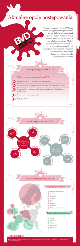 Aktualne opcje postępowania Trwające programy kontroli BVD mają na celu: (i) zapobieganie wprowadzaniu wirusa BVD (w tym szczepionek żywych i inaktywowanych) do stad wolnych od wirusa; (ii) usuwanie ze stad zakażonych zwierząt P.I.; (iii) monitorowanie statusu wirusa BVD w miarę upływu czasu. W Unii Europejskiej stosowano różne programy zwalczania wirusa na poziomie krajowym, regionalnym albo w poszczególnych stadach. Strategie postępowania w UE 1 Podstawy skutecznej strategii zwalczania BVD: 1 Usuwanie zwierząt P.I. ze stad przed szczepieniem 2 Szczepienie musi wywoływać długotrwałą odporność o szerokim spektrum 3 Szczepienie krów musi zapewniać ochronę płodu i musi być bezpieczne podczas ciąży 4 Promowanie bezpiecznego handlu 5 Metody nadzoru Aktualne opcje szczepień w UE Wymag w ca e i n a w St o s o Szczepionki inaktywowan e przed typ m 1 E I N K A T Stoso 2 em 2 em Plany zwalczania wirusa w UE 1 Programy krajowe/regionalne Kraje skandynawskie Austria Holandia Niemcy Szkocja Irlandia Bretania Rzym, Lecco i Como Programy obejmujące pojedyncze stada Anglia Francja Włochy Hiszpania Portugalia Piśmiennictwo u EU Thematic network on control of bovine viral diarrhoea virus (BVDV). BVDV Control QLRT – Sprawozdanie nt. stanowiska, 2001-01573. d typem rze o na r h c O hrona p c O 1 jąca na K A T zed type pr E I N d prze typ o n r a h c O r o h n c a O K A T K A T ypo prz mi Modyfikowan e żywe szczepionki k o r esi m ły a d w a k n a a jąca na NIE iąży ec w e i ca n a w a w d a k n a a ypom i prz E I N iąży ec k o r esi m ły Wymag 1