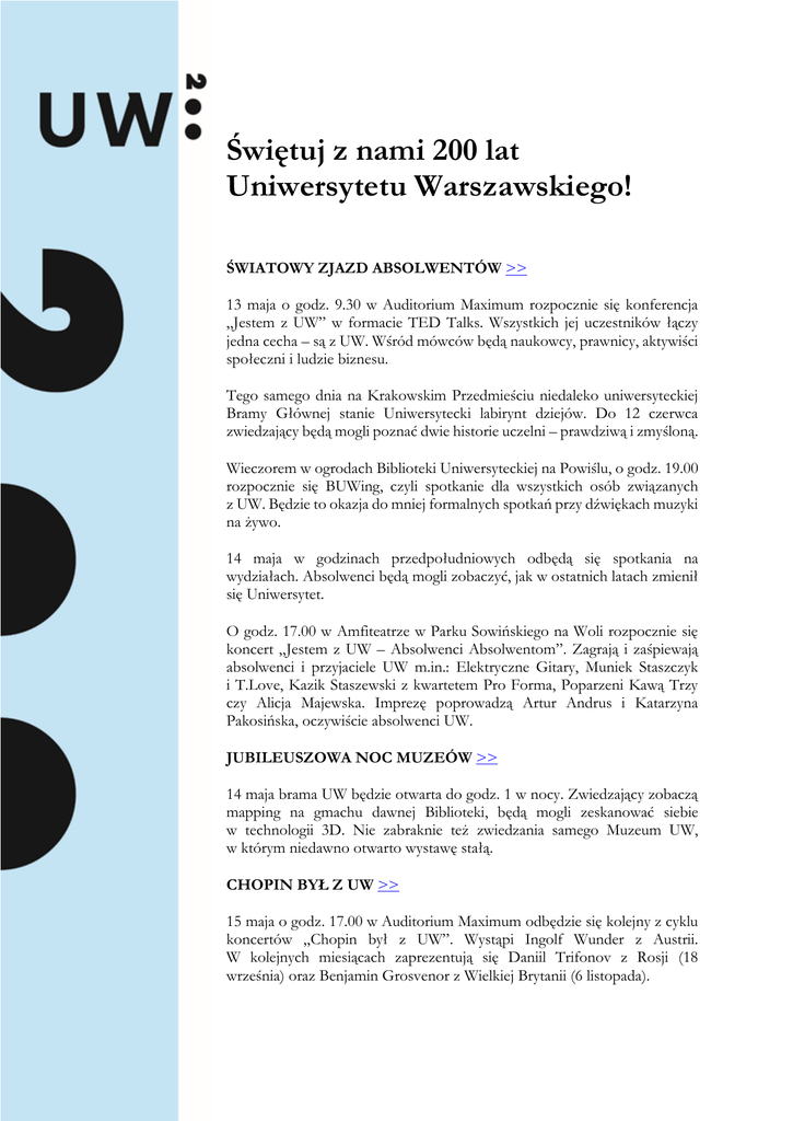 Świętuj z nami 200 lat Uniwersytetu Warszawskiego! ŚWIATOWY ZJAZD ABSOLWENTÓW >> 13 maja o godz. 9.30 w Auditorium Maximum rozpocznie się konferencja „Jestem z UW” w formacie TED Talks. Wszystkich jej uczestników łączy jedna cecha – są z UW. Wśród mówców będą naukowcy, prawnicy, aktywiści społeczni i ludzie biznesu. Tego samego dnia na Krakowskim Przedmieściu niedaleko uniwersyteckiej Bramy Głównej stanie Uniwersytecki labirynt dziejów. Do 12 czerwca zwiedzający będą mogli poznać dwie historie uczelni – prawdziwą i zmyśloną. Wieczorem w ogrodach Biblioteki Uniwersyteckiej na Powiślu, o godz. 19.00 rozpocznie się BUWing, czyli spotkanie dla wszystkich osób związanych z UW. Będzie to okazja do mniej formalnych spotkań przy dźwiękach muzyki na żywo. 14 maja w godzinach przedpołudniowych odbędą się spotkania na wydziałach. Absolwenci będą mogli zobaczyć, jak w ostatnich latach zmienił się Uniwersytet. O godz. 17.00 w Amfiteatrze w Parku Sowińskiego na Woli rozpocznie się koncert „Jestem z UW – Absolwenci Absolwentom”. Zagrają i zaśpiewają absolwenci i przyjaciele UW m.in.: Elektryczne Gitary, Muniek Staszczyk i T.Love, Kazik Staszewski z kwartetem Pro Forma, Poparzeni Kawą Trzy czy Alicja Majewska. Imprezę poprowadzą Artur Andrus i Katarzyna Pakosińska, oczywiście absolwenci UW. JUBILEUSZOWA NOC MUZEÓW >> 14 maja brama UW będzie otwarta do godz. 1 w nocy. Zwiedzający zobaczą mapping na gmachu dawnej Biblioteki, będą mogli zeskanować siebie w technologii 3D. Nie zabraknie też zwiedzania samego Muzeum UW, w którym niedawno otwarto wystawę stałą. CHOPIN BYŁ Z UW >> 15 maja o godz. 17.00 w Auditorium Maximum odbędzie się kolejny z cyklu koncertów „Chopin był z UW”. Wystąpi Ingolf Wunder z Austrii. W kolejnych miesiącach zaprezentują się Daniil Trifonov z Rosji (18 września) oraz Benjamin Grosvenor z Wielkiej Brytanii (6 listopada). REGATY WIOŚLARSKIE >> 4 czerwca o godz. 9.00 na Wiśle pomiędzy mostami Gdańskim i Łazienkowskim rozpoczną się regaty. Odbędą się biegi licealistów oraz w kategorii OPEN. Wystąpi ponad 20 osad. Swoje reprezentacje wystawiły Holandia, Chorwacja, Serbia, Niemcy, Szwecja i Węgry. Wyścig główny, 65. regaty ósemek Uniwersytet Warszawski – Politechnika Warszawska, rozpocznie się o godz. 14. ODKRYJ UW! >> Dwa czerwcowe weekendy na Uniwersytecie upłyną pod hasłem: Odkryj UW!. Najpierw dla wszystkich ciekawych nauki otworzy się kampus główny (4 i 5 czerwca), a dwa tygodnie później kampus Ochota (18 i 19 czerwca). W sobotnie popołudnia można będzie zwiedzić sale wykładowe, laboratoria i galerie. Do późnych godzin nocnych odbywać się będą wykłady popularnonaukowe, debaty i dyskusje prowadzone przez naukowców z UW. Niedziele to czas pikniku i zabawy dla całych rodzin. Będą m.in. pokazy eksperymentów i spacery tematyczne. WEHIKUŁ CZASU >> 11 czerwca od godz. 11.00 kampus główny i część Krakowskiego Przedmieścia zostaną przeniesione do lat 1816-1818, czyli do początków istnienia Uniwersytetu. Uczestnicy będą mogli m.in.: wziąć udział w zebraniu tajnej organizacji niepodległościowej, obejrzeć zdjęcia pokazywane w kosmoramie, nauczyć się tańczyć kadryla, zagrać w historyczną grę planszową albo obejrzeć odtworzony lot balonem. GALOWY KONCERT JUBILEUSZOWY >> 19 listopada w Filharmonii Narodowej, dokładnie w dwusetną rocznicę powstania UW, odbędzie się Galowy Koncert Jubileuszowy. Zaprezentowane zostanie premierowe wykonanie utworu skomponowanego specjalnie na tę okazję przez Pawła Szymańskiego oraz występ laureata Międzynarodowego Konkursu Pianistycznego im. Fryderyka Chopina. Więcej informacji znajduje się na stronie: www.uw200.pl