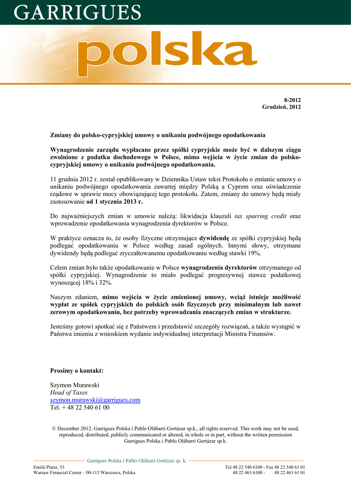 8-2012 Grudzień, 2012 Zmiany do polsko-cypryjskiej umowy o unikaniu podwójnego opodatkowania Wynagrodzenie zarządu wypłacane przez spółki cypryjskie może być w dalszym ciągu zwolnione z podatku dochodowego w Polsce, mimo wejścia w życie zmian do polskocypryjskiej umowy o unikaniu podwójnego opodatkowania. 11 grudnia 2012 r. został opublikowany w Dzienniku Ustaw tekst Protokołu o zmianie umowy o unikaniu podwójnego opodatkowania zawartej między Polską a Cyprem oraz oświadczenie rządowe w sprawie mocy obowiązującej tego protokołu. Zatem, zmiany do umowy będą miały zastosowanie od 1 stycznia 2013 r. Do najważniejszych zmian w umowie należą: likwidacja klauzuli tax sparring credit oraz wprowadzenie opodatkowania wynagrodzenia dyrektorów w Polsce. W praktyce oznacza to, że osoby fizyczne otrzymujące dywidendę ze spółki cypryjskiej będą podlegać opodatkowaniu w Polsce według zasad ogólnych. Innymi słowy, otrzymane dywidendy będą podlegać zryczałtowanemu opodatkowaniu według stawki 19%. Celem zmian było także opodatkowanie w Polsce wynagrodzenia dyrektorów otrzymanego od spółki cypryjskiej. Wynagrodzenie to miało podlegać progresywnej stawce podatkowej wynoszącej 18% i 32%. Naszym zdaniem, mimo wejścia w życie zmienionej umowy, wciąż istnieje możliwość wypłat ze spółek cypryjskich do polskich osób fizycznych przy minimalnym lub nawet zerowym opodatkowaniu, bez potrzeby wprowadzania znaczących zmian w strukturze. Jesteśmy gotowi spotkać się z Państwem i przedstawić szczegóły rozwiązań, a także wystąpić w Państwa imieniu z wnioskiem wydanie indywidualnej interpretacji Ministra Finansów. Prosimy o kontakt: Szymon Murawski Head of Taxes [email protected] Tel. + 48 22 540 61 00 © December 2012. Garrigues Polska i Pablo Olábarri Gortázar sp.k., all rights reserved. This work may not be used, reproduced, distributed, publicly communicated or altered, in whole or in part, without the written permission Garrigues Polska i Pablo Olábarri Gortázar sp.k. Emilii Plater, 53 Warsaw Financial Center – 00-113 Warszawa, Polska Tel 48 22 540 6100 - Fax 48 22 540 61 01 48 22 463 6100 48 22 463 61 01