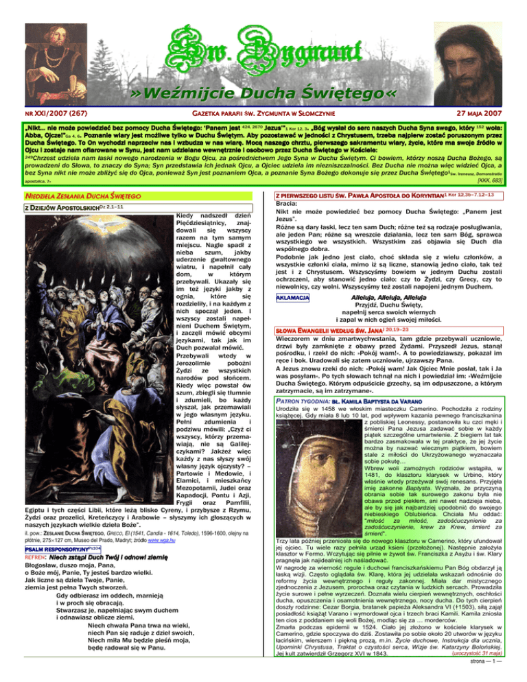 »Weźmijcie Ducha Świętego« NR XXI/2007 (267 267) GAZETKA PARAFII ŚW W. ZYGMUNTA W SŁOMCZYNIE 27 MAJA 2007 „Nikt… nie może powiedzieć bez pomocy Ducha Świętego: ‘Panem jest 424, 2670 Jezus’”1 Kor 12, 3. „Bóg wysłał do serc naszych Ducha Syna swego, który 152 woła: Abba, Ojcze!”Ga 4, 6. Poznanie wiary jest możliwe tylko w Duchu Świętym. Aby pozostawać w jedności z Chrystusem, trzeba najpierw zostać poruszonym przez Ducha Świętego. To On wychodzi naprzeciw nas i wzbudza w nas wiarę. Mocą naszego chrztu, pierwszego sakramentu wiary, życie, które ma swoje źródło w Ojcu i zostaje nam ofiarowane w Synu, jest nam udzielane udzielane wewnętrznie i osobowo przez Ducha Świętego w Kościele: 249Chrzest udziela nam łaski nowego narodzenia w Bogu Ojcu, za pośrednictwem Jego Syna w Duchu Świętym. Ci bowiem, którzy noszą Ducha Bożego, są prowadzeni do Słowa, to znaczy do Syna; Syn przedstawia ich jednak Ojcu, a Ojciec udziela im niezniszczalności. Bez Ducha nie można więc widzieć Ojca, a bez Syna nikt nie może zbliżyć się do Ojca, ponieważ Syn jest poznaniem Ojca, a poznanie Syna Bożego dokonuje się przez Ducha Świętego1św. Ireneusz, Demonstratio [KKK, 683] apostolica, 7. NIEDZIELA ZESŁANIA DUCHA ŚWIĘTEGO Z DZIEJÓW APOSTOLSKICHDz 2,1–11 Kiedy nadszedł dzień Pięćdziesiątnicy, znajdowali się wszyscy razem na tym samym miejscu. Nagle spadł z nieba szum, jakby uderzenie gwałtownego wiatru, i napełnił cały dom, w którym przebywali. Ukazały się im też języki jakby z ognia, które się rozdzieliły, i na każdym z nich spoczął jeden. I wszyscy zostali napełnieni Duchem Świętym, i zaczęli mówić obcymi językami, tak jak im Duch pozwalał mówić. Przebywali wtedy w Jerozolimie pobożni Żydzi ze wszystkich narodów pod słońcem. Kiedy więc powstał ów szum, zbiegli się tłumnie i zdumieli, bo każdy słyszał, jak przemawiali w jego własnym języku. Pełni zdumienia i podziwu mówili: „Czyż ci wszyscy, którzy przemawiają, nie są Galilejczykami? Jakżeż więc każdy z nas słyszy swój własny język ojczysty? – Partowie i Medowie, i Elamici, i mieszkańcy Mezopotamii, Judei oraz Kapadocji, Pontu i Azji, Frygii oraz Pamfilii, Egiptu i tych części Libii, które leżą blisko Cyreny, i przybysze z Rzymu, Żydzi oraz prozelici, Kreteńczycy i Arabowie – słyszymy ich głoszących w naszych językach wielkie dzieła Boże”. il. pow.: ZESŁANIE DUCHA ŚWIĘTEGO, GRECO, El (1541, Candia - 1614, Toledo), 1596-1600, olejny na płótnie, 275×127 cm, Museo del Prado, Madryt; źródło www.wga.hu PSALM RESPONSORYJNYPs104 REFREN: Niech zstąpi Duch Twój i odnowi ziemię Błogosław, duszo moja, Pana, o Boże mój, Panie, Ty jesteś bardzo wielki. Jak liczne są dzieła Twoje, Panie, ziemia jest pełna Twych stworzeń. Gdy odbierasz im oddech, marnieją i w proch się obracają. Stwarzasz je, napełniając swym duchem i odnawiasz oblicze ziemi. Niech chwała Pana trwa na wieki, niech Pan się raduje z dzieł swoich, Niech miła Mu będzie pieśń moja, będę radował się w Panu. Z PIERWSZEGO LISTU ŚW. PAWŁA APOSTOŁA DO KORYNTIAN1 Kor 12,3b–7.12–13 Bracia: Nikt nie może powiedzieć bez pomocy Ducha Świętego: „Panem jest Jezus”. Różne są dary łaski, lecz ten sam Duch; różne też są rodzaje posługiwania, ale jeden Pan; różne są wreszcie działania, lecz ten sam Bóg, sprawca wszystkiego we wszystkich. Wszystkim zaś objawia się Duch dla wspólnego dobra. Podobnie jak jedno jest ciało, choć składa się z wielu członków, a wszystkie członki ciała, mimo iż są liczne, stanowią jedno ciało, tak też jest i z Chrystusem. Wszyscyśmy bowiem w jednym Duchu zostali ochrzczeni, aby stanowić jedno ciało: czy to Żydzi, czy Grecy, czy to niewolnicy, czy wolni. Wszyscyśmy też zostali napojeni jednym Duchem. AKLAMACJA Alleluja, Alleluja, Alleluja Przyjdź, Duchu Święty, napełnij serca swoich wiernych i zapal w nich ogień swojej miłości. SŁOWA EWANGELII WEDŁUG ŚW. JANAJ 20,19–23 Wieczorem w dniu zmartwychwstania, tam gdzie przebywali uczniowie, drzwi były zamknięte z obawy przed Żydami. Przyszedł Jezus, stanął pośrodku, i rzekł do nich: »Pokój wam!«. A to powiedziawszy, pokazał im ręce i bok. Uradowali się zatem uczniowie, ujrzawszy Pana. A Jezus znowu rzeki do nich: »Pokój wam! Jak Ojciec Mnie posłał, tak i Ja was posyłam«. Po tych słowach tchnął na nich i powiedział im: »Weźmijcie Ducha Świętego. Którym odpuścicie grzechy, są im odpuszczone, a którym zatrzymacie, są im zatrzymane«. PATRON TYGODNIA: BŁ. KAMILA BAPTYS APTYST TYSTA DA VARANO Urodziła się w 1458 we włoskim miasteczku Camerino. Pochodziła z rodziny książęcej. Gdy miała 8 lub 10 lat, pod wpływem kazania pewnego franciszkanina z pobliskiej Leonessy, postanowiła ku czci męki i śmierci Pana Jezusa zadawać sobie w każdy piątek szczególne umartwienie. Z biegiem lat tak bardzo zasmakowała w tej praktyce, że jej życie można by nazwać wiecznym piątkiem, bowiem stale z miłości do Ukrzyżowanego wyznaczała sobie pokutę… Wbrew woli zamożnych rodziców wstąpiła, w 1481, do klasztoru klarysek w Urbino, który właśnie wtedy przeżywał swój renesans. Przyjęła imię zakonne Baptysta. Wyznała, że przyczyną obrania sobie tak surowego zakonu była nie obawa przed piekłem, ani nawet nadzieja nieba, ale by się jak najbardziej upodobnić do swojego niebieskiego Oblubieńca. Chciała Mu oddać: "miłość za miłość, zadośćuczynienie za zadośćuczynienie, krew za Krew, śmierć za śmierć". Trzy lata później przeniosła się do nowego klasztoru w Camerino, który ufundował jej ojciec. Tu wiele razy pełniła urząd ksieni (przełożonej). Następnie założyła klasztor w Fermo. Wczytując się pilnie w żywot św. Franciszka z Asyżu i św. Klary pragnęła jak najidealniej ich naśladować. W nagrodę za wierność regule i duchowi franciszka