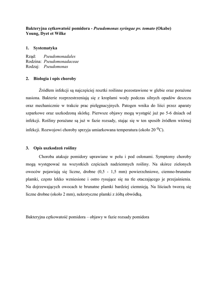 Bakteryjna cętkowatość pomidora - Pseudomonas syringae pv. tomato (Okabe) Young, Dyet et Wilke 1. Systematyka Rząd: Pseudomonadales Rodzina: Pseudomonadaceae Rodzaj: Pseudomonas 2. Biologia i opis choroby Źródłem infekcji są najczęściej resztki roślinne pozostawione w glebie oraz porażone nasiona. Bakterie rozprzestrzeniają się z kroplami wody podczas silnych opadów deszczu oraz mechanicznie w trakcie prac pielęgnacyjnych. Patogen wnika do liści przez aparaty szparkowe oraz uszkodzoną skórkę. Pierwsze objawy mogą wystąpić już po 5-6 dniach od infekcji. Rośliny porażane są już w fazie rozsady, stając się w ten sposób źródłem wtórnej infekcji. Rozwojowi choroby sprzyja umiarkowana temperatura (około 20 oC). 3. Opis uszkodzeń rośliny Choroba atakuje pomidory uprawiane w polu i pod osłonami. Symptomy choroby mogą występować na wszystkich częściach nadziemnych rośliny. Na skórce zielonych owoców pojawiają się liczne, drobne (0,5 - 1,5 mm) powierzchniowe, ciemno-brunatne plamki, często lekko wzniesione i ostro rysujące się na tle otaczającego je przejaśnienia. Na dojrzewających owocach te brunatne plamki bardziej ciemnieją. Na liściach tworzą się liczne drobne (około 2 mm), nekrotyczne plamki z żółtą obwódką. Bakteryjna cętkowatość pomidora – objawy w fazie rozsady pomidora Bakteryjna cętkowatość pomidora – objawy na liściach Bakteryjna cętkowatość pomidora – objawy na łodydze Bakteryjna cętkowatość pomidora – objawy na owocach 4. Metodyka wykonania obserwacji Od fazy rozwojowej (skala BBCH 1/19) mogą być widoczne pierwsze objawy choroby na liściach i łodydze w postaci ciemnych plamistości. Choroba może wystąpić we wszystkich fazach rozwojowych roślin i trwać aż do końca zbiorów. Obserwacje nasilenia choroby należy rozpocząć z chwilą wystąpienia pierwszych objawów choroby na poszczególnych częściach roślin i kontynuować aż do końca zbiorów owoców, oceniając stopień nasilenia choroby na podstawie procentu porażonej powierzchni liści, pędów i owoców. Ocenę porażenia wykonać w 4-5 miejscach na plantacji na próbie 50 liści, pędów lub owoców, stosując 6-stopniową skalę: 0 – brak objawów choroby 1 – 1-3 plamy na liściu (pierwsze objawy chorobowe na roślinie – 1%) 2 – 4-10 plam na liściu (porażenie od 1% do 6%) 3 – 11-25 plam na liściu (porażenie od 6% do 20%) 4 – 26-50 plam na liściu (porażenie od 20% do 50%) 5 – >50 plam na liściu (porażenie powyżej 50%) 5. Próg zagrożenia i terminy zabiegów Nasilenie choroby zależy od warunków uprawy, podatności odmian i stopnia zasiedlenia nasion przez sprawcę choroby. Większość uprawianych odmian pomidorów w polu i pod osłonami wykazuje podatność na tą chorobę i wymaga profilaktycznej ochrony chemicznej. Zabiegiem ograniczającym źródło infekcji jest odkażanie podłoża do uprawy, pomieszczeń i sprzętu używanego do produkcji rozsady. Zaleca się stosować 3-4 letnią przerwą w uprawie roślin psiankowatych. Wysiewać zdrowe i odkażone nasiona. Nie prowadzić prac pielęgnacyjnych gdy rośliny są mokre lub pokryte rosą. Stosować profilaktyczne opryskiwanie roślin od fazy wzrostu roślin (skala BBCH 2/22). 6. Ocena szkodliwości Choroba jest groźna we wszystkich fazach rozwojowych pomidorów (skala BBCH 1/19), jednak największa szkodliwość występuje w okresie dojrzewania owoców pomidora (skala BBCH 8/81-89). Owoce z plamami są dyskwalifikowane jako surowiec dla przetwórstwa.