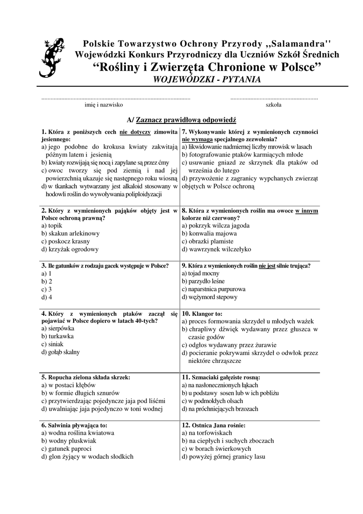 Polskie Towarzystwo Ochrony Przyrody ,,Salamandra'' Wojewódzki Konkurs Przyrodniczy dla Uczniów Szkół Średnich “Rośliny i Zwierzęta Chronione w Polsce” WOJEWÓDZKI - PYTANIA ................................................................................................. imię i nazwisko ......................................................... szkoła A/ Zaznacz prawidłową odpowiedź 1. Która z poniższych cech nie dotyczy zimowita 7. Wykonywanie której z wymienionych czynności jesiennego: nie wymaga specjalnego zezwolenia? a) jego podobne do krokusa kwiaty zakwitają późnym latem i jesienią b) kwiaty rozwijają się nocą i zapylane są przez ćmy c) owoc tworzy się pod ziemią i nad jej powierzchnią ukazuje się następnego roku wiosną d) w tkankach wytwarzany jest alkaloid stosowany w hodowli roślin do wywoływania poliploidyzacji a) likwidowanie nadmiernej liczby mrowisk w lasach b) fotografowanie ptaków karmiących młode c) usuwanie gniazd ze skrzynek dla ptaków od września do lutego d) przywożenie z zagranicy wypchanych zwierząt objętych w Polsce ochroną 2. Który z wymienionych pająków objęty jest w 8. Która z wymienionych roślin ma owoce w innym Polsce ochroną prawną? kolorze niż czerwony? a) topik b) skakun arlekinowy c) poskocz krasny d) krzyżak ogrodowy a) pokrzyk wilcza jagoda b) konwalia majowa c) obrazki plamiste d) wawrzynek wilczełyko 3. Ile gatunków z rodzaju gacek występuje w Polsce? a) 1 b) 2 c) 3 d) 4 9. Która z wymienionych roślin nie jest silnie trująca? a) tojad mocny b) parzydło leśne c) naparstnica purpurowa d) wężymord stepowy 4. Który z wymienionych ptaków zaczął się 10. Klangor to: pojawiać w Polsce dopiero w latach 40-tych? a) proces formowania skrzydeł u młodych ważek a) sierpówka b) chrapliwy dźwięk wydawany przez głuszca w b) turkawka czasie godów c) siniak c) odgłos wydawany przez żurawie d) gołąb skalny d) pocieranie pokrywami skrzydeł o odwłok przez niektóre chrząszcze 5. Ropucha zielona składa skrzek: a) w postaci kłębów b) w formie długich sznurów c) przytwierdzając pojedyncze jaja pod liśćmi d) uwalniając jaja pojedynczo w toni wodnej 11. Szmaciaki gałęziste rosną: a) na nasłonecznionych łąkach b) u podstawy sosen lub w ich pobliżu c) w podmokłych olsach d) na próchniejących brzozach 6. Salwinia pływająca to: a) wodna roślina kwiatowa b) wodny pluskwiak c) gatunek paproci d) glon żyjący w wodach słodkich 12. Ostnica Jana rośnie: a) na torfowiskach b) na ciepłych i suchych zboczach c) w borach świerkowych d) powyżej górnej granicy lasu 13. Tarczownicowate to rodzina: a) drapieżnych chrząszczy b) roślinożernych pluskwiaków c) listkowatych porostów d) roślin o dużych, pływających liściach 15. Który z wymienionych dzięciołów jest w naszym kraju bardzo rzadki i figuruje w “Polskiej Czerwonej Księdze Zwierząt”? a) dzięcioł zielony b) dzięciołek c) dzięcioł białogrzbiety d) dzięcioł czarny 14. Który z wymienionych ptaków nadziewa 16. Który z wymienionych gadów chętnie żywi się nadmiar upolowanej zdobyczy na ciernie? nietoperzami? a) kulczyk b) gąsiorek c) piecuszek d) potrzos a) gniewosz plamisty b) padalec zwyczajny c) wąż Eskulapa d) żaden z polskich gadów nie zjada nietoperzy B/ Oceń prawdziwość zdań 17. Młode jeże pozbawione są kolców, dzięki czemu w 20. Niepylak apollo występuje w naszym kraju w czasie porodu nie uszkadzają dróg rodnych matki. Pieninach i w Tatrach. TAK NIE TAK NIE 18. Przez Polskę przebiega zachodnia granica 21. Szarotka alpejska to gatunek objęty w Polsce występowania słowika rdzawego. częściową ochroną prawną. TAK NIE 19. Kokoszka to inaczej kurka wodna. TAK TAK NIE 22. Gnidosz królewski to niejadowity wąż żywiący się głównie jaszczurkami. NIE TAK NIE C/ Odpowiedz na pytania 23. Samicę cieciorką? jakiego gatunku ptaka nazywamy 26. Do jakiej rodziny ssaków należy świstak? ........................................................................................ ........................................................................................ 24. Jakiego koloru są kwiaty pełnika europejskiego? 27. Który z żyjących jajożyworodny? w Polsce płazów jest ........................................................................................ ........................................................................................ 25. Wymień występujących w Polsce dzikich 28. Podaj nazwę gatunkową krzewu rosnącego w przedstawicieli rodziny kotowatych. podmokłych lasach i na torfowiskach, którego gałązki wykorzystywane są do odstraszania moli? ........................................................................................ ........................................................................................ D/ Podaj pełną nazwę gatunkową przedstawionych poniżej organizmów 29. .............................................. 30. 31. ............................................... ...............................................