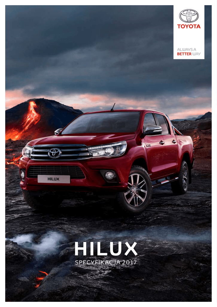 HILUX SPECYFIK ACJA 2017 CENY BRUTTO (PLN) Cennik obowiązuje od 1 lutego 2017 r. Pojedyncza kabina DL DLX SR SR5 109 347 – – – 124 107 – – 2,4 D-4D (150 KM) 6 M/T (4x2) diesel (88 900 netto) 2,4 D-4D (150 KM) 6 M/T (4x4) diesel – Półtorej kabiny DL DLX SR SR5 116 727 – – – 143 787 – 2,4 D-4D (150 KM) 6 M/T (4x2) diesel (94 900 netto) 2,4 D-4D (150 KM) 6 M/T (4x4) diesel – Podwójna kabina 2,4 D-4D (150 KM) 6 M/T (4x4) diesel 3 900 131 487 (106 900 netto) DL DLX SR SR5 137 637 149 937 154 980 (111 900 netto) – – Lakier perłowy 4 500 Dla Ciebie od • * Wysokość wpłaty własnej. od (116 900 netto) 135 177 (109 900 netto) 2,4 D-4D (150 KM) 6 A/T (4x4) diesel Lakier metalik (100 900 netto) 1 742 zł/mc 10% 1 621 zł/mc 30% NAJCZĘŚCIEJ WYBIERANA WERSJA: Podwójna kabina 2,4 D-4D (150 KM) 6 A/T (4x4) SR5 1.Wytrzymały i dynamiczny silnik 2,4 D-4D (150 KM) 6 A/T (4x4) diesel. 154 931 (125 960 netto) (126 000 netto) 159 974 (130 060 netto) Nawigacja Toyota Touch 2 with Go 3 200 Dla Twojej firmy * * (121 900 netto) od • zł/mc 1 294 netto 763 netto zł/mc od 10%* 30%* Zapytaj w salonie o specjalną ofertę 2. Automatyczna skrzynia biegów. 3.Bogate wyposażenie w standardzie, m.in. klimatyzacja automatyczna, Toyota Safety Sense, lampy przednie typu LED z funkcją autopoziomowania, tempomat, Toyota Touch 2 z kamerą cofania. Pakiety dodatkowe PAKIET INVINCIBLE 9 600 PLN – Orurowanie boczne ze stopniami – Orurowanie przestrzeni ładunkowej – Okleina na tylnej klapie przestrzeni ładunkowej „HILUX” – Skórzany mieszek dźwigni zmiany biegów – Tapicerka skórzana Expert czarna Orurowanie zawarte w pakiecie występuje samodzielnie i nie łączy się z zabudowami przestrzeni ładunkowej. PAKIET INVINCIBLE+ 15 700 PLN Element dodatkowy względem Pakietu Invincible: – Roleta aluminiowa przestrzeni ładunkowej Pakiet Invincible+ zawiera aluminiową roletę oraz dedykowane do niej orurowanie. Pakiety dostępne w wersji SR5. PAKIET SAFETY 2 000 PLN – Układ wczesnego reagowania w razie ryzyka zderzenia (PCS) z systemem wykrywania pieszych (PD) – Układ ostrzegania o niezamierzonej zmianie pasa ruchu (LDA) – Układ wykrywania zmęczenia kierowcy (SWS) Dostępny w wersjach DL i DLX. Pakiet Safety w wersji DLX wymaga wybrania tempomatu. Pojedyncza kabina Opcje Półtorej kabiny Podwójna kabina DL DLX DL DLX SR DL DLX SR SR5 Pakiet Style: zderzak przedni w kolorze nadwozia, przednie lampy przeciwmgielne, kołpaki plastikowe na koła 17" – – – – – – 2 300 PLN – – Nawigacja Toyota Touch 2 with Go – – – – 3 200 PLN – – Tempomat – 900 PLN – 900 PLN – – 900 PLN – – Tapicerka skórzana – – – – – – – – 5 000 PLN 860 PLN 860 PLN 860 PLN 860 PLN 860 PLN 860 PLN 860 PLN 860 PLN 860 PLN Czujniki parkowania z tyłu Czujniki parkowania z przodu i z tyłu Progi aluminiowe 1 1 3 200 PLN 3 200 PLN 1 1 700 PLN 1 700 PLN 1 700 PLN 1 700 PLN 1 700 PLN 1 700 PLN 1 700 PLN 1 700 PLN 1 700 PLN – – Elektroniczny system zabezpieczenia antykradzieżowego komputera i złącza diagnostycznego2 990 PLN 990 PLN 990 PLN 990 PLN 990 PLN 990 PLN 990 PLN 990 PLN 990 PLN Rozszerzenie zabezpieczenia pojazdu o elektroniczny system antykradzieżowy: ochrony wnętrza, dźwiękowej sygnalizacji włamania oraz identyfikację kierowcy poprzez kartę PROXY w przypadku kradzieży kluczyków samochodu3 880 PLN 880 PLN 880 PLN 880 PLN 880 PLN 880 PLN 880 PLN 880 PLN 880 PLN 2 000 PLN 2 000 PLN 2 000 PLN 2 000 PLN 2 000 PLN 2 000 PLN 2 000 PLN 1 Tempomat wymaga wybrania Pakietu Safety. 2 Bezobsługowy system renomowanej firmy Cobra AT, światowego lidera w branży samochodowych zabezpieczeń elektronicznych. Koszt brutto z montażem w ASD. 3 Klasa skuteczności PIMOT: profesjonalna. Koszt brutto z montażem w ASD. WYPOSAŻENIE Pojedyncza kabina Bezpieczeństwo Półtorej kabiny Podwójna kabina DL DLX DL DLX SR DL DLX SR – – – – – – – – – – – – – – – – Układ wczesnego reagowania w razie ryzyka zderzenia (PCS) z systemem wykrywania pieszych (PD) Safety Safety1 Safety Safety1 Safety Safety1 Układ wykrywania zmęczenia kierowcy (SWS) Safety Safety1 Safety Safety1 Safety Safety1 Układ ostrzegania o niezamierzonej zmianie pasa ruchu (LDA) Safety Safety1 Safety Safety1 Safety Safety1 SR5 7 poduszek powietrznych ABS, VSC System stabilizujący tor jazdy przyczepy TSC System wspomagający ruszanie na wzniesieniu (Hill Start Assist) Lampy przednie halogenowe – Lampy przednie typu LED z funkcją autopoziomowania Immobilizer Automatyczny wył. poduszki powietrznej pasażera Światła do jazdy dziennej halogenowe – Światła do jazdy dziennej typu LED Układ rozpoznawania znaków drogowych (RSA) – – – – – – Tempomat – Opcja2 – Opcja2 – Opcja2 Przednie lampy przeciwmgielne – – – – – Style ISOFIX na tylnych skrajnych siedzeniach – – – – System wspomagający zjazd ze wzniesienia (DAC) – – – – – – 1 – Pakiet Safety wymaga wybrania tempomatu. 2 Tempomat wymaga wybrania Pakietu Safety. Toyota Safety Sense Układ wczesnego reagowania w razie ryzyka zderzenia (PCS) z systemem wykrywania pieszych (PD) Układ ostrzegania o niezamierzonej zmianie pasa ruchu (LDA) System wykrywa niebezpieczeństwo zderzenia, wysyła dźwiękowe i wizualne ostrzeżenia, a w razie braku reakcji kierowcy zmniejsza prędkość jazdy lub rozpoczyna awaryjne hamowanie. Podczas jazdy poniżej 30 km/h dodatkowo wykrywa także ruch pieszych znajdujących się na jezdni. System określa położenie linii na jezdni i w przypadku przekroczenia ich bez użycia kierunkowskazu emituje ostrzeżenia dźwiękowe i wizualne na ekranie TFT. Układ rozpoznawania znaków drogowych (RSA) Układ wykrywania zmęczenia kierowcy (SWS) System wysyła sygnały dźwiękowe i wyświetla na ekranie TFT informacje o mijanych ograniczeniach prędkości i wybranych znakach drogowych, a także ostrzega o warunkach pogodowych. 