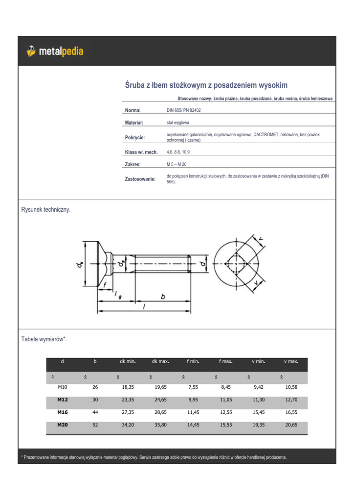 Śruba z łbem stożkowym z posadzeniem wysokim Stosowane nazwy: śruba płużna, śruba posadzana, śruba nośna, śruba lemieszowa Norma: DIN 605/ PN 82402 Materiał: stal węglowa Pokrycie: ocynkowane galwanicznie, ocynkowane ogniowo, DACTROMET, niklowane, bez powłoki ochronnej ( czarne) Klasa wł. mech. 4.6, 8.8, 10.9 Zakres: M 5 – M 20 Zastosowanie: do połączeń konstrukcji stalowych, do zastosowania w zestawie z nakrętką sześciokątną (DIN 555). Rysunek techniczny. Tabela wymiarów*. v max. ›› v min. ›› f max. ›› f min. ›› dk max. ›› dk min. ›› b ›› ›› d M10 26 18,35 19,65 7,55 8,45 9,42 10,58 M12 30 23,35 24,65 9,95 11,05 11,30 12,70 M16 44 27,35 28,65 11,45 12,55 15,45 16,55 M20 52 34,20 35,80 14,45 15,55 19,35 20,65 * Prezentowane informacje stanowią wyłącznie materiał poglądowy. Serwis zastrzega sobie prawo do wystąpienia różnic w ofercie handlowej producenta.
