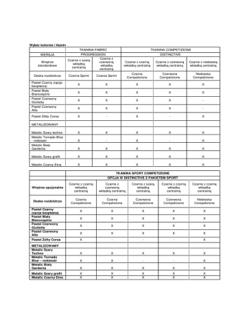 Wybór kolorów i tkanin TKANINA FABRIC WERSJA Wnętrze standardowe TKANINA COMPETIZIONE PROGRESSION Czarne z Czarne z szarą czerwoną wkładką wkładką centralną centralną DISTINCTIVE Czarne z czarną wkładką centralną Czarne z czerwoną wkładką centralną Czarne z niebieską wkładką centralną Czarna Sprint Czarna Sprint Czarna Competizione Czerwona Competizione Niebieska Competizione X X X X X X X X X X X X X X - X X X X - X - X - X Metalic Szary techno Metalic Tornado Blue - niebieski Metalic Biały Gardenia X X X X X X - X - X X X X X X Metalic Szary grafit X X X X X Metalic Czarny Etna X X X X X Deska rozdzielcza Pastel Czarny (opcja bezpłatna) Pastel Biały Biancospino Pastel Czerwony Giulietta Pastel Czerwony Alfa Pastel Żółty Corsa METALIZOWANY TKANINA SPORT COMPETIZIONE OPCJA W DISTINCTIVE Z PAKIETEM SPORT Wnętrze opcjonalne Czarne z czarną wkładką centralną Czarne z czerwoną wkładką centralną Czarne z szarą wkładką centralną Czarne z czarną wkładką centralną Czarne z czarną wkładką centralną Deska rozdzielcza Czarna Competizione Czarna Competizione Czerwona Competizione Czerwona Competizione Niebieska Competizione X X X X X X X X X X X X X X X X X X X X X - - - X X X X X X X X - - X X X X X X X X X X X X X X X X Pastel Czarny (opcja bezpłatna) Pastel BIały Biancospino Pastel Czerwony Giulietta Pastel Czerwony Alfa Pastel Żółty Corsa METALIZOWANY Metalic Szary Techno Metalic Tornado Blue – niebieski Metalic Biały Gardenia Metalic Szary grafit Metalic Czarny Etna TAPICERKA SKÓRZANA PROGRESSION Wnętrza opcjonalne Siedzeni e czarne skórzane Siedze nie skórza ne czerwo ne Deska rozdzielcza Czarna Sprint Czarna Sprint Czarna Sprint Czerwo na Sprint Czarna Sprint X X X X X X X X X X X X X X X X X X X X X - X - - X X X X X X - X - - X X X X X X X X X X X X X X X Pastel Czarny (opcja bezpłatna) Pastel Biały Biancospino Pastel Czerwony Giulietta Pastel Czerwony Alfa Pastel Żółty Corsa Metalic Szary Techno Metalic Tornado Blue – niebieski Metalic Biały Gardenia Metalic Szary grafit Metalic Czarny Etna Siedze nie z natural nej skóry Siedze nie z czarnej skóry Siedze nie z czerwo nej skóry TAPICERKA SKÓRZANA DISTINCTIVE Wnętrza opcjonalne Siedzenie skórzane czarne Deska rozdzielcza Pastel Czarny (opcja bezpłatna) Pastel Biały Biancospino Pastel Czerwony Giulietta Pastel Czerwony Alfa Pastel Żółty Corsa Metalic Szary Techno Metalic Tornado Blue – niebieski Metalic Biały Gardenia Siedzenie skórzane czerwone Siedzenie z naturalnej skóry Czarna Competizione Siedzenie z czarnej skóry Siedzenie skórzane czarne Czerwona Competizione Niebieska Competizione X X X X X X X X X X X X X X X X X X X X X - X - X X X X X X X - X - X X X X X X Szary Grafit X X X X X Metalic Czarny Etna X X X X X