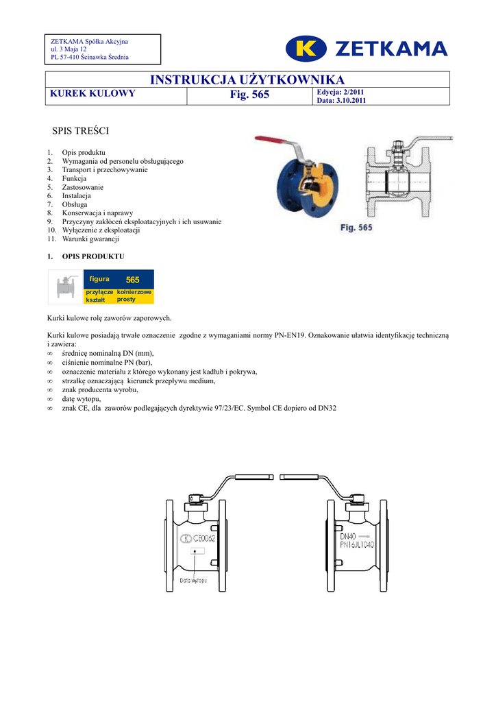 ZETKAMA Spółka Akcyjna ul. 3 Maja 12 PL 57-410 Ścinawka Średnia INSTRUKCJA UŻYTKOWNIKA KUREK KULOWY Fig. 565 Edycja: 2/2011 Data: 3.10.2011 SPIS TREŚCI 1. 2. 3. 4. 5. 6. 7. 8. 9. 10. 11. Opis produktu Wymagania od personelu obsługującego Transport i przechowywanie Funkcja Zastosowanie Instalacja Obsługa Konserwacja i naprawy Przyczyny zakłóceń eksploatacyjnych i ich usuwanie Wyłączenie z eksploatacji Warunki gwarancji 1. OPIS PRODUKTU figura 565 przyłącze kołnierzowe prosty kształt Kurki kulowe rolę zaworów zaporowych. Kurki kulowe posiadają trwałe oznaczenie zgodne z wymaganiami normy PN-EN19. Oznakowanie ułatwia identyfikację techniczną i zawiera: • średnicę nominalną DN (mm), • ciśnienie nominalne PN (bar), • oznaczenie materiału z którego wykonany jest kadłub i pokrywa, • strzałkę oznaczającą kierunek przepływu medium, • znak producenta wyrobu, • datę wytopu, • znak CE, dla zaworów podlegających dyrektywie 97/23/EC. Symbol CE dopiero od DN32 2. WYMAGANIA OD PERSONELU OBSŁUGUJĄCEGO Personel skierowany do prac montażowych, konserwacyjnych i eksploatacyjnych powinien posiadać kwalifikacje do wykonywania tych prac. W przypadku zastosowania napędów mechanicznych należy przestrzegać Instrukcji eksploatacji napędów. 3. TRANSPORT I PRZECHOWYWANIE Transport i przechowywanie powinien odbywać się w temperaturze –200 do 650C, a kurki należy zabezpieczyć przed działaniem sił zewnętrznych i zniszczeniem powłoki malarskiej. Powłoka malarska ma na celu ochronę kurków przed korozją podczas transportu i składowania. Kurki należy przechowywać w pomieszczeniach wolnych od zanieczyszczeń i zabezpieczonych przed wpływami atmosferycznymi. W pomieszczeniach wilgotnych należy stosować środek wysuszający lub ogrzewanie aby zapobiec tworzeniu się skroplin. Kurki należy transportować w taki sposób by nie uszkodzić dźwigni służącej do zamykania i otwierania przepływu oraz trzpienia kurka. Niedopuszczalne jest mocowanie urządzeń dźwigowych za otwory przyłączeniowe. 4. FUNKCJA Kurki kulowe służą do odcinania przepływającego czynnika i przewidziane są do pracy w jednym z następujących położeń: kurek całkowicie otwarty lub całkowicie zamknięty. Nie należy używać kurków w charakterze armatury dławiącej. Ciśnienie robocze należy dostosować do maksymalnej temperatury czynnika, zgodnie z poniższą tabelą. Wg EN 1092-2 Temperatura [º C] Materiał PN -10 do 120 150 EN-GJL250 10 10 bar 9 bar 16 16 bar 14,4 bar 5. ZASTOSOWANIE - instalacje wody gorącej i zimnej , chłodzącej , glikoli, powietrza - technologie przemysłowe, ciepłownictwo, chłodnictwo, klimatyzacja przemysłowa 6. INSTALACJA Przy montażu kurków należy przestrzegać następujących zasad: przed montażem należy ocenić czy kurki nie zostały uszkodzone w czasie transportu lub przechowywania, należy upewnić się, że zastosowane kurki są właściwe dla eksploatacyjnych parametrów i mediów w danej instalacji, zdjąć zaślepki jeżeli kurki są w nie wyposażone, - przy pracach spawalniczych należy zabezpieczyć kurki przed odpryskami, a użyte tworzywa przed nadmierną temperaturą, rurociąg do którego montuje się kurki należy tak ułożyć i zamontować, by kadłub kurka nie przenosił momentów gnących oraz nie był rozciągany połączenia śrubowe na rurociągu nie mogą wprowadzać dodatkowych naprężeń wytrzymałościowych wynikających z nadmiernego ich dokręcenia, a rodzaj materiałów części złącznych musi być dostosowany do parametrów roboczych instalacji, podczas malowania rurociągu należy chronić trzpień zaworu, zawory mogą być montowane w dowolnym położeniu, zalecane położenie kurka dźwignią sterującą do góry, zaś w kurkach z napędem – napędem do góry należy zwracać uwagę na kierunek przepływu czynnika, zaznaczony strzałką na kadłubie, przed uruchomieniem instalacji, a w szczególności po przeprowadzonych naprawach należy przepłukać system przewodów przy całkowicie otwartym kurku, aby usunąć szkodliwe dla powierzchni uszczelniających ciała stałe lub odpryski ze spawania, zamontowanie filtra przed kurkiem zwiększa pewność jego poprawnego funkcjonowania. 7. OBSŁUGA Podczas obsługi należy przestrzegać następujących zasad: proces uruchomienia – włączenia do ruchu należy prowadzić w sposób eliminujący występowanie nagłych zmian temperatury i ciśnienia, kurek jest zamykany poprzez obrót w prawo, patrząc z góry na dźwignię sterującą .Ułożenie dźwigni wzdłuż osi kurka wskazuje że kurek jest otwarty. Zamknięcie następuje przez obrót o 90º.Przestawiając dźwignię ze stanu otwarty w zamknięty i odwrotnie należy pamiętać że ograniczniki obrotu mają określoną wytrzymałość , której nie należy przekraczać. - - otwarcie następuje przy obrocie w lewo, działanie zamontowanych kurków można sprawdzić poprzez wielokrotne otwieranie i zamykanie, nie wolno dopuszczać do przekroczenia maksymalnej dopuszczalnej temperatury pracy kurka gdyż prowadzi to do szybkiej utraty szczelności na trzpieniu i powoduje konieczność wyłączenia kurka z eksploatacji i dokonania wymiany uszczelnień. Jeżeli podczas pracy kurków gorące części kurka, np. pokrętło, lub kadłub mogą spowodować oparzenie, to użytkownik jest zobowiązany do zabezpieczenia ich przed dotknięciem, dla zapewnienia bezpiecznej eksploatacji każdy kurek, a szczególnie ten który jest rzadko uruchamiany powinien być regularnie kontrolowany, - po zamontowaniu kurka z napędem , przy obsłudze należy kierować się również wytycznymi instrukcji dołączonej do napędu, - w przypadku zaniku prądu w sieci zasilającej siłownik , możliwe jest awaryjne sterowanie kurkiem poprzez pokrętło zamontowane na siłowniku, - podczas malowania rurociągu należy chronić elementy napędu. 8. KONSERWACJA i NAPRAWA Wszelkie czynności konserwacyjne i naprawcze po