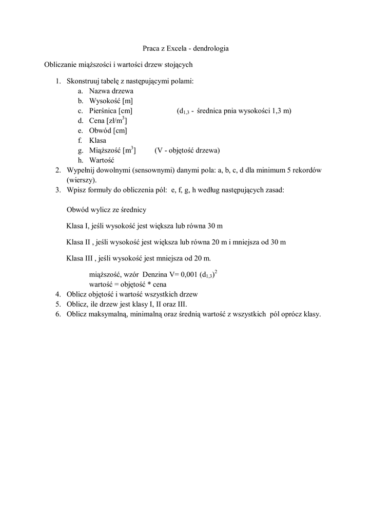 Praca z Excela - dendrologia Obliczanie miąższości i wartości drzew stojących 1. Skonstruuj tabelę z następującymi polami: a. Nazwa drzewa b. Wysokość [m] c. Pierśnica [cm] (d1,3 - średnica pnia wysokości 1,3 m) 3 d. Cena [zł/m ] e. Obwód [cm] f. Klasa g. Miąższość [m3] (V - objętość drzewa) h. Wartość 2. Wypełnij dowolnymi (sensownymi) danymi pola: a, b, c, d dla minimum 5 rekordów (wierszy). 3. Wpisz formuły do obliczenia pól: e, f, g, h według następujących zasad: Obwód wylicz ze średnicy Klasa I, jeśli wysokość jest większa lub równa 30 m Klasa II , jeśli wysokość jest większa lub równa 20 m i mniejsza od 30 m Klasa III , jeśli wysokość jest mniejsza od 20 m. miąższość, wzór Denzina V= 0,001 (d1,3)2 wartość = objętość * cena 4. Oblicz objętość i wartość wszystkich drzew 5. Oblicz, ile drzew jest klasy I, II oraz III. 6. Oblicz maksymalną, minimalną oraz średnią wartość z wszystkich pól oprócz klasy.