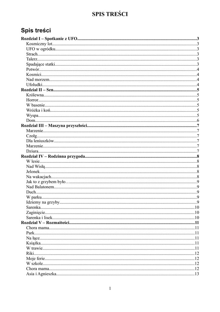 SPIS TREŚCI Spis treści Rozdział I – Spotkanie z UFO...........................................................................................................3 Kosmiczny lot..................................................................................................................................3 UFO w ogródku...............................................................................................................................3 Strach...............................................................................................................................................3 Talerz...............................................................................................................................................3 Spadające statki................................................................................................................................3 Potwór..............................................................................................................................................4 Kosmici............................................................................................................................................4 Nad morzem.....................................................................................................................................4 Ufoludki...........................................................................................................................................4 Rozdział II – Sen.................................................................................................................................5 Królewna..........................................................................................................................................5 Horror...............................................................................................................................................5 W basenie.........................................................................................................................................5 Wróżka i koń....................................................................................................................................5 Wyspa...............................................................................................................................................5 Dom.................................................................................................................................................6 Rozdział III – Maszyna przyszłości...................................................................................................7 Marzenie..........................................................................................................................................7 Czołg................................................................................................................................................7 Dla leniuszków................................................................................................................................7 Marzenie..........................................................................................................................................7 Dziura...............................................................................................................................................7 Rozdział IV – Rodzinna przygoda....................................................................................................8 W lesie.............................................................................................................................................8 Nad Wisłą.........................................................................................................................................8 Jelonek.............................................................................................................................................8 Na wakacjach...................................................................................................................................8 Jak to z grzybem było…..................................................................................................................9 Nad Balatonem................................................................................................................................9 Duch.................................................................................................................................................9 W parku............................................................................................................................................9 Idziemy na grzyby...........................................................................................................................9 Sarenka...........................................................................................................................................10 Zaginięcie.......................................................................................................................................10 Sarenka i lisek................................................................................................................................10 Rozdział V – Rozmaitości.................................................................................................................11 Chora mama...................................................................................................................................11 Park................................................................................................................................................11 Na łące...........................................................................................................................................11 Książka.......................................................................