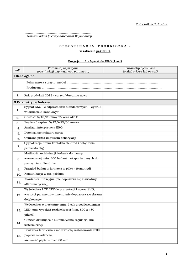 Załącznik nr 2 do siwz .......................................................................... Nazwa i adres (pieczęć adresowa) Wykonawcy SPECYFIKACJA TECHNICZNA - w zakresie pakietu 2 Pozycja nr 1 - Aparat do EKG (1 szt) Parametry wymagane (opis funkcji wymaganego parametru) L.p. Parametry oferowane (podać zakres lub opisać) I Dane ogólne Pełna nazwa sprzętu, model ...................................................................................................... Producent ................................................................................................................................... 1. Rok produkcji 2013 - sprzęt fabrycznie nowy II Parametry techniczne Sygnał EKG 12 odprowadzeń standardowych – wydruk 1. w formacie 3-kanałowym 2. Czułość: 5/10/20 mm/mV oraz AUTO 3. Prędkość zapisu: 5/12,5/25/50 mm/s 4. Analiza i interpretacja EKG 5. Detekcja stymulatora serca 6. Ochrona przed impulsem defibrylacji Sygnalizacja braku kontaktu elektrod i odłączenia 7. przewodu ekg MoŜliwość archiwizacji badania do pamięci 8. wewnętrznej (min. 800 badań) i eksportu danych do pamięci typu Pendrive 9. 10. Przegląd badań w formacie w pliku - format pdf Komunikacja w jęz. polskim Klawiatura funkcyjna (nie dopuszcza się klawiatury 11. alfanumerycznej) Wyświetlacz LCD TFT do prezentacji krzywej EKG, 12. wartości parametrów i menu (nie dopuszcza się ekranu dotykowego) Wyświetlacz o przekątnej min. 5 cali z podświetleniem 13. LED oraz wysokiej rozdzielczości (min. 800 x 480 pikseli) Głowica drukująca z automatyczną regulacją linii 14. izotermicznej Drukarka termiczna z moŜliwością zastosowania rolki i 15. papieru składanego, szerokość papieru max. 80 mm. 1 Zasilanie sieciowe 230 V 50 Hz ,wbudowane zasilanie 16. akumulatorowe na co najmniej 6 godz. ciągłego monitorowania oraz 2 godz. ciągłego wydruku 17. Waga aparatu z akumulatorem i zasilaczem do 1.2 kg 18. przyssawkowe oraz klipsowe, papier termiczny - 10 WyposaŜenie: przewód pacjenta, elektrody rolek Pozycja nr 2 - Defibrylatory (1 szt) Parametry wymagane (opis funkcji wymaganego parametru) L.p. Parametry oferowane (podać zakres lub opisać) I Dane ogólne Pełna nazwa sprzętu, model ...................................................................................................... Producent ................................................................................................................................... 1. Rok produkcji 2013 - sprzęt fabrycznie nowy II Parametry techniczne Urządzenie do defibrylacji dwufazowej oraz 1. monitorowania EKG, respiracji i SpO2 MoŜliwość wyświetlania na ekranie 3 krzywych 2. dynamicznych na ekranie kolorowym TFT o przekątnej minimum 7’’ Wyświetlanie wszystkich monitorowanych parametrów 3. w formie cyfrowej Defibrylacje ręczna w zakresie energii min. od 1 do 360J z moŜliwość wyboru jednego spośród min. 20 4. poziomów energii defibrylacji Czas ładowania do energii maksymalnej 360J max. 8 sekund Ustawianie energii defibrylacji, ładowania i wstrząsu 5. na łyŜkach defibrylacyjnych Wydzielony na defibrylatorze przycisk rozładowania 6. 7. energii MoŜliwość wykonania kardiowersji Defibrylacja półautomatyczna (AED) z systemem 8. doradczym w języku polskim Energia defibrylacji w trybie AED min. od 100 do 360 9. J W trybie AED - programowane przez uŜytkownika 10. wartości energii dla 1, 2 i 3 defibrylacji z energią 200 J i większą MoŜliwość wykonania defibrylacji w trybie AED za 11. 12. pomocą elektrod jednorazowych Dźwiękowe i tekstowe komunikaty w języku polskim 2 prowadzące uŜytkownika przez proces defibrylacji półautomatycznej Monitorowanie EKG min. z 3/5 odprowadzeń, zakres 13. pomiaru częstości akcji serca w zakresie 15-350 B/min, pomiar respiracji w zakresie 0-120 rpm Pomiar saturacji za pomocą czujnika na palec dla 14. dorosłych, prezentacja wartości saturacji oraz krzywej pletyzmograficznej na ekranie Stymulacja zewnętrzna nieinwazyjna w trybie asynchronicznym i na Ŝądanie, zakres częstości 15. impulsów stymulacyjnych min. od 50 do 150 imp/min, natęŜenie prądu impulsów od 0 do 200mA 16. Alarmy wszystkich monitorowanych funkcji Wbudowana drukarka termiczna, moŜliwość wydruku 17. w czasie rzeczywistym minimum 3 krzywych, szerokość papieru min.50mm Urządzenie wyposaŜone w uniwersalne łyŜki 18. defibrylacyjne dla dorosłych Urządzenie z wbudowanym akumulatorem i ładowarką zasilaną z sieci napięcia przemiennego 230V, 19. akumulator bez efektu pamięci z moŜliwością wymiany przez obsługę, pojemność akumulatora umoŜliwiająca wykonanie co najmniej 100 defibrylacji z energią 360J Automatycznie programowanie wykonywanych 20. autotestów okresowych nie wymagających włączenia defibrylatora 21. Masa kompletnego defibrylatora max. 6kg 22. MoŜliwość mocowania do łóŜka transportowego Pozycja nr 3 - Kardiomonitor (1 szt) Parametry wymagane (opis funkcji wymaganego parametru) L.p. Parametry oferowane (podać zakres lub opisać) I Dane ogólne Pełna nazwa sprzętu, model ...................................................................................................... Producent ................................................................................................................................... 1. Rok produkcji 2013 - sprzęt fabrycznie nowy II Parametry techniczne Monitor z kolorowym ekranem LCD TFT o przekątnej 1. co najmniej 12”i rozdzielczości 800x600. Sterowanie monitorem poprzez pokrętło nawigacyjne, 2. przyciski na płycie czołowej monitora, ekran dotykowy. 3 3. Ilość kanałów dynamicznych – min. 8. Zapamiętywanie krzywych dynamicznych w czasie 4. rzeczywistym min. 6 godzin. Monitor wyposaŜony w co najmniej jedne gniazdo USB 5. słuŜące między innymi do przenoszenia konfiguracji pacjenta. WyposaŜenie monitora w elementy mocowania do 6. ściany, szybkiego zdejmowania i zamocowania na wózku transportowym. Zasilanie 