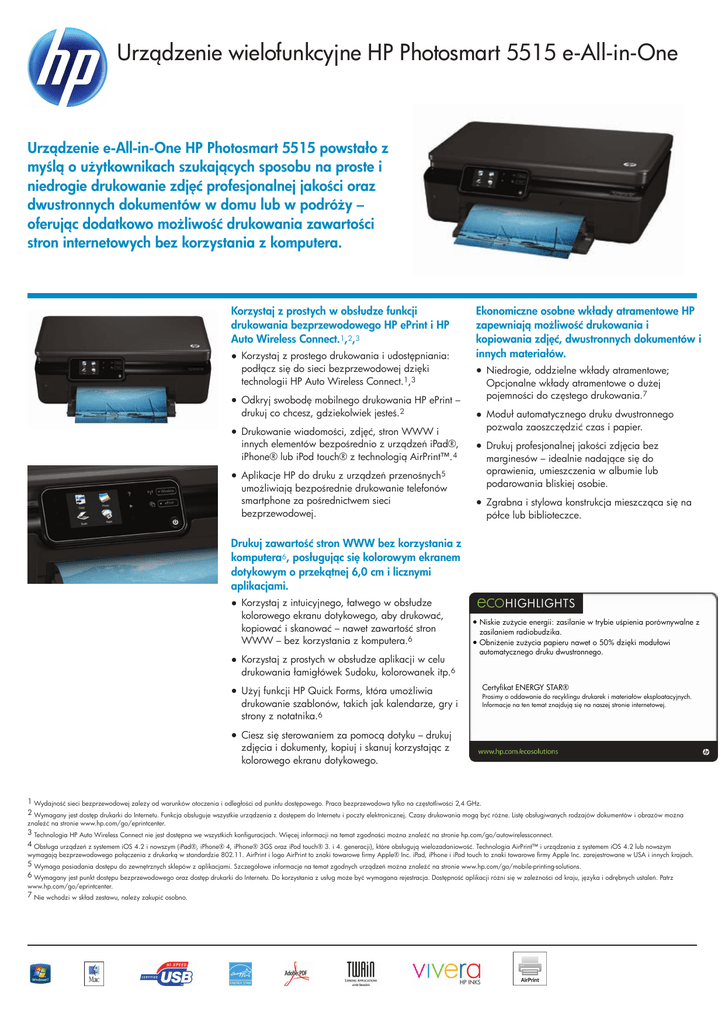 Urządzenie wielofunkcyjne HP Photosmart 5515 e-All-in-One Urządzenie e-All-in-One HP Photosmart 5515 powstało z myślą o użytkownikach szukających sposobu na proste i niedrogie drukowanie zdjęć profesjonalnej jakości oraz dwustronnych dokumentów w domu lub w podróży – oferując dodatkowo możliwość drukowania zawartości stron internetowych bez korzystania z komputera. Korzystaj z prostych w obsłudze funkcji drukowania bezprzewodowego HP ePrint i HP Auto Wireless Connect.1,2,3 ● Korzystaj z prostego drukowania i udostępniania: podłącz się do sieci bezprzewodowej dzięki technologii HP Auto Wireless Connect.1,3 ● Odkryj swobodę mobilnego drukowania HP ePrint – drukuj co chcesz, gdziekolwiek jesteś.2 ● Drukowanie wiadomości, zdjęć, stron WWW i innych elementów bezpośrednio z urządzeń iPad®, iPhone® lub iPod touch® z technologią AirPrint™.4 ● Aplikacje HP do druku z urządzeń przenośnych5 umożliwiają bezpośrednie drukowanie telefonów smartphone za pośrednictwem sieci bezprzewodowej. Ekonomiczne osobne wkłady atramentowe HP zapewniają możliwość drukowania i kopiowania zdjęć, dwustronnych dokumentów i innych materiałów. ● Niedrogie, oddzielne wkłady atramentowe; Opcjonalne wkłady atramentowe o dużej pojemności do częstego drukowania.7 ● Moduł automatycznego druku dwustronnego pozwala zaoszczędzić czas i papier. ● Drukuj profesjonalnej jakości zdjęcia bez marginesów – idealnie nadające się do oprawienia, umieszczenia w albumie lub podarowania bliskiej osobie. ● Zgrabna i stylowa konstrukcja mieszcząca się na półce lub biblioteczce. Drukuj zawartość stron WWW bez korzystania z komputera6, posługując się kolorowym ekranem dotykowym o przekątnej 6,0 cm i licznymi aplikacjami. ● Korzystaj z intuicyjnego, łatwego w obsłudze kolorowego ekranu dotykowego, aby drukować, kopiować i skanować – nawet zawartość stron WWW – bez korzystania z komputera.6 ● Korzystaj z prostych w obsłudze aplikacji w celu drukowania łamigłówek Sudoku, kolorowanek itp.6 ● Niskie zużycie energii: zasilanie w trybie uśpienia porównywalne z zasilaniem radiobudzika. ● Obniżenie zużycia papieru nawet o 50% dzięki modułowi automatycznego druku dwustronnego. ● Użyj funkcji HP Quick Forms, która umożliwia drukowanie szablonów, takich jak kalendarze, gry i strony z notatnika.6 Certyfikat ENERGY STAR® Prosimy o oddawanie do recyklingu drukarek i materiałów eksploatacyjnych. Informacje na ten temat znajdują się na naszej stronie internetowej. ● Ciesz się sterowaniem za pomocą dotyku – drukuj zdjęcia i dokumenty, kopiuj i skanuj korzystając z kolorowego ekranu dotykowego. 1 Wydajność sieci bezprzewodowej zależy od warunków otoczenia i odległości od punktu dostępowego. Praca bezprzewodowa tylko na częstotliwości 2,4 GHz. 2 Wymagany jest dostęp drukarki do Internetu. Funkcja obsługuje wszystkie urządzenia z dostępem do Internetu i poczty elektronicznej. Czasy drukowania mogą być różne. Listę obsługiwanych rodzajów dokumentów i obrazów można znaleźć na stronie www.hp.com/go/eprintcenter. 3 Technologia HP Auto Wireless Connect nie jest dostępna we wszystkich konfiguracjach. Więcej informacji na temat zgodności można znaleźć na stronie hp.com/go/autowirelessconnect. 4 Obsługa urządzeń z systemem iOS 4.2 i nowszym (iPad®, iPhone® 4, iPhone® 3GS oraz iPod touch® 3. i 4. generacji), które obsługują wielozadaniowość. Technologia AirPrint™ i urządzenia z systemem iOS 4.2 lub nowszym wymagają bezprzewodowego połączenia z drukarką w standardzie 802.11. AirPrint i logo AirPrint to znaki towarowe firmy Apple® Inc. iPad, iPhone i iPod touch to znaki towarowe firmy Apple Inc. zarejestrowane w USA i innych krajach. 5 Wymaga posiadania dostępu do zewnętrznych sklepów z aplikacjami. Szczegółowe informacje na temat zgodnych urządzeń można znaleźć na stronie www.hp.com/go/mobile-printing-solutions. 6 Wymagany jest punkt dostępu bezprzewodowego oraz dostęp drukarki do Internetu. Do korzystania z usług może być wymagana rejestracja. Dostępność aplikacji różni się w zależności od kraju, języka i odrębnych ustaleń. Patrz www.hp.com/go/eprintcenter. 7 Nie wchodzi w skład zestawu, należy zakupić osobno. Urządzenie wielofunkcyjne HP Photosmart 5515 e-All-in-One DANE TECHNICZNE Funkcje Technologia druku Wyświetlacz Liczba wkładów drukujących Oprogramowanie Standardowe podłączenia Przygotowany do pracy w sieci Możliwość druku mobilnego Zgodność karty pamięci Standardowe języki drukarki Rozdzielczość druku Prędkość druku Możliwości drukarki Obciążalność Typ skanera/Technologia Tryby skanowania Rozdzielczość skanowania Głębia bitowa/Poziomy skali szarości Maksymalny format skanowania Rozdzielczość kopiowania Prędkość kopiowania Maksymalna liczba kopii Skala zmiany rozmiarów w kopiarce Drukowanie, kopiowanie, skanowanie, funkcje sieciowe Technologia termiczna HP Inkjet Kolorowy ekran dotykowy CGD o przekątnej 6,0 cm 4 (czarna, błękitna, purpurowa, żółta) HP Photo Creations Hi-Speed USB 2.0; interfejs bezprzewodowy 802.11b/g/n Standardowo (wbudowany interfejs WiFi 802.11b/g/n); HP ePrint, Apple AirPrint™ Memory Stick Duo, Secure Digital/MultimediaCard HP PCL 3 GUI W czerni (best): Rozdzielczość do 1200 x 600 dpi (przy drukowaniu z komputera); Kolor (best): Rozdzielczość optymalizowana do 4800x1200 dpi (przy druku w kolorze z komputera na wybranych papierach fotograficznych HP, rozdzielczość wejściowa 1200 dpi) Czarny (ISO): Do 11 str./min; Kolorowy (ISO): Do 7,5 str./min Druk bez marginesów: Tak (do 216x297 mm) Obsługiwane drukowanie bezpośrednie: Tak, karty pamięci Miesięcznie, A4: Do 1000 stron Zasilanie Wymiary Waga produktu Zawartość opakowania Gwarancja Kraj pochodzenia Materiały eksploatacyjne Płaski; Czujnik Contact Image Sensor (CIS) Skanowanie z panelu przedniego Urządzenie: Do 120