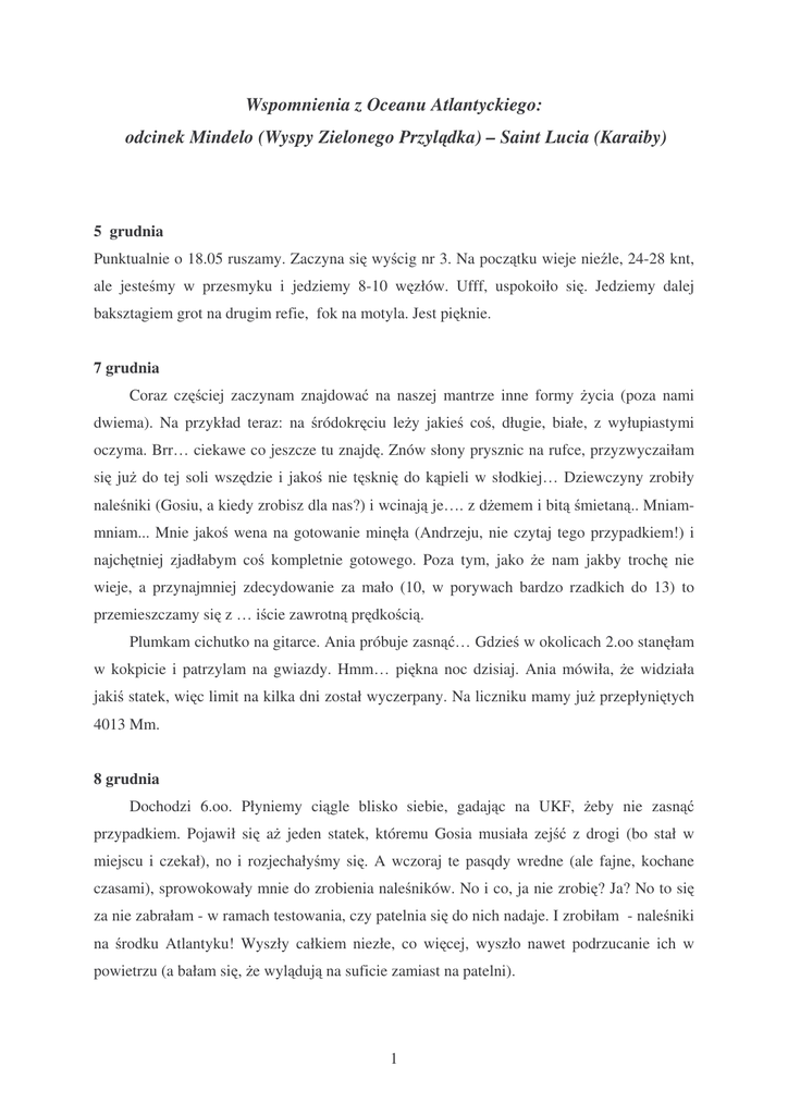 Wspomnienia z Oceanu Atlantyckiego: odcinek Mindelo (Wyspy Zielonego Przyl dka) – Saint Lucia (Karaiby) 5 grudnia Punktualnie o 18.05 ruszamy. Zaczyna si wy cig nr 3. Na pocz tku wieje nie le, 24-28 knt, ale jeste my w przesmyku i jedziemy 8-10 w złów. Ufff, uspokoiło si . Jedziemy dalej baksztagiem grot na drugim refie, fok na motyla. Jest pi knie. 7 grudnia Coraz cz ciej zaczynam znajdowa na naszej mantrze inne formy ycia (poza nami dwiema). Na przykład teraz: na ródokr ciu le y jakie co , długie, białe, z wyłupiastymi oczyma. Brr… ciekawe co jeszcze tu znajd . Znów słony prysznic na rufce, przyzwyczaiłam si ju do tej soli wsz dzie i jako nie t skni do k pieli w słodkiej… Dziewczyny zrobiły nale niki (Gosiu, a kiedy zrobisz dla nas?) i wcinaj je…. z d emem i bit mietan .. Mniam- mniam... Mnie jako wena na gotowanie min ła (Andrzeju, nie czytaj tego przypadkiem!) i najch tniej zjadłabym co kompletnie gotowego. Poza tym, jako e nam jakby troch nie wieje, a przynajmniej zdecydowanie za mało (10, w porywach bardzo rzadkich do 13) to przemieszczamy si z … i cie zawrotn pr dko ci . Plumkam cichutko na gitarce. Ania próbuje zasn … Gdzie w okolicach 2.oo stan łam w kokpicie i patrzylam na gwiazdy. Hmm… pi kna noc dzisiaj. Ania mówiła, e widziała jaki statek, wi c limit na kilka dni został wyczerpany. Na liczniku mamy ju przepłyni tych 4013 Mm. 8 grudnia Dochodzi 6.oo. Płyniemy ci gle blisko siebie, gadaj c na UKF, przypadkiem. Pojawił si a jeden statek, któremu Gosia musiała zej eby nie zasn z drogi (bo stał w miejscu i czekał), no i rozjechały my si . A wczoraj te pasqdy wredne (ale fajne, kochane czasami), sprowokowały mnie do zrobienia nale ników. No i co, ja nie zrobi ? Ja? No to si za nie zabrałam - w ramach testowania, czy patelnia si do nich nadaje. I zrobiłam - nale niki na rodku Atlantyku! Wyszły całkiem niezłe, co wi cej, wyszło nawet podrzucanie ich w powietrzu (a bałam si , e wyl duj na suficie zamiast na patelni). 1 Znów prawie nic nie wieje. agle zwisaj jak zwi dłe li cie. Koszmar! Dmucha jakie 9-12 knt, ale to za mało. I tak cały dzie - upał, mało wiej cy wiatr. Jednym słowem - lipa. 10 grudnia Wczoraj po raz kolejny do wiadczyły my wielko ci Oceanu, jego ciszy i spokoju. Obecnie mamy zawrotn pr dko Madzi i Gosi 2,5 w zła. Ale udało si nam, po 5 dniach (!), spotka z i poplotkowa . No i w ramach wspólnego obiadu ze arły my sałatki przygotowane na ka dym z jachtów. Miały by co prawda nale niki, ale w taki upal siedzie w kambuzie - to awykonalne. Płyniemy sobie a 1,5-2,5 kts, wiatru a 6- 10knt. W takich warunkach grot odmawia współpracy. To ci gamy go w dół i jedziemy na samym foku. Buja okrutnie i jakie chmurzyska si zbieraj . Jak na razie siła wiatru nie wzrasta, aczkolwiek to si mo e wkrótce zmieni . Zobaczymy. Mamy 12 dni, eby na Wigili zd y na l d… Pó no ju , chyba pora budzi Ani , ale… wła nie wyszedł łysy, i gwiazd pełno. kła al si spa ! Niebo jest tak zagwie d one, jak ju dawno nie było. A gdzie tam jakie cumulusy, cho na razie – tylko s . Wła nie to jest tutaj takie dziwne: e jak widzi si chmur (deszczow czy wiatrow ) to z niej albo przywieje, albo i nie. Nie ma reguły. Patrz na gps-a. Przed nami jeszcze 1367 Mm. Daleko! Wokół spokój i cisza. Płyniemy przed siebie. Ania pi. I dobrze. Przecie nic si nie dzieje. Ja posiedz jeszcze pod łysym i gwiazdami... 11 grudnia Na Atlantyku upał. W ogóle nie wieje. I gor co jak cholera! Pijemy mnóstwo wody, ci gle k piemy si na rufie. Ten prysznic jest boski! Ania zmyka si zdrzemn , ja zostaj i dla ochłody czytam o wyprawie na Grenlandi (o tym, jak im tam zimno było)... Dziewczyny widziały wczoraj wieloryby (!) I to chwil po tym, jak odcumowały si od siebie... My jeszcze nie… i mo e niech tak ju zostanie? Suniemy na aglach ( eby benzyny nie brakło; teraz baki s pełne, ale jak nie b dzie w ogóle wia ?) Wieje nam 7-9 w złów i zasuwamy po 4-5 kts! Nie le! Na Atlantyku pływa si zupełnie inaczej ni na ródziemnym. Brak statków. Czasem pojawi si jeden na 2-3 dni, i zaraz rado budzi wielk … e nie jeste my same na tym ogromnym oceanie! Wci t sknimy za jakim wiaterkiem… bo tu lipa wiatrowa non stop! 2 14 grudnia Upał! Gor co!! I wieje 9-12, czasami, w porywach, do 13 knt. Po południu zabrałam si za sałatk (bo nawet w tym upale co trzeba zje ). Cebula nam si sko czyła i teraz wszystkie dania b d tylko z czosnkiem. Sałatka, makaron, do tego jaka puszka z owocami, pomidorki. No i obowi zkowo oliwa z oliwek i bazylia. No i czosnek oczywi cie. I starczy. A swoj drog rozleniwiłam si tak, e da z puszek nie chce mi si ju doprawia … W ko cu te hiszpa skie gotowce s naprawd całkiem smaczne... Spinaker w gór . Czasu mamy mało a zd y musimy. Przed nami 1200 Mm i 10 dni, eby na 23 grudnia dotrze na St. Lucia i zacumowa na l dzie. UDA SI !!! Zawsze si udawało! I nic, nawet to niewianie wiatru nam nie przeszkodzi!!! piewamy troch przy gitarce, siedz c pod niebieskim spinakerkiem. Delfinów niet, czasami tylko lataj ce ryby nas strasz , wlatuj c na pokład. Brrr.. niektórzy mówi , e pono s pyszne, ale my nie mamy jeszcze do nich przekonania… ale mo e za jaki czas wrzuc je na patelni … Zacz ło (nareszcie!) troszk wia , jakie 15–17 knt. Momentami troch nas wozi na falach, ale da si wytrzyma . Oczy zaczynaj mi si klei , ale jeszcze ze dwie godzinki wytrzymam… A potem - do mojej dziobowej koi, do poduszki. Nigdy w yciu nie miałam poduszki na jachcie, ale od teraz - b d j mie . To cudowne uczucie, kiedy zm czon głow mo na przytuli do podusi i zasn na chwil ... 15 grudnia Całkiem fajnie nam dzi wiało, od 18 do 20 knt. I była fajna jazda. I tak niech zostanie, tym bardziej, e nawet za bardzo nas nie woziło. Niestety pó niej ju zmalało do 12-13 knt, ale i tak było nie łe, bo w ci gu doby zrobiły my a 151 Mm! Do brzegów St. Lucia zostało nam 948 Mm, Jak ju odległo spada poni ej 1000 Mm, to jako bli ej si wydaje, cho to
