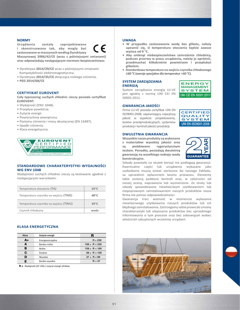 NORMY UWAGA • W przypadku zastosowania wody bez glikolu, należy upewnić się, iż temperatura otoczenia będzie zawsze wyższa od 0 °C. • Aby uniknąć niebezpieczeństwa zamrożenia chłodnicy, podczas przerwy w pracy urządzenia, należy je opróżnić, przedmuchać kilkakrotnie powietrzem i przepłukać glikolem. • Standardowa temperatura na wejściu czynnika chłodzonego ≤60 °C (wersje specjalne dla temperatur >60 °C). Urządzenia zostały zaprojektowane i skonstruowane tak, aby mogły być zastosowane w maszynach według Dyrektywy Maszynowej 2006/42/CE (wraz z późniejszymi zmianami) oraz odpowiadają następującym normom bezpieczeństwa: • Dyrektywa 2014/29/CE wraz z późniejszymi zmianami Kompatybilność elektromagnetyczna. • Dyrektywa 2014/35/CE dotycząca niskiego ciśnienia. • PED 2014/68/CE SYSTEM ZARZĄDZANIA ENERGIĄ System zarządzania energią LU-VE jest zgodny z normą UNI CEI EN 50001:2011. CERTYFIKAT EUROVENT Cały typoszereg suchych chłodnic cieczy posiada certyfikat EUROVENT. • Wydajność (ENV 1048). • Przepływ powietrza. • Zużycie energii. • Powierzchnia zewnętrzna. • Poziomy ciśnienia i mocy akustycznej (EN 13487). • Spadki ciśnienia. • Klasa energetyczna. ENERGY MANAGEMENT SYSTEM CERT QUA SYST UNI CEI EN 50001:2011 UNI EN ISO GWARANCJA JAKOŚCI Firma LU-VE posiada certyfikat UNI EN ENERGY ISO9001:2008, zapewniający najwyższą MANAGEMENT jakość wSaspekcie: projektowania, YSTE M testów przedprodukcyjnych, systemów UNI CEI EN 50001:2011 produkcji i kontroli jakości produkcji. CERTIFIED QUALITY SYSTEM UNI EN ISO9001:2008 DWULETNIA GWARANCJA YEAR Wszystkie nasze produkty są wykonane z materiałów wysokiej jakości oraz są poddawane rygorystycznym testom. Ponadto, posiadają dwuletnią gwarancję na wszelkiego rodzaju wady GUARANTEE konstrukcyjne. Szkody powstałe na skutek korozji nie podlegają gwarancji. Ewentualne części lub urządzenia wykazane jako uszkodzone muszą zostać zwrócone do naszego Zakładu, za uprzednim opłaceniem kosztu przewozu. Elementy takie zostaną poddane kontroli oraz, w zależności od naszej oceny, naprawione lub wymienione. Za straty lub szkody spowodowane niewłaściwym użytkowaniem lub niepoprawnym zainstalowaniem naszych produktów nasza firma nie ponosi odpowiedzialności. Gwarancja traci ważność w momencie wykazania niewłaściwego użytkowania naszych produktów lub ich błędnego zainstalowania. Zastrzegamy sobie prawo do zmiany charakterystyki lub ulepszania produktów bez uprzedniego informowania o tym procesie oraz bez zobowiązań wobec właścicieli zakupionych wcześniej urządzeń. CERTIFY ALL DRY COOLERS STANDARDOWE CHARAKTERYSTYKI WYDAJNOŚCI WG ENV 1048 Wydajności suchych chłodnic cieczy są testowane zgodnie z następującymi warunkami: Temperatura otoczenia (TA) 25°C Temperatura czynnika na wejściu (TWE) 40°C Temperatura czynnika na wyjściu (TWU) 35°C Czynnik chłodzony woda KLASA ENERGETYCZNA Klasa A+ A B C D E Zużycie energii Energooszczędne R R ≥ 226 Bardzo niskie 169 ≤ R < 226 Niskie 109 ≤ R < 169 Średnie 69 ≤ R < 109 Wysokie 37 ≤ R < 69 Bardzo wysokie R < 37 R = Wydajność (ΔT 15K) / zużycie energii silników. 51