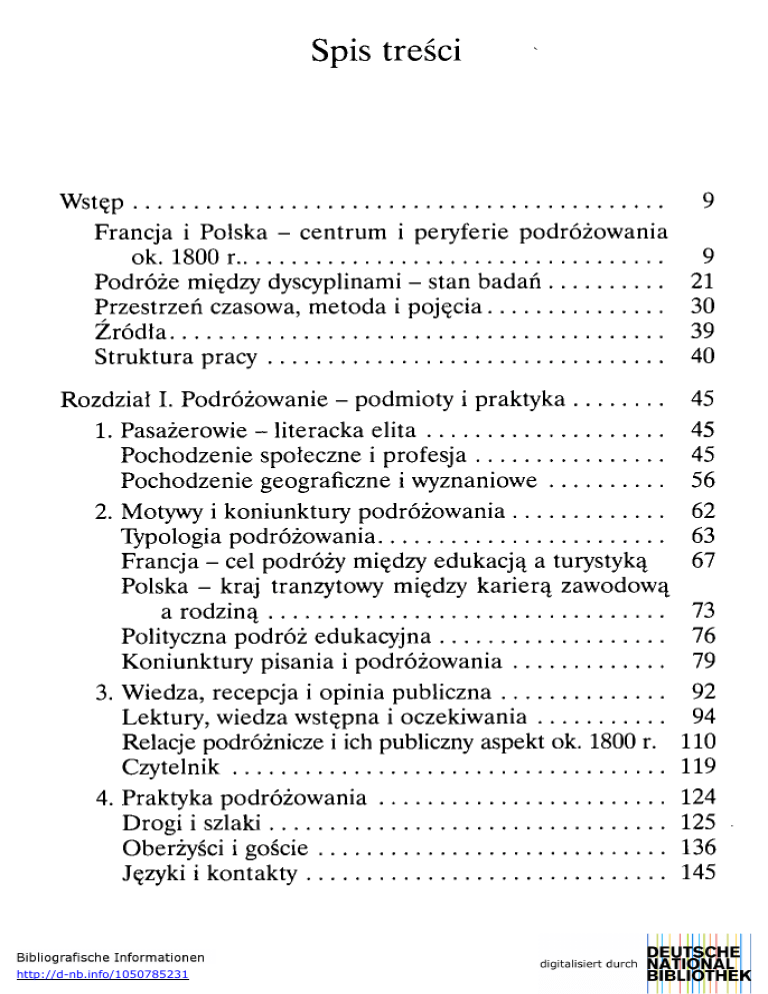 Spis treści Wstęp Francja i Polska - centrum i peryferie podróżowania ok. 1800 r Podróże między dyscyplinami - stan badań Przestrzeń czasowa, metoda i pojęcia Źródła Struktura pracy Rozdział I. Podróżowanie - podmioty i praktyka 1. Pasażerowie - literacka elita Pochodzenie społeczne i profesja Pochodzenie geograficzne i wyznaniowe 2. Motywy i koniunktury podróżowania Typologia podróżowania Francja - cel podróży między edukacją a turystyką Polska - kraj tranzytowy między karierą zawodową a rodziną Polityczna podróż edukacyjna Koniunktury pisania i podróżowania 3. Wiedza, recepcja i opinia publiczna Lektury, wiedza wstępna i oczekiwania Relaq'e podróżnicze i ich publiczny aspekt ok. 1800 r. Czytelnik 4. Praktyka podróżowania Drogi i szlaki Oberżyści i goście Języki i kontakty http://d-nb.info/1050785231 9 9 21 30 39 40 45 45 45 56 62 63 67 73 76 79 92 94 110 119 124 125 136 145 Nie Zachód, nie Wschód Rozdział II. Przestrzenie podróżowania 164 1. Geografia i normatywność 165 Geografia Europy: Północ - Południe, Wschód Zachód 168 Polska - tradycja Północy 171 Franq'a - mieszkańcy Północy podróżują na Południe 175 Nowe normy, nowe geografie - z Północy na Wschód 179 2. Granice - wynalazek, przemiana i historyczność.... 186 Na „granicy ojczyzny" - 1820 r. nad Renem 187 Formy granicy i ich postrzeganie 190 Gdzie zaczyna się „właściwa Francja"? Przestrzenie graniczne i regiony 193 Otwarta przestrzeń i etnologia drugiej strony 204 Wyodrębnienie narodu - historia, terytorium i pamięć 212 3. Przestrzenie pośrednie - prowincja i społeczność wiejska 221 Przyglądanie się ziemi - o funkcjonalnym postrzega niu przyrody 222 „Nędzne baraki" - zacofanie widziane oczami miesz czucha 229 „Żebracy na łonie natury" - obrazy francuskiej pro wincji 232 „Idylliczny urok pasterzy" - prowincja francuska mię dzy biedą a sielankowym krajobrazem 239 „Smutne pustynie" - Polska, kraj bez krajobrazu ... 245 Od statystyki do narodowego terytorium 248 4. Centrum i przestrzeń zurbanizowana 257 „Mieszkania nędzy" - ponure prowincje między Wisłą i Garonną 262 Kraków - miniona sława 280 Lwów i Lyon - wzory kultury miejskiej 292 Paryż i Warszawa - metropolie między transferem kulturalnym a pustkowiem 302 Rozdział III. Od społeczeństwa stanowego do narodu.... 309 1. Dwory między absolutyzmem a reformą 310 Ostatni monarchowie i dworska społeczność - Wersal od zewnątrz 311 6 Spis treści Ostatni monarchowie i dworska społeczność - War szawa od środka 322 2. Rewolucja a naród - drogi do modernizmu politycz nego Francja w 1791 r. - krótka droga od „bohaterów spar tańskich" do „barbarzyńców" Polska w 1791 r. - pokojowa „rewolucja" odgórna a „konstytucja anarchii" Francja w 1830 r. - w poszukiwaniu politycznego modernizmu Polska w 1830 r. - za wolność waszą i naszą! 3. Narody i ich charaktery Polacy - o „polskiej gospodarce", „bigoterii" i „szla chetnych Sarmatach" Francuzi - „odrażający brak czystości", „frywolność" i „lekkomyślność" „Bohaterstwo", „umiłowanie wolności" i „barba rzyńcy" „Złodziejscy Polacy". Od sąsiedztwa do narodowej mniejszości i kolonii My, rozsądny naród - co łączy innych Rozważania końcowe Podróżujące elity, wykształceni autorzy W poszukiwaniu Europy Wschodniej - od geografii kul turalnej do politycznej W poszukiwaniu Francji i Polski - od paradygmatu regio nalnego do narodowego Sąsiedzi między obrazem obcego społeczeństwa i naro dowym obrazem wroga Podobieństwa mimo nieporównywalności 329 331 342 351 358 366 368 380 391 396 402 407 407 411 417 421 430 Aneks. Wykaz podróżników 435 Bibliografia 455 Indeks osobowy 499 Indeks geograficzny 506 7