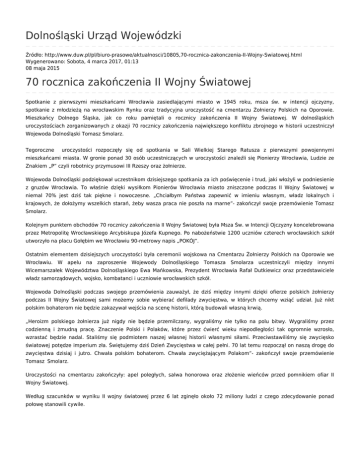 Dolnośląski Urząd Wojewódzki Źródło: http://www.duw.pl/pl/biuro-prasowe/aktualnosci/10805,70-rocznica-zakonczenia-II-Wojny-Swiatowej.html Wygenerowano: Sobota, 4 marca 2017, 01:13 08 maja 2015 70 rocznica zakończenia II Wojny Światowej Spotkanie z pierwszymi mieszkańcami Wrocławia zasiedlającymi miasto w 1945 roku, msza św. w intencji ojczyzny, spotkanie z młodzieżą na wrocławskim Rynku oraz tradycyjna uroczystość na cmentarzu Żołnierzy Polskich na Oporowie. Mieszkańcy Dolnego Śląska, jak co roku pamiętali o rocznicy zakończenia II Wojny Światowej. W dolnośląskich uroczystościach zorganizowanych z okazji 70 rocznicy zakończenia największego konfliktu zbrojnego w historii uczestniczył Wojewoda Dolnośląski Tomasz Smolarz. Tegoroczne uroczystości rozpoczęły się od spotkania w Sali Wielkiej Starego Ratusza z pierwszymi powojennymi mieszkańcami miasta. W gronie ponad 30 osób uczestniczących w uroczystości znaleźli się Pionierzy Wrocławia, Ludzie ze Znakiem „P” czyli robotnicy przymusowi III Rzeszy oraz żołnierze. Wojewoda Dolnośląski podziękował uczestnikom dzisiejszego spotkania za ich poświęcenie i trud, jaki włożyli w podniesienie z gruzów Wrocławia. To właśnie dzięki wysiłkom Pionierów Wrocławia miasto zniszczone podczas II Wojny Światowej w niemal 70% jest dziś tak piękne i nowoczesne. „Chciałbym Państwa zapewnić w imieniu własnym, władz lokalnych i krajowych, że dołożymy wszelkich starań, żeby wasza praca nie poszła na marne”- zakończył swoje przemówienie Tomasz Smolarz. Kolejnym punktem obchodów 70 rocznicy zakończenia II Wojny Światowej była Msza Św. w Intencji Ojczyzny koncelebrowana przez Metropolitę Wrocławskiego Arcybiskupa Józefa Kupnego. Po nabożeństwie 1200 uczniów czterech wrocławskich szkół utworzyło na placu Gołębim we Wrocławiu 90-metrowy napis „POKÓJ”. Ostatnim elementem dzisiejszych uroczystości była ceremonii wojskowa na Cmentarzu Żołnierzy Polskich na Oporowie we Wrocławiu. W apelu na zaproszenie Wojewody Dolnośląskiego Tomasza Smolarza uczestniczyli między innymi Wicemarszałek Województwa Dolnośląskiego Ewa Mańkowska, Prezydent Wrocławia Rafał Dutkiewicz oraz przedstawiciele władz samorządowych, wojsko, kombatanci i uczniowie wrocławskich szkół. Wojewoda Dolnośląski podczas swojego przemówienia zauważył, że dziś między innymi dzięki ofierze polskich żołnierzy podczas II Wojny Światowej sami możemy sobie wybierać defilady zwycięstwa, w których chcemy wziąć udział. Już nikt polskim bohaterom nie będzie zakazywał wejścia na scenę historii, którą budowali własną krwią. „Heroizm polskiego żołnierza już nigdy nie będzie przemilczany, wygraliśmy nie tylko na polu bitwy. Wygraliśmy przez codzienną i żmudną pracę. Znaczenie Polski i Polaków, które przez ćwierć wieku niepodległości tak ogromnie wzrosło, wzrastać będzie nadal. Staliśmy się podmiotem naszej własnej historii własnymi siłami. Przeciwstawiliśmy się zwycięsko światowej potędze imperium zła. Świętujemy dziś Dzień Zwycięstwa w całej pełni. 70 lat temu rozpoczął on naszą drogę do zwycięstwa dzisiaj i jutro. Chwała polskim bohaterom. Chwała zwyciężającym Polakom”- zakończył swoje przemówienie Tomasz Smolarz. Uroczystości na cmentarzu zakończyły: apel poległych, salwa honorowa oraz złożenie wieńców przed pomnikiem ofiar II Wojny Światowej. Według szacunków w wyniku II wojny światowej przez 6 lat zginęło około 72 miliony ludzi z czego zdecydowanie ponad połowę stanowili cywile. fot. DUW fot. DUW fot. DUW fot. DUW fot. DUW fot. DUW fot. DUW fot. DUW fot. DUW fot. DUW fot. DUW fot. DUW fot. DUW fot. DUW fot. DUW fot. DUW fot. DUW fot. DUW fot. DUW fot. DUW fot. DUW fot. DUW fot. DUW fot. DUW fot. DUW fot. DUW fot. DUW fot. DUW fot. DUW fot. DUW fot. DUW fot. DUW fot. DUW Drukuj Generuj PDF Powiadom znajomego Wstecz liczba wejść: 1327