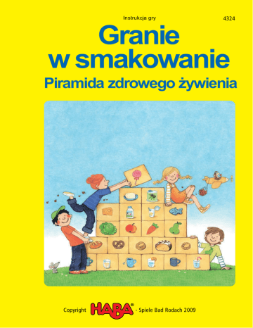 Instrukcja gry 4324 Granie w smakowanie Piramida zdrowego żywienia Copyright - Spiele Bad Rodach 2009 Gra Habermaaß nr 4324 Granie w smakowanie Piramida zdrowego żywienia Gra edukacyjna na temat piramidy zdrowego żywienia. Dla 2 – 4 graczy w wieku od 5 do 99 lat. Pomysł gry: Wolfgang Dirscherl Ilustracje: Martina Leykamm Konsultacje merytoryczne: Maritta Hermani (dyplom z ekotrofologii, nauki o żywieniu produktami ekologicznymi) Czas gry: ok. 15 minut Sebastian uwielbia czekoladę. Jego młodsza siostra Luiza woli chrupać soczyste jabłka i marchewki. Aby byli zdrowi, oboje potrzebują jednak jeszcze innych produktów spożywczych. Ale jakich? Na szczęście ich wujek szybciutko wymyślił świetną grę na temat odżywiania się. Chcecie zagrać? Zawartość gry: 1 4 52 22 1 1 piramida zdrowego żywienia okrągłe karty (w czterech kolorach) płytki drewniane ręce instrukcja gry poradnik zdrowego żywienia 3 Drodzy Rodzice, Wychowawczynie i Wychowawcy! Grając w „Granie w smakowanie - piramida zdrowego żywienia”, dzieci dowiadują się w formie zabawy, jakie produkty spożywcze i w jakiej ilości powinny jeść każdego dnia. Ponadto będą mogły świadomie i krytycznie zweryfikować swoje dotychczasowe zwyczaje i zamiłowania żywieniowe. W dołączonym poradniku zdrowego żywienia znajdą Państwo pomocne informacje i specjalne zachęty dla dzieci w temacie „odżywiania się”. Życzymy Państwu i Państwa dzieciom wiele radości podczas grania! Zespół HABA - twórcy produktów dla dzieci Pomysł gry zebrać najwięcej punktów Gracze próbują odkryć dwie płytki z jednakowymi artykułami spożywczymi. Za każdą odnalezioną parę gracz otrzymuje drewnianą rękę (= punkt). Jeden z odkrytych artykułów spożywczych można dodatkowo położyć na piramidzie zdrowego żywienia. Za to również przyznawane są punkty! Celem gry jest zdobycie jak największej liczby punktów. Przygotowanie do gry piramida zdrowego żywienia na środek, płytki zakryć Piramidę zdrowego żywienia połóżcie na środku stołu. Pomieszajcie płytki i zakryte rozłóżcie wokół piramidy. Uważajcie, żeby płytki nie leżały jedna na drugiej. każdy gracz: okrągła karta = kolor w grze; przygotować drewniane ręce Każdy gracz bierze sobie okrągłą kartę i kładzie przed sobą. Karta wskazuje kolor gracza i służy do odkładania rąk, które zbierzecie w trakcie gry. Przygotujcie drewniane ręce. Przebieg gry 4 odkryć dwie płytki Gra przebiega w kolejności zgodnej z ruchem wskazówek zegara. Rozpoczyna gracz, który ostatnio chrupał marchewkę. Jeśli nie możecie dojść do porozumienia w tej kwestii, to rozpoczyna najmłodszy gracz. Spróbuj odkryć dwa jednakowe artykuły spożywcze, najlepiej z ramką w twoim kolorze. W tym celu odwróć jedną po drugiej dwie dowolne płytki. Czy widać na nich dwa jednakowe artykuły spożywcze? • Nie? Szkoda! Spróbuj zapamiętać artykuły spożywcze i z powrotem odwróć płytki, pokazawszy je uprzednio pozostałym graczom. Teraz kolej na następnego gracza. • Tak? Bardzo dobrze! W nagrodę możesz wziąć sobie drewnianą rękę i położyć na swojej okrągłej karcie. Następnie wybierz jedną z dwóch płytek i połóż na odpowiednie pole artykułu spożywczego w piramidzie zdrowego żywienia. Jeśli to możliwe, wybierz płytkę w twoim kolorze. Drugą płytkę z powrotem odwróć. Teraz kolej, aby płytki odkrył następny gracz. różne artykuły spożywcze = następny gracz jednakowe artykuły spożywcze = drewniana ręka na okrągłą kartę, a płytka na piramidę zdrowego żywienia Uwaga: Na każdym polu piramidy zdrowego żywienia można położyć tylko jedną płytkę. Jeśli na piramidzie zdrowego żywienia zajęte są wszystkie pola artykułu spożywczego, to obydwie płytki musisz odłożyć do pudełka. Nie otrzymujesz drewnianej ręki. Za to możesz odkryć dwie kolejne płytki. Koniec gry Gra się kończy, gdy wszystkie pola piramidy zdrowego żywienia zostaną zajęte przez płytki. Gracze podliczają swoje punkty. Młodszym dzieciom, które nie potrafią jeszcze dobrze liczyć, pomaga starsze dziecko lub dorosły: piramida zdrowego żywienia cała zajęta = koniec gry • Każda drewniana ręka liczy się jako jeden punkt. • Każda płytka w kolorze gracza leżąca na piramidzie zdrowego żywienia liczy się również jako jeden punkt. Wygrywa gracz, który zbierze najwięcej punktów. W przypadku remisu zwycięzców jest więcej. najwięcej punktów = zwycięstwo 5 Autor Wolfgang Dirscherl urodził się w 1974 r. w Regensburgu. Po ukończeniu szkoły zdobył zawód urzędnika bankowego, a następnie studiował na kierunku ekonomiki i organizacji przedsiębiorstw. Od 2003 r. pracuje w HABA w swoim wymarzonym zawodzie redaktora gier. Jest autorem wielu innych gier dla HABA oprócz tej, np. gier Czosnkowe wampiry (Die Knoblauch-Vampire), Dzicy wikingowie (Wilde Wikinger), Silne smoki (Drachenstark) lub gier edukacyjnych Abecadło z piratami (Piraten-ABC) i Geometria z piratami (Geometrie-Piraten). Wolfgang Dirscherl mieszka ze swoją żoną Sybillą i synem Simonem w Coburgu. Ilustratorka Martina Leykamm urodziła się w 1975 r. Studiowała wzornictwo graficzne w Norymberdze oraz communication design w Londynie. Od 2000 r. mieszka w Berlinie i pracuje w wolnym zawodzie graficzki i ilustratorki. Dla HABA zaprojektowała już wiele gier i książek: np. Szukanie skarpetek (Socken zocken), Taniec jajek (Eiertanz) lub Postanowione – zrobione! (Gesagt – getan!). Konsultantka merytoryczna Maritta Hermani (dyplomowana ekotrofolożka) urodziła się w Einberg/Coburg. Studiowała technologię żywienia w Bonn i Kolonii i od kilku lat pracuje w wolnym zawodzie. Jej główne obszary specjalizacji w dziedzinie medycznego doradztwa ds. żywienia to m.in. zaburzenia przemiany tłuszczów, otyłość i nietolerancja pokarmowa. 6 Zespół HABA – twórcy produktów dla dzieci Niemowlęta & Małe dzieci Dzieci p