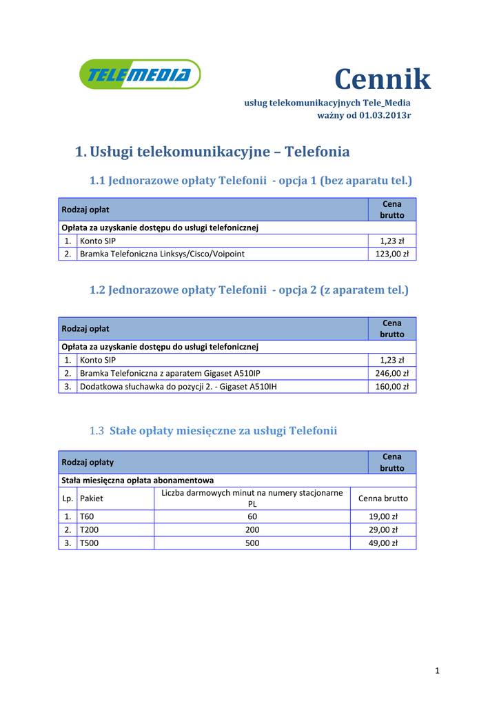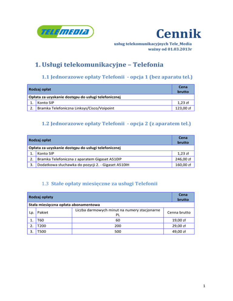 Cennik usług telekomunikacyjnych Tele_Media ważny od 01.03.2013r 1. Usługi telekomunikacyjne – Telefonia 1.1 Jednorazowe opłaty Telefonii - opcja 1 (bez aparatu tel.) Rodzaj opłat Opłata za uzyskanie dostępu do usługi telefonicznej 1. Konto SIP 2. Bramka Telefoniczna Linksys/Cisco/Voipoint Cena brutto 1,23 zł 123,00 zł 1.2 Jednorazowe opłaty Telefonii - opcja 2 (z aparatem tel.) Rodzaj opłat Opłata za uzyskanie dostępu do usługi telefonicznej 1. Konto SIP 2. Bramka Telefoniczna z aparatem Gigaset A510IP 3. Dodatkowa słuchawka do pozycji 2. - Gigaset A510IH Cena brutto 1,23 zł 246,00 zł 160,00 zł 1.3 Stałe opłaty miesięczne za usługi Telefonii Rodzaj opłaty Stała miesięczna opłata abonamentowa Liczba darmowych minut na numery stacjonarne Lp. Pakiet PL 1. T60 60 2. T200 200 3. T500 500 Cena brutto Cenna brutto 19,00 zł 29,00 zł 49,00 zł 1 2. Opłaty za połączenia telekomunikacyjne 2.1 Opłaty za stacjonarne połączenia krajowe Rodzaj opłaty Rodzaj połączenia Połączenie lokalne i międzystrefowe Cena netto Podatek VAT Cena brutto 0,081 zł 0,019 zł 0,10 zł Informacje W tabeli podano cenę za 1 minutę połączenia. Opłata naliczana jest za rzeczywisty czas połączenia określany z dokładnością do 1 sekundy. Opłata za połączenie wynosi min. 1 gr. Połączenia wykonywane wewnątrz sieci telefonicznej Tele_Media są bezpłatne. 2. 2 Opłaty za komórkowe połączenia krajowe Rodzaj opłaty Rodzaj połączenia Połączenia z sieciami telefonii komórkowych, których operatorami są PTK Centertel (Orange), Polkomtel S.A. (Plus) i Polska Telefonia Cyfrowa Sp. z o. o. (T-Mobile), P4 Sp. z o.o. (Play), Cyfrowy Polsat S.A., Centernet, MOBYLAND Sp. z o.o., MVMO Cena netto Podatek VAT Cena brutto 0,36 zł 0,08 zł 0,44 zł Informacje W tabeli podano cenę za 1 minutę połączenia. Opłata naliczana jest za rzeczywisty czas połączenia określany z dokładnością do 1 sekundy Opłata za połączenie wynosi min. 1 gr. 2 2.3 Opłaty za połączenia do sieci inteligentnej Lp. Rodzaj połączenia 1. Połączenia do numerów 800 0 - 800 9 Połączenia do numerów 00 800 - opłata za każdą 2. rozpoczętą minutę połączenia Połączenia do numerów 801 0 - opłata za każdą 3. rozpoczętą minutę połączenia Połączenia do numerów 801 1, 801 2 - opłata za 4. każdą rozpoczętą minutę połączenia Połączenia do numerów 801 3 - opłata za każdą 5. rozpoczętą minutę połączenia Połączenia do numerów 801 4 - opłata za każdą 6. rozpoczętą minutę połączenia Połączenia do numerów 801 5, 801 6 - opłata za 7. każdą rozpoczętą minutę połączenia Połączenia do numerów 801 7, 801 8 - opłata za 8. każdą rozpoczętą minutę połączenia Połączenia do numerów 801 9 - opłata za każdą 9. rozpoczętą minutę połączenia Połączenia do numerów 804 1 - opłata za każdą 10. rozpoczętą minutę połączenia Połączenia do numerów 804 2 - opłata za każdą 11. rozpoczętą minutę połączenia 12. Połączenia do numerów 704 0 - opłata za połączenie 13. Połączenia do numerów 704 1 - opłata za połączenie 14. Połączenia do numerów 704 2 - opłata za połączenie 15. Połączenia do numerów 704 3 - opłata za połączenie 16. Połączenia do numerów 704 4 - opłata za połączenie 17. Połączenia do numerów 704 5 - opłata za połączenie 18. Połączenia do numerów 704 6 - opłata za połączenie 19. Połączenia do numerów 704 7 - opłata za połączenie 20. Połączenia do numerów 704 8 - opłata za połączenie 21. Połączenia do numerów 704 9 - opłata za połączenie 22. Połączenia do numerów 707 1 - opłata za połączenie 23. Połączenia do numerów 707 2 - opłata za połączenie 24. Połączenia do numerów 707 3 - opłata za połączenie 25. Połączenia do numerów 707 4 - opłata za połączenie 26. Połączenia do numerów 707 5 - opłata za połączenie 27. Połączenia do numerów 707 6 - opłata za połączenie Podatek VAT bez opłat Cena brutto 0,12 zł 0,03 zł 0,15 zł 0,29 zł 0,07 zł 0,36 zł 0,12 zł 0,03 zł 0,15 zł 0,14 zł 0,03 zł 0,17 zł 0,45 zł 0,10 zł 0,55 zł 0,29 zł 0,07 zł 0,36 zł 0,14 zł 0,03 zł 0,17 zł 0,16 zł 0,04 zł 0,20 zł 0,25 zł 0,06 zł 0,31 zł 0,29 zł 0,07 zł 0,36 zł 0,66 zł 1,32 zł 2,20 zł 3,30 zł 4,40 zł 5,50 zł 8,80 zł 11,00 zł 22,00 zł 33,00 zł 0,30 zł 0,91 zł 1,83 zł 2,74 zł 3,65 zł 4,56 zł 0,15 zł 0,30 zł 0,51 zł 0,76 zł 1,01 zł 1,27 zł 2,02 zł 2,53 zł 5,06 zł 7,59 zł 0,07 zł 0,21 zł 0,42 zł 0,63 zł 0,84 zł 1,05 zł 0,81 zł 1,62 zł 2,71 zł 4,06 zł 5,41 zł 6,77 zł 10,82 zł 13,53 zł 27,06 zł 40,59 zł 0,37 zł 1,12 zł 2,25 zł 3,37 zł 4,49 zł 5,61 zł Cena netto 3 2.4 Opłaty za połączenia audiotekstowe Lp. Rodzaj połączenia 1. 2. 3. 4. 5. 6. 7. 8. 9. 10. Połączenia do numerów 700 1, 701 1, 703 1, 708 1 opłata za każdą rozpoczętą minutę połączenia Połączenia do numerów 700 2, 701 2, 703 2, 708 2 opłata za każdą rozpoczętą minutę połączenia Połączenia do numerów 700 3, 701 3, 703 3, 708 3 opłata za każdą rozpoczętą minutę połączenia Połączenia do numerów 700 4, 701 4, 703 4, 708 4 opłata za każdą rozpoczętą minutę połączenia Połączenia do numerów 700 5, 701 5, 703 5, 708 5 opłata za każdą rozpoczętą minutę połączenia Połączenia do numerów 700 6, 701 6, 703 6, 708 6 opłata za każdą rozpoczętą minutę połączenia Połączenia do numerów 700 7, 701 7, 703 7, 708 7 opłata za każdą rozpoczętą minutę połączenia Połączenia do numerów 700 8, 701 8, 703 8, 708 8 opłata za każdą rozpoczętą minutę połączenia Połączenia do numerów 700 9, 701 9, 708 9 - opłata za połączenie Połączenia do numerów 703 9 - opłata za każdą rozpoczętą minutę połączenia Cena netto Podatek VAT Cena brutto 0,30 zł 0,07 zł 0,37 zł 1,20 zł 0,28 zł 1,48 zł 1,70 zł 0,39 zł 2,09 zł 2,10 zł 0,48 zł 2,58 zł 3,00 zł
