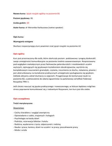 Nazwa kursu: Język rosyjski ogólny na poziomie B1 Poziom językowy: B1 Liczba godzin: 60 Autor kursu: dr Weronika Harbuzowa (native speaker) Opis kursu: Wymagania wstępne Słuchacz rozpoczynający kurs powinien znad język rosyjski na poziomie A2 Opis ogólny Kurs jest przeznaczony dla osób, które skooczyły poziom podstawowy i pragną doskonalid swoje umiejętności komunikacyjne na poziomie średnio-zaawansowanym. Rozpracowany pod względem metodycznym przez fachowców petersburskich i moskiewskich uczelni wyższych, zajmujących się językowym kształceniem obcokrajowców, wyróżnia się kompleksowym nauczaniem gramatyki, czytania, rozumienia ze słuchu, mówienia, pisania i jest ukierunkowany na kształcenie praktycznych umiejętności posługiwania się językiem. Zakłada aktywny udział słuchaczy w zajęciach. Przygotowuje do kontynuacji nauki na poziomie B2, a jednocześnie do zdania egzaminów na paostwowy certyfikat Federacji Rosyjskiej TRKI-1. Jeśli chcesz nauczyd się języka praktycznego i nowoczesnego, w którym będziesz mógł bez stresu poprawnie komunikowad się z rodowitymi Rosjanami, ten kurs jest dla ciebie. Opis szczegółowy Treści merytoryczne: Słownictwo - Cechy charakteru i wygląd zewnętrzny - Opowiadanie o sobie, znajomych i kolegach - Psychologia na każdy dzieo - Podróże, rezerwacja biletów i hotelu - Rodzina; wydarzenia z życia; odpoczynek z rodziną - Nauka i praca; kariera; dzieo na uczelni i w pracy; poszukiwanie pracy - Moda i uroda - Zostao mistrzem w swojej kuchni, czyli lekcja gotowania po rosyjsku - Modne diety i ich wpływ na organizm - Medycyna tradycyjna i ludowa; wizyta u lekarza - Historia, kultura i religia - Przyroda, gospodarka, problemy ekonomiczne - Miasto; życie w mieście - Globalne problemy ludzkości i sposoby ich rozwiązania Gramatyka - Rzeczowniki żywotne i nieżywotne; odmiana rzeczowników - Przymiotniki (odmiana przymiotników twardo- i miękkotematowych) - Formy stopniowania przymiotników; krótkie formy przymiotników (zasady stosowania) - Liczebnik - Zaimki, przyimki i spójniki - Podobieostwa i różnice w gramatyce polskiej i rosyjskiej (trudne dla polaków przypadki) - Przysłówki - Nieregularne czasowniki I i II koniugacji czasu teraźniejszego, przeszłego i przyszłego - Czasowniki ruchu; rola przedrostków w tworzeniu czasowników - Imiesłowy czynne i bierne (zasady tworzenia); krótkie formy imiesłowów - Budowa zdania, interpunkcja w zdaniu Wymagania oceny Słuchacz zakooczy kurs z wynikiem pozytywnym jeśli będzie regularnie uczestniczył w zajęciach (mile widziane 80 % obecności) , oraz na 65 % zaliczy koocowy test pisemny. Literatura Podręczniki petersburskiego wydawnictwa „Златоуст” do wyboru przez grupę na pierwszych zajęciach w porozumieniu z lektorem, materiały audio oraz dodatkowe materiały autorskie. Cel ogólny kursu Ogólnym celem kursu jest rozwinięcie w uczniach umiejętności posługiwania się językiem rosyjskim w obrębie podstawowych sprawności językowych (mówienia, pisania, słuchania i czytania) na poziomie B1. Kurs koncentruje się na rozwijaniu swobodnego samodzielnego mówienia na tematy ogólne, związane z sytuacjami życia codziennego. Umiejętności językowe słuchacza po zakooczeniu kursu Po zakooczeniu kursu z wynikiem pozytywnym słuchacz poszerzy słownictwo na tematy dotyczące życia codziennego, jak również wiedzę z zakresu kultury i zwyczajów rosyjskich. Potrafi poprawnie formułowad proste zdania złożone, napisad list lub email do kolegi. Umie zachowad się w sytuacjach komunikacyjnych omawianych na kursie (język sytuacyjny w podróży, na spotkaniu towarzyskim, w sklepie, restauracji i t.d.)
