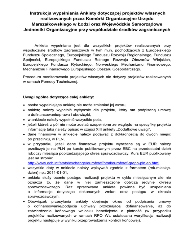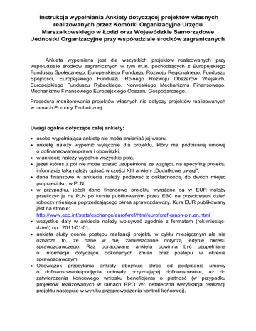 Instrukcja wypełniania Ankiety dotyczącej projektów własnych realizowanych przez Komórki Organizacyjne Urzędu Marszałkowskiego w Łodzi oraz Wojewódzkie Samorządowe Jednostki Organizacyjne przy współudziale środków zagranicznych Ankieta wypełniana jest dla wszystkich projektów realizowanych przy współudziale środków zagranicznych w tym m.in. pochodzących z Europejskiego Funduszu Społecznego, Europejskiego Funduszu Rozwoju Regionalnego, Funduszu Spójności, Europejskiego Funduszu Rolnego Rozwoju Obszarów Wiejskich, Europejskiego Funduszu Rybackiego, Norweskiego Mechanizmu Finansowego, Mechanizmu Finansowego Europejskiego Obszaru Gospodarczego. Procedura monitorowania projektów własnych nie dotyczy projektów realizowanych w ramach Pomocy Technicznej. Uwagi ogólne dotyczące całej ankiety: • osoba wypełniająca ankietę nie może zmieniać jej wzoru, • ankietę należy wypełnić wyłącznie dla projektu, który ma podpisaną umowę o dofinansowanie/prawa i obowiązki, • w ankiecie należy wypełnić wszystkie pola, • jeżeli któreś z pól nie może zostać uzupełnione ze względu na specyfikę projektu informację taką należy opisać w części XIII ankiety „Dodatkowe uwagi”, • dane finansowe w ankiecie należy podawać z dokładnością do dwóch miejsc po przecinku, w PLN, • w przypadku, jeżeli dane finansowe projektu wyrażane są w EUR należy przeliczyć je na PLN po kursie publikowanym przez EBC na przedostatni dzień roboczy miesiąca poprzedzającego okres sprawozdawczy. Kurs EUR publikowany jest na stronie: http://www.ecb.int/stats/exchange/eurofxref/html/eurofxref-graph-pln.en.html • wszystkie daty w ankiecie należy wpisywać zgodnie z formatem (rok-miesiącdzień) np.: 2011-01-01, • ankieta służy ocenie postępu realizacji projektu w cyklu miesięcznym ale nie oznacza to, że dane w niej zamieszczone dotyczą jedynie okresu sprawozdawczego. Raz opracowana ankieta powinna być uzupełniana o informacje dotyczące dokonanych zmian oraz postępu w okresie sprawozdawczym. • Obowiązek przesyłania ankiety obejmuje okres od podpisania umowy o dofinansowanie/podjęcia uchwały przyznającej dofinansowanie, aż do zatwierdzenia końcowego wniosku beneficjenta o płatność (w przypadku projektów realizowanych w ramach RPO WŁ ostateczna weryfikacja realizacji projektu następuje w wyniku przeprowadzenia kontroli końcowej). (część I) Osoba wypełniająca ankietę Należy wskazać Imię i Nazwisko osoby, która wypełniała ankietę w danym miesiącu. Ponadto należy wskazać telefon kontaktowy do osoby wypełniającej ankietę zgodnie z obowiązującym wzorem (dwucyfrowy numer kierunkowy – trzy cyfry – dwie cyfry – dwie cyfry). Osoba wypełniająca ankietę powinna mieć wiedzę dotyczącą postępu we wdrażaniu projektu jak również uczestniczyć w jego realizacji. Należy również podać aktualny i obsługiwany przez kadrę realizującą projekt adres e-mail. Nie powinno używać się adresów prywatnych. (część II) Podstawowe informacje o projekcie Część II ankiety służy zidentyfikowaniu danego projektu własnego. Dane uzupełniane w tej części ankiety muszą być zgodne z dokumentacją projektu, a w szczególności z umową o dofinansowanie/prawami i obowiązkami. W przypadku opisu projektu należy przedstawić krótką charakterystykę projektu, w tym zawrzeć informację na temat wskaźników określonych dla projektu. (część III) Informacje finansowe Należy uzupełnić aktualne dane, czyli takie, które uwzględniają ewentualne aneksy. Dla pól nr 1,2,3 należy podawać wartości liczbowe wyrażone w PLN z dokładnością do dwóch miejsc po przecinku. Dla pola nr 4 należy podać wartość w procentach, z dokładnością do dwóch miejsc po przecinku. Podane wartości powinny być zgodne z obowiązującą umową o dofinansowanie. (część IV) Okres realizacji projektu Należy podać datę rozpoczęcia i zakończenia realizacji projektu zgodnie zarówno ze stanem pierwotnym umowy o dofinansowanie, jak i ze stanem aktualnym. W przypadku, gdy terminy zakończenia (finansowego i rzeczowego) są jednakowe, należy wpisać w polach nr 2 i 3 tą samą datę. Daty należy wpisać zgodnie z formatem (rok-miesiąc-dzień) np.: 2011-01-01. Podane informacje powinny być zgodne z obowiązującą umową o dofinansowanie/prawami i obowiązkami/aneksami na realizację projektu. (część V) Umowy/Prawa i obowiązki/Aneksy na realizację projektu Należy wskazać daty podpisania umowy/praw i obowiązków (wiersz 1), a także wszystkich aneksów od początku realizacji projektu. Daty należy wpisać zgodnie z formatem (rok-miesiąc-dzień) np.: 2011-01-01. Dla aneksów należy krótko opisać powód ich podpisania. (część VI) Rozliczone środki Należy wskazać dane dotyczące wszystkich wniosków o płatność od początku realizacji projektu (zarówno wnioski sprawozdawcze jak i sprawozdawczofinansowe). W kolumnie nr 1 należy wpisać kolejny numer wniosku o płatność. W kolumnie nr 2 należy podać datę złożenia pierwszej wersji wniosku o płatność. Daty należy wpisać zgodnie z formatem (rok-miesiąc-dzień) np.: 2011-01-01. W kolumnie nr 3 należy wpisać liczbę korekt jaka składana była do każdego z wniosków o płatność. W kolumnie nr 4 należy wpisać okres za jaki złożono wniosek o płatność. W kolumnie nr 5 w kontekście wniosku o płatność należy używać takich sformułowań jak: zatwierdzony, przekazany, przekazano korektę. W kolumnach nr 6,7,9,10 należy podawać wartości liczbowe, z dokładnością do dwóch miejsc po przecinku. W przypadku wniosków o płatność mających charakter jedynie sprawozdawczy, należy wpisać liczbę 0. W kolumnie nr 8 należy wpisać datę zatwierdzenia wniosku o płatność. Daty należy wpisać zgodnie z formatem (rok-miesiąc-dzień) np.: 2011-01-01. W przypadku wniosków o płatność mających charakter jedynie sprawozdawczy należ