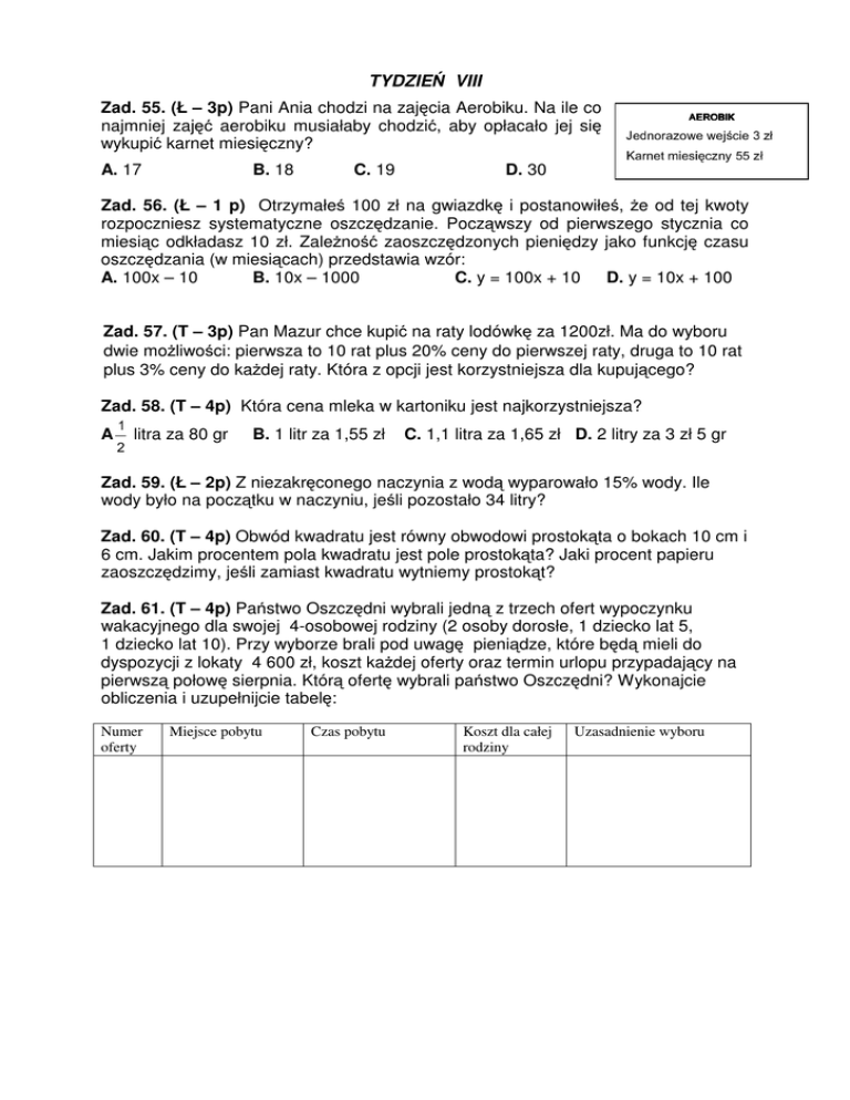 TYDZIEŃ VIII Zad. 55. (Ł – 3p) Pani Ania chodzi na zajęcia Aerobiku. Na ile co najmniej zajęć aerobiku musiałaby chodzić, aby opłacało jej się wykupić karnet miesięczny? A. 17 B. 18 C. 19 D. 30 AEROBIK Jednorazowe wejście 3 zł Karnet miesięczny 55 zł Zad. 56. (Ł – 1 p) Otrzymałeś 100 zł na gwiazdkę i postanowiłeś, że od tej kwoty rozpoczniesz systematyczne oszczędzanie. Począwszy od pierwszego stycznia co miesiąc odkładasz 10 zł. Zależność zaoszczędzonych pieniędzy jako funkcję czasu oszczędzania (w miesiącach) przedstawia wzór: A. 100x – 10 B. 10x – 1000 C. y = 100x + 10 D. y = 10x + 100 Zad. 57. (T – 3p) Pan Mazur chce kupić na raty lodówkę za 1200zł. Ma do wyboru dwie możliwości: pierwsza to 10 rat plus 20% ceny do pierwszej raty, druga to 10 rat plus 3% ceny do każdej raty. Która z opcji jest korzystniejsza dla kupującego? Zad. 58. (T – 4p) Która cena mleka w kartoniku jest najkorzystniejsza? A 1 2 litra za 80 gr B. 1 litr za 1,55 zł C. 1,1 litra za 1,65 zł D. 2 litry za 3 zł 5 gr Zad. 59. (Ł – 2p) Z niezakręconego naczynia z wodą wyparowało 15% wody. Ile wody było na początku w naczyniu, jeśli pozostało 34 litry? Zad. 60. (T – 4p) Obwód kwadratu jest równy obwodowi prostokąta o bokach 10 cm i 6 cm. Jakim procentem pola kwadratu jest pole prostokąta? Jaki procent papieru zaoszczędzimy, jeśli zamiast kwadratu wytniemy prostokąt? Zad. 61. (T – 4p) Państwo Oszczędni wybrali jedną z trzech ofert wypoczynku wakacyjnego dla swojej 4-osobowej rodziny (2 osoby dorosłe, 1 dziecko lat 5, 1 dziecko lat 10). Przy wyborze brali pod uwagę pieniądze, które będą mieli do dyspozycji z lokaty 4 600 zł, koszt każdej oferty oraz termin urlopu przypadający na pierwszą połowę sierpnia. Którą ofertę wybrali państwo Oszczędni? Wykonajcie obliczenia i uzupełnijcie tabelę: Numer oferty Miejsce pobytu Czas pobytu Koszt dla całej rodziny Uzasadnienie wyboru Oferta I Włochy- Wybrzeże Liguryjskie Wybrzeże Liguryjskie, zwane również włoskim Lazurowe Wybrzeże, to jedno z najpiękniejszych miejsc we Włoszech. Program: - Wycieczka w góry szlakiem Alp Nadmorskich - Zajęcia sportowe i plażowanie - Wycieczka do Genui - Wycieczka do Monako Terminy i ceny: 04.07-13.07 1190 zł 11.07-20.07 1290 zł 18.07-27.07 1290 zł 25.07-03.08 1290 zł 01.08-10.08 1290 zł 08.08-17.08 1290 zł 15.08-24.08 1190 zł 22.08-31.08 1090 zł Cena obejmuje: 7 noclegów (pokoje 3,4 osobowe z łazienkami), Wyżywienie: śniadanie, lunche, obiadokolacje, transport: luksusowy autokar (klimatyzacja, barek, video, w.c.) opiekę rezydenta i ubezpieczenie. Uwaga ! dzieci do lat 6 - pobyt bezpłatny dzieci do lat 12 - 25% zniżki Oferta II Hiszpania -Wybrzeże Costa Brava Tylko na Costa Brava morze ma odcień Błękitu. Program: - Zajęcia sportowo- rekreacyjne na plaży - Zwiedzanie miejsca pobytu - Całodzienna wycieczka autokarowa do Barcelony - Wycieczka stateczkiem wzdłuż wybrzeża Costa Brava Terminy i ceny: 30.06-03.07 1595 zł 09.07-22.07 1795 zł 19.07-31.07 1795 zł 27.07-09.08 1795 zł 02.08-15.08 1795 zł 14.08-27.08 1695 zł Cena obejmuje: 9 noclegów (pokoje 3,4 osobowe z łazienkami), Wyżywienie: śniadanie, lunche, obiadokolacje, transport, opiekę rezydenta i ubezpieczenie. Uwaga ! dzieci do lat 6 - pobyt bezpłatny dzieci do lat 12 - 35% zniżki Oferta III Grecja – wyspa Thassos Thassos jest też idealnym miejscem do odpoczynku. Piękne okolice, gościnność Greków stawiają tę wyspę na szczycie najbardziej atrakcyjnych miejsc w Grecji. Program: - Wycieczka statkiem – piracki rejs - Kąpiel, plażowanie i zajęcia sportowe - Zwiedzanie wyspy – całodzienna wycieczka autokarowa Terminy i ceny: 22.06-06.07 990 zł 05.07-19.07 1100 zł 16.07-30.07 1100 zł 01.08-15.08 1100 zł 14.08-28.08 1000 zł Cena obejmuje: 12 noclegów (pokoje 3,4 osobowe z łazienkami), Wyżywienie: śniadanie, lunche, obiadokolacje, Transport autokarem turystycznym, opiekę rezydenta i ubezpieczenie. Uwaga ! dzieci do lat 6 - 15% zniżki BANK, ODSETKI, LOKATY Zad. 62. (Ł – 2p) Bank pobiera za usługę opłatę (zwaną prowizją) wynoszącą 0,5% wpłacanej kwoty, lecz nie mniej niż 4,50 zł. Za rachunek telefoniczny na kwotę 800 zł prowizja wynosi: A. 4 zł B. 4,50 zł C. 8 zł D. 40 zł 2