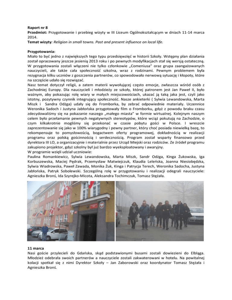 Raport nr 8 Przedmiot: Przygotowanie i przebieg wizyty w III Liceum Ogólnokształcącym w dniach 11-14 marca 2014. Temat wizyty: Religion in small towns. Past and present influence on local life. Przygotowania: Miało to być jedno z największych tego typu przedsięwzięć w historii Szkoły. Wstępny plan działania został opracowany jeszcze jesienią 2013 roku i po pewnych modyfikacjach stał się wersją ostateczną. W przygotowania zostali włączeni nie tylko członkowie „Comeniusa” oraz grupa zaangażowanych nauczycieli, ale także cała społeczność szkolna, wraz z rodzinami. Pewnym problemem była rezygnacja kilku uczniów z goszczenia partnerów, co spowodowało nerwową sytuację i kłopoty, które na szczęście udało się rozwiązać. Nasz temat dotyczył religii, a zatem materii wywołującej często emocje, zwłaszcza wśród osób z Zachodniej Europy. Dla nauczycieli i młodzieży ze szkoły, której patronem jest Jan Paweł II, było ważnym, aby pokazując rolę wiary w małych miejscowościach, ukazać ją taką jaka jest, czyli jako istotny, pozytywny czynnik integrujący społeczność. Nasze ankieterki ( Sylwia Lewandowska, Marta Miszk i Sandra Odżga) udały się do Fromborka, by zebrać odpowiednie materiały. Uczennice Weronika Sadoch i Justyna Jabłońska przygotowały film o Fromborku, gdyż z powodu braku czasu zdecydowaliśmy się na pokazanie naszego „małego miasta” w formie wirtualnej. Kolejnym naszym celem było przełamanie pewnych negatywnych stereotypów, które wciąż pokutują na Zachodzie, o czym kilkakrotnie mogliśmy się przekonać w czasie pobytu gości w Polsce. I wreszcie zaprezentowanie się jako w 100% wiarygodny i pewny partner, który choć posiada niewielką bazę, to rekompensuje to pomysłowością, bogactwem oferty programowej, dokładnością w realizacji programu oraz polską gościnnością i serdecznością. Program został wsparty finansowo przed dyrektora III LO, a organizacyjnie i materialnie przez Urząd Miejski oraz rodziców. Ze źródeł programu zakupiono projektor, gdyż szkolny był już bardzo wyeksploatowany i awaryjny. W programie wzięli udział uczniowie: Paulina Romankiewicz, Sylwia Lewandowska, Marta Miszk, Sandr Odżga, Kinga Żukowska, Iga Korbuszewska, Maciej Pędrak, Przemysław Matwiejczuk, Klaudia Leleńska, Joanna Niesiobędzka, Sylwia Wiadrowska, Paweł Zawada, Monika Żuk, Kinga i Patrycja Terech, Weronika Sadocha, Justyna Jabłońska, Patryk Sobolewski. Szczególną rolę w przygotowaniu i realizacji odegrali nauczyciele: Agnieszka Bronś, Ida Szyrejko-Micota, Aleksandra Tochimczuk, Tomasz Stężała. 11 marca Nasi goście przylecieli do Gdańska, skąd podstawionymi busami zostali dowiezieni do Elbląga. Młodzież odebrała swoich partnerów a nauczyciele zostali zakwaterowani w hotelu. Na powitalnej kolacji spotkał się z nimi Dyrektor Szkoły – Jan Zaborowski oraz koordynator Tomasz Stężała i Agnieszka Bronś. 12 marca Pierwszy, oficjalny dzień wizyty rozpoczął się od powitania uczestników przez Dyrektora Szkoły, przedstawienia programu oraz szczegółowego omówienia zadań. Po zwiedzeniu budynku III LO, uczniowie i część nauczycieli zobaczyła 2 lekcje prowadzone przez polskich nauczycieli. W tym czasie koordynatorzy projektu rozmawiali na temat realizacji projektu, przygotowania raportów końcowych i podsumowań oraz ewentualnego kontynuowania tematyki małych miast w kolejnej edycji, tym razem Erasmus’a. Uczniowie z Danii i Włoch przedstawili swoje prezentacje dotyczące religijności i roli wiary w życiu ich miejscowości. Wśród polskich uczestników programu ( młodzieży) obraz postępującej ateizacji w obydwu krajach wywołał spore komentarze. Około godziny 13 młodzież wyszła do miasta by wziąć udział w grze miejskiej poświęconej Janowi Pawłowi II oraz najważniejszym obiektom sakralnym Elbląga, a nauczyciele zwiedzili elbląską starówkę. Po lunchu i po krótkiej przerwie, o 17.00, grupa ponownie zebrała się w Młodzieżowym Domu Kultury, gdzie uczniowie naszej szkoły, kierowani przez panią Annę Lasek, pokazali przedstawienie w języku angielskim „ And then, there were none, except two”, według prozy Agaty Christie. Przedstawienie, którego premiera zbiegła się z Comeniusem, wywołała najpierw salwy śmiechu, a potem długotrwałe oklaski. Natychmiast po przedstawieniu przeszliśmy do pobliskiego kościoła pod wezwaniem Miłosierdzia Bożego, na mszę świętą. Udział aż czterech księży, śpiewy, liczny udział, a także żywy kontakt między wiernymi a kapłanami były dla nauczycieli i naszych gości wielkim zaskoczeniem. Tym bardziej, że kapłani zwrócili się do naszych gości po włosku i niemiecku. Nasz pomysł, aby pokazać religijność „u źródeł” wypalił, czego dowodem były rozmowy i podziękowania. 13 marca Czwartek rozpoczął się od prezentacji w wykonaniu młodzieży z Kraju Basków, Niemiec i Norwegii, po czym przystąpiono do pracy w 4 zespołach, nad tematem związanym z określeniem roli religii w życiu młodzieży i małych społeczności. O 10.30 wyruszyliśmy do Gdańska. W pierwszej kolejności zwiedziliśmy Westerplatte, po którym oprowadził Tomasz Stężała. Następnie, w grupach zwiedziliśmy Stare Miasto, które na gościach wywarło wielkie wrażenie. Kilkoro nauczycieli wyraziło chęć przyjazdu na Wybrzeże choćby na weekend, aby lepiej poznać nasz region. Po powrocie, o 18.00, w szkole rozpoczęło się przyjęcie, czyli Pot luck. Uczniowie z III LO, przy pomocy rodziców przygotowali rozmaite dania kuchni polskiej. Jakość, różnorodność i smakowitość potraw zaskoczyła naszych gości, a spotkanie przebiegło w doskonałej atmosferze. 14 marca W piątek młodzież kończyła pracę nad tematyką religijna a następnie przedstawiła efekty w formie plakatów i wystąpień. Trzy kolejne ekipy ( Holendrzy, Austriacy, Polacy) przedstawili informacje na temat udziału religi