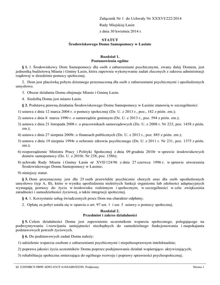 Załącznik Nr 1 do Uchwały Nr XXXVI/222/2014 Rady Miejskiej Łasin z dnia 30 kwietnia 2014 r. STATUT Środowiskowego Domu Samopomocy w Łasinie Rozdział 1. Postanowienia ogólne § 1. 1. Środowiskowy Dom Samopomocy dla osób z zaburzeniami psychicznymi, zwany dalej Domem, jest jednostką budżetową Miasta i Gminy Łasin, która zapewnia wykonywanie zadań zleconych z zakresu administracji rządowej w dziedzinie pomocy społecznej. 2. Dom jest placówką pobytu dziennego przeznaczoną dla osób z zaburzeniami psychicznymi i upośledzonych umysłowo. 3. Obszar działania Domu obejmuje Miasto i Gminę Łasin. 4. Siedzibą Domu jest miasto Łasin. § 2. Podstawę prawną działania Środowiskowego Domu Samopomocy w Łasinie stanowią w szczególności: 1) ustawa z dnia 12 marca 2004 r. o pomocy społecznej (Dz. U. z 2013 r., poz., 182 z późn. zm.); 2) ustawa z dnia 8 marca 1990 r. o samorządzie gminnym (Dz. U. z 2013 r., poz. 594 z późn. zm.); 3) ustawa z dnia 21 listopada 2008 r. o pracownikach samorządowych (Dz. U. z 2008 r. Nr 223, poz. 1458 z późn. zm.); 4) ustawa z dnia 27 sierpnia 2009r. o finansach publicznych (Dz. U. z 2013 r., poz. 885 z późn. zm.); 5) ustawa z dnia 19 sierpnia 1994r o ochronie zdrowia psychicznego (Dz. U. z 2011 r. Nr 231, poz. 1375 z późn. zm.); 6) rozporządzenie Ministra Pracy i Polityki Społecznej z dnia 09 grudnia 2010r w sprawie środowiskowych domów samopomocy (Dz. U. z 2010r. Nr 238, poz. 1586); 8) uchwała Rady Miasta i Gminy Łasin nr XVII/124/96 z dnia 27 czerwca 1996 r. w sprawie utworzenia Środowiskowego Domu Samopomocy w Łasinie; 9) niniejszy statut. § 3. Dom przeznaczony jest dla 25 osób przewlekle psychicznie chorych oraz dla osób upośledzonych umysłowo (typ A, B), które w wyniku upośledzenia niektórych funkcji organizmu lub zdolności adaptacyjnych wymagają pomocy do życia w środowisku rodzinnym i społecznym, w szczególności w celu zwiększenia zaradności i samodzielności życiowej, a także integracji społecznej. § 4. 1. Korzystanie usług świadczonych przez Dom ma charakter odpłatny. 2. Opłatę za pobyt ustala się w oparciu o art. 97 ust. 1 i ust. 5 ustawy o pomocy społecznej. Rozdział 2. Przedmiot i zakres działalności § 5. Celem działalności Domu jest zapewnienie uczestnikom wsparcia społecznego, polegającego na podtrzymywaniu i rozwijaniu umiejętności niezbędnych do samodzielnego funkcjonowania i zaspokajania podstawowych potrzeb życiowych. § 6. Do podstawowych zadań Domu należy: 1) udzielenie wsparcia osobom z zaburzeniami psychicznymi i niepełnosprawnym intelektualnie; 2) poprawa jakości życia uczestników Domu poprzez podejmowanie działań wspierająco- aktywizujących; 3) rehabilitacja społeczna zmierzająca do ogólnego rozwoju i poprawy sprawności psychospołecznej; Id: E2050BC9-9B9F-4D92-83CF-6104AB05EE90. Podpisany Strona 1 4) rozwijanie umiejętności w zakresie życia codziennego i funkcjonowania w społeczeństwie; 5) inspirowanie powstania sieci oparcia i samopomocy wśród uczestników Domu, ich rodzin i wzmocnienie więzi społecznych; 6) kształtowanie umiejętności samorealizacji i umiejętności spędzania wolnego czasu; 7) zapewnienie terapii zajęciowej zmierzającej do ogólnego rozwoju i umiejętności zawodowych. § 7. 1. Dom świadczy usługi w ramach indywidualnych lub zespołowych treningów samoobsługi i treningów umiejętności społecznych, polegających na nauce, rozwijaniu lub podtrzymywaniu umiejętności w zakresie czynności dnia codziennego i funkcjonowania w życiu społecznym. Usługi te obejmują w szczególności: 1) trening funkcjonowania w codziennym życiu, w tym: trening dbałości o wygląd zewnętrzny, trening nauki higieny, trening kulinarny, trening umiejętności praktycznych, trening gospodarowania własnymi środkami finansowymi; 2) trening umiejętności interpersonalnych i rozwiązywania problemów, w tym: kształtowanie pozytywnych relacji uczestnika z osobami bliskimi, sąsiadami, z innymi osobami w czasie zakupów, w środkach komunikacji publicznej, w urzędach, w instytucjach kultury; 3) trening umiejętności spędzania czasu wolnego, w tym: rozwijanie zainteresowań literaturą, audycjami radiowymi, telewizyjnymi, Internetem, udział w spotkaniach towarzyskich i kulturalnych; 4) poradnictwo psychologiczne; 5) pomoc w załatwianiu spraw urzędowych; 6) pomoc w dostępie do niezbędnych świadczeń zdrowotnych, w tym uzgadnianie i pilnowanie terminów wizyt u lekarza, pomoc w zakupie leków, pomoc w dotarciu do jednostek ochrony zdrowia; 7) niezbędną opiekę; 8) terapię ruchową, w tym: zajęcia sportowe, turystykę i rekreację; 9) inne formy postępowania przygotowujące do uczestnictwa w warsztatach terapii zajęciowej lub podjęcia zatrudnienia, w tym w warunkach pracy chronionej na przystosowanym stanowisku pracy. 2. Zakres i poziom świadczeń powinien być dostosowany do indywidualnych potrzeb i możliwości psychofizycznych osób w nim przebywających. § 8. Obowiązkiem osób korzystających ze świadczeń Domu jest w szczególności: 1) współdziałanie z pracownikami w zakresie zaspakajania własnych potrzeb; 2) przestrzeganie norm zasad współżycia oraz respektowania postanowień Statutu i Regulaminu Organizacyjnego Środowiskowego Domu Samopomocy; 3) przestrzeganie regulaminów wewnętrznych Domu. Rozdział 3. Zasady organizacji § 9. 1. Kierownika Domu zatrudnia i zwalnia Burmistrz Miasta i Gminy Łasin. 2. Zwierzchnikiem służbowym w stosunku do Kierownika jest Burmistrz Miasta i Gminy Łasin. 3. Kierownik wykonuje uprawnienia zwierzchnika służbowego w stosunku do pracowników Domu. 4. Organizację i szczegółowy zakres działania Domu określa Regulamin Organizacyjny, program działalności Domu i plany pracy Domu na każdy rok. 5. Kierownik Domu jest odpowiedzialny za opracowanie wyżej wymienionych dokumentów w uzgodnieniu z Wojewodą a dokumenty te zatwierdza Burmistrz Miasta i Gminy Łasin. 