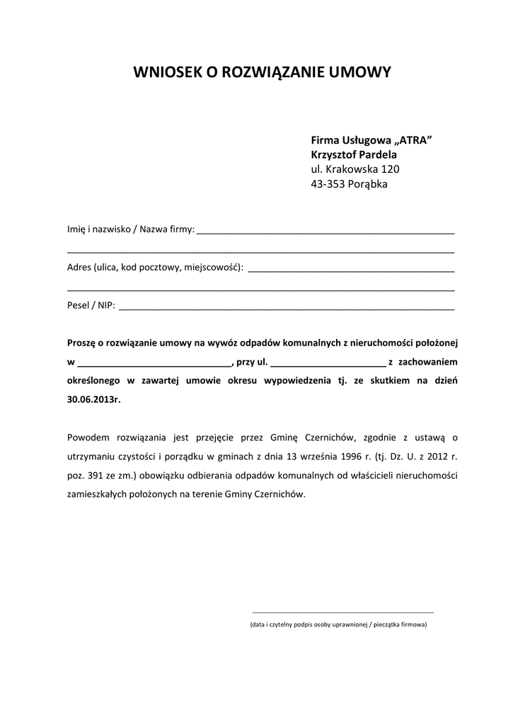 WNIOSEK O ROZWIĄZANIE UMOWY Firma Usługowa „ATRA” Krzysztof Pardela ul. Krakowska 120 43-353 Porąbka Imię i nazwisko / Nazwa firmy: __________________________________________________ ___________________________________________________________________________ Adres (ulica, kod pocztowy, miejscowość): ________________________________________ ___________________________________________________________________________ Pesel / NIP: _________________________________________________________________ Proszę o rozwiązanie umowy na wywóz odpadów komunalnych z nieruchomości położonej w , przy ul. z zachowaniem określonego w zawartej umowie okresu wypowiedzenia tj. ze skutkiem na dzień 30.06.2013r. Powodem rozwiązania jest przejęcie przez Gminę Czernichów, zgodnie z ustawą o utrzymaniu czystości i porządku w gminach z dnia 13 września 1996 r. (tj. Dz. U. z 2012 r. poz. 391 ze zm.) obowiązku odbierania odpadów komunalnych od właścicieli nieruchomości zamieszkałych położonych na terenie Gminy Czernichów. (data i czytelny podpis osoby uprawnionej / pieczątka firmowa)