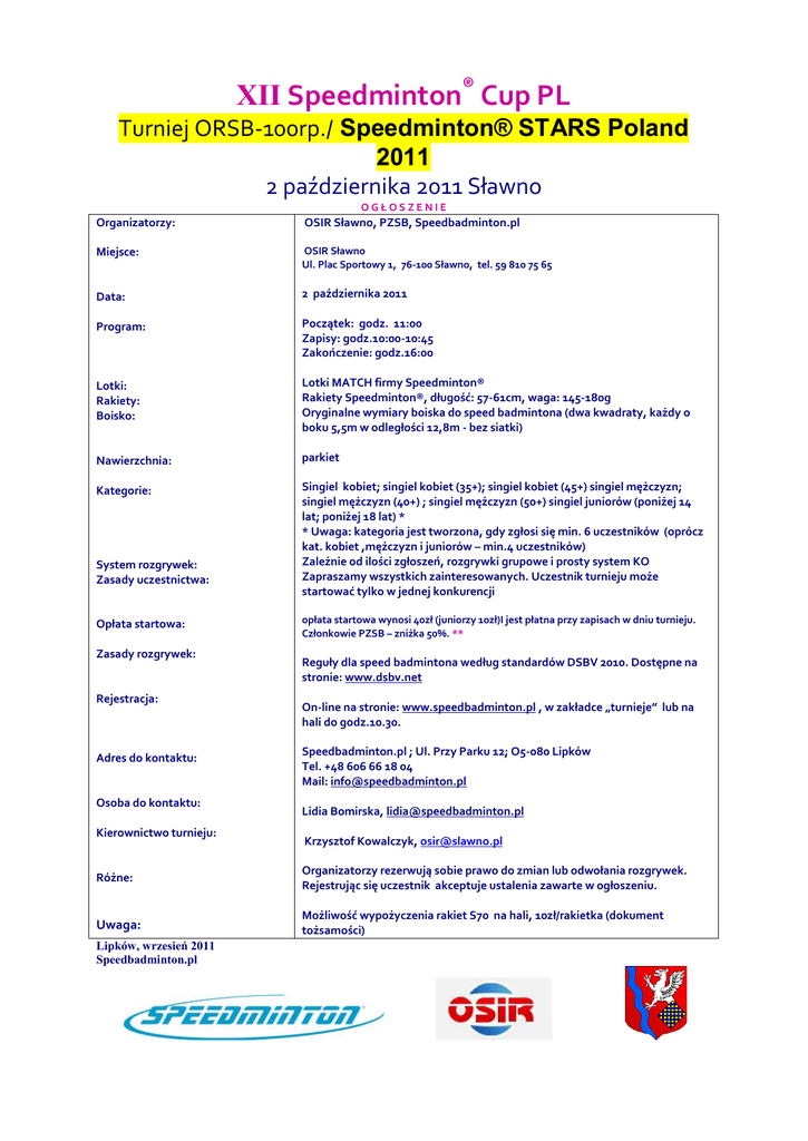 XII Speedminton® Cup PL Turniej ORSB-100rp./ Speedminton® STARS Poland 2011 2 października 2011 Sławno OGŁOSZENIE Organizatorzy: OSIR Sławno, PZSB, Speedbadminton.pl Miejsce: OSIR Sławno Ul. Plac Sportowy 1, 76-100 Sławno, tel. 59 810 75 65 Data: 2 października 2011 Program: Początek: godz. 11:00 Zapisy: godz.10:00-10:45 Zakończenie: godz.16:00 Lotki: Rakiety: Boisko: Lotki MATCH firmy Speedminton® Rakiety Speedminton®, długość: 57-61cm, waga: 145-180g Oryginalne wymiary boiska do speed badmintona (dwa kwadraty, każdy o boku 5,5m w odległości 12,8m - bez siatki) Nawierzchnia: parkiet Kategorie: Singiel kobiet; singiel kobiet (35+); singiel kobiet (45+) singiel mężczyzn; singiel mężczyzn (40+) ; singiel mężczyzn (50+) singiel juniorów (poniżej 14 lat; poniżej 18 lat) * * Uwaga: kategoria jest tworzona, gdy zgłosi się min. 6 uczestników (oprócz kat. kobiet ,mężczyzn i juniorów – min.4 uczestników) Zależnie od ilości zgłoszeń, rozgrywki grupowe i prosty system KO Zapraszamy wszystkich zainteresowanych. Uczestnik turnieju może startować tylko w jednej konkurencji System rozgrywek: Zasady uczestnictwa: Opłata startowa: Zasady rozgrywek: Rejestracja: Adres do kontaktu: Osoba do kontaktu: Kierownictwo turnieju: opłata startowa wynosi 40zł (juniorzy 10zł)I jest płatna przy zapisach w dniu turnieju. Członkowie PZSB – zniżka 50%. ** Reguły dla speed badmintona według standardów DSBV 2010. Dostępne na stronie: www.dsbv.net On-line na stronie: www.speedbadminton.pl , w zakładce „turnieje” lub na hali do godz.10.30. Speedbadminton.pl ; Ul. Przy Parku 12; O5-080 Lipków Tel. +48 606 66 18 04 Mail: [email protected] Lidia Bomirska, [email protected] Krzysztof Kowalczyk, [email protected] Różne: Organizatorzy rezerwują sobie prawo do zmian lub odwołania rozgrywek. Rejestrując się uczestnik akceptuje ustalenia zawarte w ogłoszeniu. Uwaga: Możliwość wypożyczenia rakiet S70 na hali, 10zł/rakietka (dokument tożsamości) Lipków, wrzesień 2011 Speedbadminton.pl