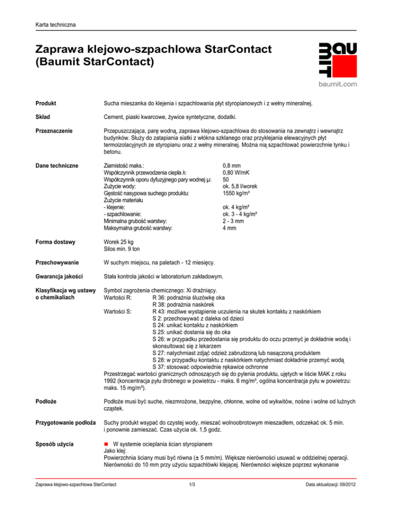 Karta techniczna Zaprawa klejowo-szpachlowa StarContact (Baumit StarContact) Produkt Sucha mieszanka do klejenia i szpachlowania płyt styropianowych i z wełny mineralnej. Skład Cement, piaski kwarcowe, żywice syntetyczne, dodatki. Przeznaczenie Przepuszczająca, parę wodną, zaprawa klejowo-szpachlowa do stosowania na zewnątrz i wewnątrz budynków. Służy do zatapiania siatki z włókna szklanego oraz przyklejania elewacyjnych płyt termoizolacyjnych ze styropianu oraz z wełny mineralnej. Można nią szpachlować powierzchnie tynku i betonu. Dane techniczne Ziarnistość maks.: Współczynnik przewodzenia ciepła λ: Współczynnik oporu dyfuzyjnego pary wodnej µ: Zużycie wody: Gęstość nasypowa suchego produktu: Zużycie materiału - klejenie: - szpachlowanie: Minimalna grubość warstwy: Maksymalna grubość warstwy: 0,8 mm 0,80 W/mK 50 ok. 5,8 l/worek 1550 kg/m³ ok. 4 kg/m² ok. 3 - 4 kg/m² 2 - 3 mm 4 mm Forma dostawy Worek 25 kg Silos min. 9 ton Przechowywanie W suchym miejscu, na paletach - 12 miesięcy. Gwarancja jakości Stała kontrola jakości w laboratorium zakładowym. Klasyfikacja wg ustawy o chemikaliach Symbol zagrożenia chemicznego: Xi drażniący. Wartości R: R 36: podrażnia śluzówkę oka R 38: podrażnia naskórek Wartości S: R 43: możliwe wystąpienie uczulenia na skutek kontaktu z naskórkiem S 2: przechowywać z daleka od dzieci S 24: unikać kontaktu z naskórkiem S 25: unikać dostania się do oka S 26: w przypadku przedostania się produktu do oczu przemyć je dokładnie wodą i skonsultować się z lekarzem S 27: natychmiast zdjąć odzież zabrudzoną lub nasączoną produktem S 28: w przypadku kontaktu z naskórkiem natychmiast dokładnie przemyć wodą S 37: stosować odpowiednie rękawice ochronne Przestrzegać wartości granicznych odnoszących się do pylenia produktu, ujętych w liście MAK z roku 1992 (koncentracja pyłu drobnego w powietrzu - maks. 6 mg/m³, ogólna koncentracja pyłu w powietrzu: maks. 15 mg/m³). Podłoże Podłoże musi być suche, niezmrożone, bezpylne, chłonne, wolne od wykwitów, nośne i wolne od luźnych cząstek. Przygotowanie podłoża Suchy produkt wsypać do czystej wody, mieszać wolnoobrotowym mieszadłem, odczekać ok. 5 min. i ponownie zamieszać. Czas użycia ok. 1,5 godz. Sposób użycia W systemie ocieplania ścian styropianem Jako klej: Powierzchnia ściany musi być równa (± 5 mm/m). Większe nierówności usuwać w oddzielnej operacji. Nierówności do 10 mm przy użyciu szpachlówki klejącej. Nierówności większe poprzez wykonanie Zaprawa klejowo-szpachlowa StarContact 1/3 Data aktualizacji: 09/2012 Karta techniczna warstwy tynku. Nanosić na płytę izolacyjną w postaci ciągłego garbu na obrzeżach i min. 3 punkty na środku płyty. Przy równym podłożu możliwe jest nanoszenie na całej powierzchni pacą zębatą. Kołkowanie płyty jest możliwe po min. 24 godzinach od klejenia. Jako warstwa szpachlowa: Na płasko ułożone na styk i przeszlifowane płyty styropianowe nanosić i wtapiać siatkę z włókna szklanego. Nierówności podłoża nie można wyrównywać warstwą zbrojoną siatki. Szczelin w płytach elewacyjnych nie wolno wypełniać szpachlówką klejącą. Jeśli warstwy zbrojeniowej nie naniesiono w ciągu 2 tygodni, należy płyty ponownie przeszlifować. Masę klejowo-szpachlową nanosić na podłoże pacą zębatą 10 mm, następnie wciskać pionowe pasy siatki zbrojeniowej z włókna szklanego - minimalny zakład siatki 10 cm -i szpachlować na równo świeżą masą klejowo-szpachlową. Siatka nie może być widoczna. Minimalna grubość szpachlówki 2 - 3 mm. W systemie ocieplania ścian wełną mineralną Jako klej: Ściana musi być równa (± 5 mm/m). Większe nierówności należy usuwać (wyrównywać) w oddzielnej operacji. Nierówności do 10 mm wyrównywać przy użyciu zaprawy klejowej. Nierówności większe poprzez warstwę tynku. Nanosić na płytę izolacyjną w postaci ciągłego garbu na brzegach i min. 3 punktów na środku płyty. Przy równym podłożu możliwe jest także nanoszenie całopowierzchniowe pacą zębatą. Min. 24 godz. po klejeniu należy płyty termoizolacyjne dodatkowo mocować kołkami ze stalowym trzpieniem. Jako warstwa wyrównawcza: Na ułożone równo na styk i umocowane kołkami płyty termoizolacyjne nanieść najpóźniej po 14 dniach jako warstwę wyrównawczą, przy pomocy nierdzewnej packi stalowej, zaprawę klejącą o grubości warstwy co najmniej 3 mm. Jako warstwa zbrojeniowa: Po min. trzydniowej przerwie na podłoże nanieść 10-milimetrową szpachlą ząbkowaną ponownie 2 - 3 mm warstwę zaprawy klejącej. Do świeżej zaprawy wciskać pionowe pasy siatki zbrojeniowej z włókna szklanego - minimalna zakładka: 10 cm - i dodając materiał równo zaszpachlować. Siatka nie może być widoczna. Minimalna grubość warstwy szpachlowej: 2 - 3 mm. Szpachlowanie na powłokach malarskich: Podłoże musi być równe, mocne, suche, bez wykwitów. Farba musi mocno przywierać do podłoża, nie może kredować. Luźne cząstki usuwać. Gruntownie oczyścić podłoże. Szpachlowanie na tynkach: Czyścić strumieniem pary, uzupełnić ubytki. Podłoże musi być równe, mocne, suche, bez wykwitów. Szpachlowanie na betonie: Gruntownie oczyścić agregatem z wodą pod wysokim ciśnieniem z użyciem środków czyszczących. Wskazówki: Powłoki wykończeniowe Nie pracować poniżej +5°C, na zamrożonym podłożu lub przy zapowiedzi mrozu. Nie dodawać środków przeciwmróżowych. Nie wolno szpachlować płyt elewacyjnych, narażonych przez dłuższy czas (ponad 14 dni) na promieniowanie ultrafioletowe. Konieczne ponowne przeszlifowanie i odkurzenie. Warstwa szpachlówki przed dalszą obróbką musi schnąć przynajmniej 7 dni. Przy ewentualnym szlifowaniu nie wolno uszkodzić siatki zbrojeniowej. Przy podwójnym zbrojeniu drugą warstwę szpachlówki nanosić najwcześniej po jednym dniu. Przy mocowaniu kołkami, usztyw