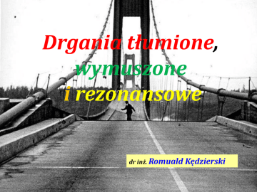 Drgania tłumione, wymuszone i rezonansowe dr inż. Romuald Kędzierski Drgania harmoniczne nietłumione Drgania harmoniczne tłumione – słabe tłumienie zależność wychylenia z położenia równowagi od czasu dla drgań swobodnych zależność wychylenia z położenia równowagi od czasu dla drgań tłumionych obwiednia ruchu tłumionego Przyjęte oznaczenia: - częstość drgań własnych - współczynnik tłumienia ośrodka - częstość drgań tłumionych Wnioski: najszybsze dojście do stanu równowagi! Drgania wymuszone – rezonans mechaniczny Przyjęte założenia: - na ciało (o masie m) wykonujące drgania harmoniczne zaczęła działać (na kierunku ruchu ciała) siła wymuszająca, okresowo zmienna dana zależnością: - częstość drgań wymuszających Amplituda drgań wymuszonych przez założoną siłę dana jest wzorem: Gdy amplituda ta osiąga wartość maksymalną, to mówimy o rezonansie mechanicznym. Ma to miejsce, jeżeli spełniony jest warunek: Wnioski: przy braku tłumienia: Rezonans - zjawisko przekazywania energii z jednego układu drgającego do innego; warunkiem koniecznym dla jego zaistnienia są identyczne częstości drgań własnych obu układów. Krzywe rezonansu dla różnych wartości współczynnika tłumienia Najbardziej znane (niekorzystne) skutki zaistnienia rezonansu 1. Most w pobliżu Manchesteru w Anglii załamał się pod rytmicznymi krokami zaledwie 60 ludzi. 2. Batalion piechoty francuskiej, przechodzący równym krokiem przez most w Angers. Most runął grzebiąc pod sobą 280 żołnierzy. 3. Zawalenie się mostu wiszącego w Tacoma (USA). Rano 7 listopada 1940 roku sztorm wiejący od oceanu (56-67 km/h), wprowadził most w drgania. Około 10:30 nastąpiło pierwsze załamanie jednej z płyt pomostu, a ok. 11:00 most rozpadł się ostatecznie. Nie było ofiar w ludziach. Jedyną ofiarą śmiertelną był, należący do Leonarda Coatswortha, czarny, trójnogi cocker spanielo imieniu Tubby, który spadł do wody, uwięziony w widocznym na filmie czarnym samochodzie. Most został odbudowany według zmodyfikowanego projektu i otwarty ponownie 15 października 1950 roku.