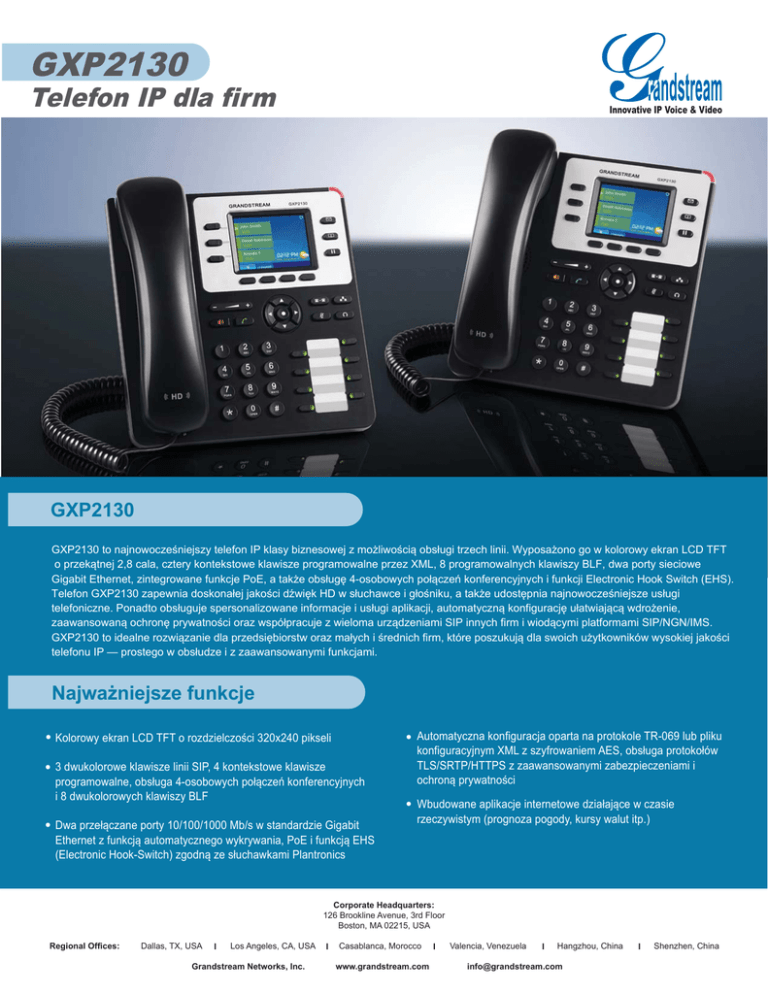 GXP2130 Telefon IP dla firm Innovative IP Voice & Video GXP2130 GXP2130 to najnowocześniejszy telefon IP klasy biznesowej z możliwością obsługi trzech linii. Wyposażono go w kolorowy ekran LCD TFT o przekątnej 2,8 cala, cztery kontekstowe klawisze programowalne przez XML, 8 programowalnych klawiszy BLF, dwa porty sieciowe Gigabit Ethernet, zintegrowane funkcje PoE, a także obsługę 4-osobowych połączeń konferencyjnych i funkcji Electronic Hook Switch (EHS). Telefon GXP2130 zapewnia doskonałej jakości dźwięk HD w słuchawce i głośniku, a także udostępnia najnowocześniejsze usługi telefoniczne. Ponadto obsługuje spersonalizowane informacje i usługi aplikacji, automatyczną konfigurację ułatwiającą wdrożenie, zaawansowaną ochronę prywatności oraz współpracuje z wieloma urządzeniami SIP innych firm i wiodącymi platformami SIP/NGN/IMS. GXP2130 to idealne rozwiązanie dla przedsiębiorstw oraz małych i średnich firm, które poszukują dla swoich użytkowników wysokiej jakości telefonu IP — prostego w obsłudze i z zaawansowanymi funkcjami. Najważniejsze funkcje • Kolorowy ekran LCD TFT o rozdzielczości 320x240 pikseli • Automatyczna konfiguracja oparta na protokole TR-069 lub pliku konfiguracyjnym XML z szyfrowaniem AES, obsługa protokołów TLS/SRTP/HTTPS z zaawansowanymi zabezpieczeniami i ochroną prywatności • Wbudowane aplikacje internetowe działające w czasie rzeczywistym (prognoza pogody, kursy walut itp.) • 3 dwukolorowe klawisze linii SIP, 4 kontekstowe klawisze programowalne, obsługa 4-osobowych połączeń konferencyjnych i 8 dwukolorowych klawiszy BLF • Dwa przełączane porty 10/100/1000 Mb/s w standardzie Gigabit Ethernet z funkcją automatycznego wykrywania, PoE i funkcją EHS (Electronic Hook-Switch) zgodną ze słuchawkami Plantronics Corporate Headquarters: 126 Brookline Avenue, 3rd Floor Boston, MA 02215, USA Regional Offices: Dallas, TX, USA I Los Angeles, CA, USA Grandstream Networks, Inc. I Casablanca, Morocco www.grandstream.com I Valencia, Venezuela I Hangzhou, China [email protected] I Shenzhen, China GXP2130 Innovative IP Voice & Video Protokoły i standardy Interfejsy sieciowe Ekran graficzny Dane techniczne telefonu SIP RFC3261, TCP/IP/UDP, RTP/RTCP, HTTP/HTTPS, ARP, ICMP, DNS (rekord A, SRV, NAPTR), DHCP, PPPoE, TELNET, TFTP, NTP, STUN, SIMPLE, LLDP, LDAP, TR-069, 802.1x, TLS, SRTP, IPv6 Dwa przełączane porty 10/100/1000 Mb/s w standardzie Gigabit Ethernet z funkcją automatycznego wykrywania i zintegrowaną technologią PoE 2kolorowy LCD TFT o przekątnej 2,8 cala (320x240) 3 klawisze linii do obsługi maksymalnie 3 kont SIP, 8 klawiszy szybkiego wybierania/BLF z dwukolorowymi diodami LED, Klawisze funkcji 4 kontekstowe klawisze programowalne, 5 klawiszy nawigacyjnych/menu, 11 klawiszy funkcyjnych: Wiadomość (z diodą LED), Książka telefoniczna, Przekazywanie, Konferencja, Wstrzymanie, Słuchawka, Wyciszenie, Wysyłanie/ponowne wybieranie, Głośnik, Zwiększenie głośności, Zmniejszenie głośności Kodeki głosowe Porty urządzeń dodatkowych Obsługa kodeków G.729A/B, G.711μ/a-law, G.726, G.722 (szerokopasmowy) oraz iLBC, wybieranie DTMF w paśmie i poza pasmem (sygnał wejściowy audio, RFC2833, SIP INFO) Gniazdo słuchawki RJ9 (do obsługi funkcji EHS w słuchawkach Plantronics) Wstrzymanie, przekazywanie, przekierowanie, 4-osobowe połączenia konferencyjne, parkowanie połączenia, odbieranie rozmowy, symulacja połączenia współdzielonego (SCA) symulacja połączenia mostkowego (BLA), pobieranie książki telefonicznej Funkcje telefoniczne (XML, LDAP, maksymalnie 2000 pozycji), połączenie oczekujące, rejestr połączeń (maksymalnie 500 rekordów), dostosowywanie ekranu, automatyczne wybieranie po podniesieniu słuchawki, automatyczna sekretarka, wybieranie kliknięciem, elastyczny plan wybierania numerów, współdzielenie telefonu (hot desking), personalizowane dzwonki muzyczne i muzyka podczas wstrzymania połączenia, redundancja i tryb awaryjny serwera Przykładowe aplikacje Prognoza pogody, kursy walut, dostępny interfejs GMI do programowania zaawansowanych aplikacji niestandardowych Dźwięk HD YTak, w słuchawce i głośniku Podstawka biurkowa Tak, dwupozycyjna Montaż naścienny Tak QoS warstwa 2 (802.1Q, 802.1p) i warstwa 3 (ToS, DiffServ, MPLS) Zabezpieczenia Obsługa wielu języków Hasła użytkownika i administratora, uwierzytelnianie MD5 i MD5-sess, plik konfiguracyjny z szyfrowaniem AES, SRTP, TLS, kontrola dostępu do multimediów 802.1x Angielski, arabski, chiński, chorwacki, czeski, francuski, hebrajski, hiszpański, holenderski, japoński, koreański, niemiecki, polski, portugalski, rosyjski, słoweński, turecki, włoski, węgierski Uaktualnianie i dostarczanie danych Uaktualnienie oprogramowania układowego przez TFTP/HTTP/HTTPS, konfigurowanie grupowe przez TR-069 lub szyfrowany Zasilanie i tryb oszczędzania energii Zasilacz uniwersalny w zestawie: wejście: 100–240 V; wyjście: +12 V prądu stałego, 0,5 A (6 W) Parametry techniczne plik konfiguracyjny XML Zintegrowana technologia PoE (Power-over-Ethernet) 802.3af, klasa 2 Wymiary: 193 mm (szer.) x 211 mm (dł.) x 85 mm (wys.) Masa urządzenia: 0,81 kg; masa z opakowaniem: 1,44kg Temperatura i wilgotność 0–40ºC (32–104ºF), 10–90% (bez kondensacji) Zawartość opakowania Telefon GXP2130, słuchawka z przewodem, podstawka biurkowa, zasilacz uniwersalny, kabel sieciowy, skrócona instrukcja obsługi Zgodność FCC Część 15 Klasa B; EN55022 Klasa B, EN61000-3-2, EN61000-3-3, EN55024, EN 60950-1 RCM: AS/ACIF S004; AS/NZS CISPR22/24; AS/NZS 60950