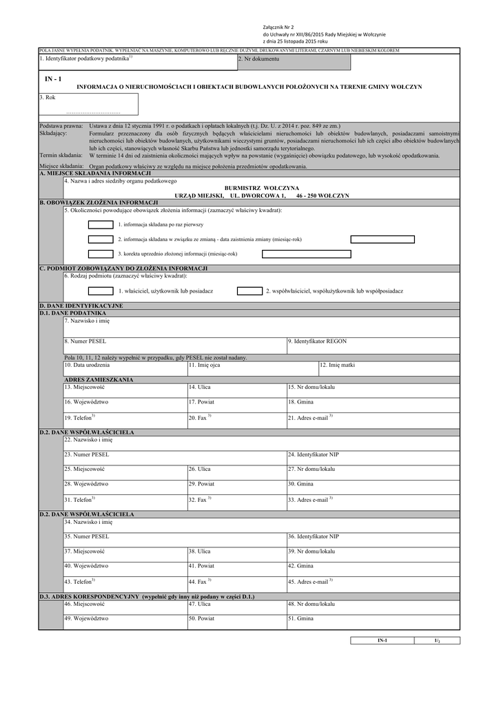 Załącznik Nr 2 do Uchwały nr XIII/86/2015 Rady Miejskiej w Wołczynie z dnia 25 listopada 2015 roku POLA JASNE WYPEŁNIA PODATNIK. WYPEŁNIAĆ NA MASZYNIE, KOMPUTEROWO LUB RĘCZNIE DUŻYMI, DRUKOWANYMI LITERAMI, CZARNYM LUB NIEBIESKIM KOLOREM 1. Identyfikator podatkowy podatnika1) 2. Nr dokumentu IN - 1 INFORMACJA O NIERUCHOMOŚCIACH I OBIEKTACH BUDOWLANYCH POŁOŻONYCH NA TERENIE GMINY WOŁCZYN 3. Rok ………………………… Podstawa prawna: Składający: Termin składania: Ustawa z dnia 12 stycznia 1991 r. o podatkach i opłatach lokalnych (t.j. Dz. U. z 2014 r. poz. 849 ze zm.) Formularz przeznaczony dla osób fizycznych będących właścicielami nieruchomości lub obiektów budowlanych, posiadaczami samoistnymi nieruchomości lub obiektów budowlanych, użytkownikami wieczystymi gruntów, posiadaczami nieruchomości lub ich części albo obiektów budowlanych lub ich części, stanowiących własność Skarbu Państwa lub jednostki samorządu terytorialnego. W terminie 14 dni od zaistnienia okoliczności mających wpływ na powstanie (wygaśnięcie) obowiązku podatowego, lub wysokość opodatkowania. Miejsce składania: Organ podatkowy właściwy ze względu na miejsce położenia przedmiotów opodatkowania. A. MIEJSCE SKŁADANIA INFORMACJI 4. Nazwa i adres siedziby organu podatkowego BURMISTRZ WOŁCZYNA URZĄD MIEJSKI, UL. DWORCOWA 1, 46 - 250 WOŁCZYN B. OBOWIĄZEK ZŁOŻENIA INFORMACJI 5. Okoliczności powodujące obowiązek złożenia informacji (zaznaczyć właściwy kwadrat): 1. informacja składana po raz pierwszy 2. informacja składana w związku ze zmianą - data zaistnienia zmiany (miesiąc-rok) 3. korekta uprzednio złożonej informacji (miesiąc-rok) C. PODMIOT ZOBOWIĄZANY DO ZŁOŻENIA INFORMACJI 6. Rodzaj podmiotu (zaznaczyć właściwy kwadrat): 1. właściciel, użytkownik lub posiadacz 2. współwłaściciel, współużytkownik lub współposiadacz D. DANE IDENTYFIKACYJNE D.1. DANE PODATNIKA 7. Nazwisko i imię 8. Numer PESEL 9. Identyfikator REGON Pola 10, 11, 12 należy wypełnić w przypadku, gdy PESEL nie został nadany. 10. Data urodzenia 11. Imię ojca 12. Imię matki ADRES ZAMIESZKANIA 13. Miejscowość 14. Ulica 15. Nr domu/lokalu 16. Województwo 17. Powiat 18. Gmina 19. Telefon3) 20. Fax 3) 21. Adres e-mail 3) D.2. DANE WSPÓŁWŁAŚCICIELA 22. Nazwisko i imię 23. Numer PESEL 24. Identyfikator NIP 25. Miejscowość 26. Ulica 27. Nr domu/lokalu 28. Województwo 29. Powiat 30. Gmina 31. Telefon3) 32. Fax 3) 33. Adres e-mail 3) D.2. DANE WSPÓŁWŁAŚCICIELA 34. Nazwisko i imię 35. Numer PESEL 36. Identyfikator NIP 37. Miejscowość 38. Ulica 39. Nr domu/lokalu 40. Województwo 41. Powiat 42. Gmina 43. Telefon3) 44. Fax 3) 45. Adres e-mail 3) D.3. ADRES KORESPONDENCYJNY (wypełnić gdy inny niż podany w części D.1.) 46. Miejscowość 47. Ulica 49. Województwo 50. Powiat 48. Nr domu/lokalu 51. Gmina IN-1 1/2 POLA JASNE WYPEŁNIA PODATNIK. WYPEŁNIAĆ NA MASZYNIE, KOMPUTEROWO LUB RĘCZNIE DUŻYMI, DRUKOWANYMI LITERAMI, CZARNYM LUB NIEBIESKIM KOLOREM 1) E. DANE DOTYCZĄCE PRZEDMIOTÓW OPODATKOWANIA NIEPODLEGAJĄCYCH ZWOLNIENIU Podstawa opodatkowania w m2 (ha) z dokładnością do 1 m2 E.1. POWIERZCHNIA GRUNTÓW 1. Związane z prowadzeniem działalności gospodarczej, bez względu na sposób zakwalifikowania w ewidencji gruntów i budynków 52. m2 2. Pod wodami powierzchniowymi stojącymi lub wodami powierzchniowymi płynącymi 53. jezior i zbiorników sztucznych2) ha 3. Pozostałe grunty, w tym zajęte na prowadzenie odpłatnej statutowej działalności pożytku 54. publicznego przez organizacje pożytku publicznego m2 4. Niezabudowane objęte obszarem rewitalizacji, o którym mowa w ustawie z dnia 55. 9 października 2015 roku o rewitalizacji, i położone na terenach, dla których miejscowy plan zagospodarowania przestrzennego przewiduje przeznaczenie pod zabudowę mieszkaniową, usługową albo zabudowę o przeznaczeniu mieszanym obejmującym wyłącznie te rodzaje zabudowy, jeżeli od dnia wejścia w życie tego planu w odniesieniu do tych gruntów upłynął okres 4 lat, a w tym czasie nie zakończono budowy zgodnie z przepisami prawa budowlanego m2 E.2. POWIERZCHNIA BUDYNKÓW LUB ICH CZĘŚCI Podstawa opodatkowania w m2 1. Mieszkalne - ogółem 56. m2 w tym kondygnacji o wysokości : - od 1,40 do 2,20 m (zaliczyć 50% powierzchni) - powyżej 2,20 m 57. m2 58. m2 2. Związane z prowadzeniem działalności gospodarczej oraz budynki mieszkalne lub ich 59. części zajęte na prowadzenie działalności gospodarczej - ogółem w tym - od 1,40 do 2,20 m 60. (zaliczyć 50% powierzchni) kondygnacji o wysokości : - powyżej 2,20 m 61. m2 m2 m2 3. Zajęte na prowadzenie działalności gospodarczej w zakresie obrotu kwalifikowanym 62. materiałem siewnym - ogółem w tym - od 1,40 do 2,20 m 63. kondygnacji (zaliczyć 50% powierzchni) o wysokości : - powyżej 2,20 m 64. m2 m2 m2 4. Związane z udzielaniem świadczeń zdrowotnych w rozumieniu przepisów o działalności leczniczej, zajętych przez podmioty udzielające tych świadczeń - ogółem 65. w tym kondygnacji o wysokości : 66. - od 1,40 do 2,20 m (zaliczyć 50% powierzchni) - powyżej 2,20 m m2 m2 67. m2 5. Pozostałe, w tym zajęte na prowadzenie odpłatnej statutowej działalności pożytku publicznego przez organizacje pożytku publicznego - ogółem w tym - od 1,40 do 2,20 m (zaliczyć 50% powierzchni) kondygnacji o wysokości : - powyżej 2,20 m 68. m2 69. m2 70. m2 Podstawa opodatkowania w zł E.3. WARTOŚĆ BUDOWLI LUB ICH CZĘŚCI ZWIĄZANYCH Z PROWADZENIEM DZIAŁALNOŚCI GOSPODARCZEJ (wartość określona na podstawie art. 4 ust. 1 pkt 3 i ust. 3 - 7 ustawy o podatkach i opłatach lokalnych) z dokładnością do 1 zł 71. Budowle zł F. INFORMACJA O ZAŁĄCZNIKACH (do niniejszej informacji dołączono) 72. Liczba załączników ZRNL 73. Załącznik ZN-1 składany: szt. Tak 74. WSP Nie 75. Inne: szt. szt. 4) G. PODPIS PODATNIKA/OSOBY REPREZENTUJĄCEJ PODATNIKA 76. Imię 77. Nazwis