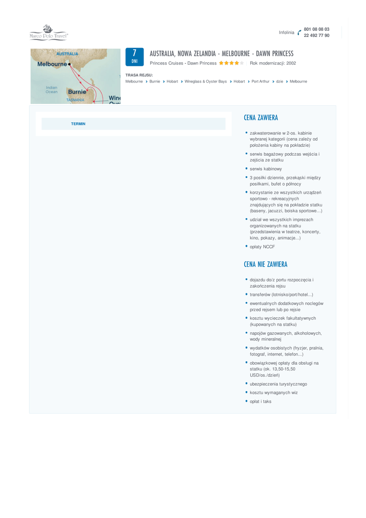 Infolinia 7 AUSTRALIA, NOWA ZELANDIA - MELBOURNE - DAWN PRINCESS DNI Princess Cruises - Dawn Princess 801 08 08 03 22 492 77 90 | Rok modernizacji: 2002 TRASA REJSU: Melbourne TERMIN Burnie Hobart Wineglass & Oyster Bays Hobart Port Arthur dzie Melbourne CENA ZAWIERA zakwaterowanie w 2-os. kabinie wybranej kategorii (cena zależy od położenia kabiny na pokładzie) serwis bagażowy podczas wejścia i zejścia ze statku serwis kabinowy 3 posiłki dziennie, przekąski między posiłkami, bufet o północy korzystanie ze wszystkich urządzeń sportowo - rekreacyjnych znajdujących się na pokładzie statku (baseny, jacuzzi, boiska sportowe…) udział we wszystkich imprezach organizowanych na statku (przedstawienia w teatrze, koncerty, kino, pokazy, animacje...) opłaty NCCF CENA NIE ZAWIERA dojazdu do/z portu rozpoczęcia i zakończenia rejsu transferów (lotnisko/port/hotel...) ewentualnych dodatkowych noclegów przed rejsem lub po rejsie kosztu wycieczek fakultatywnych (kupowanych na statku) napojów gazowanych, alkoholowych, wody mineralnej wydatków osobistych (fryzjer, pralnia, fotograf, internet, telefon...) obowiązkowej opłaty dla obsługi na statku (ok. 13,50-15,50 USD/os./dzień) ubezpieczenia turystycznego kosztu wymaganych wiz opłat i taks