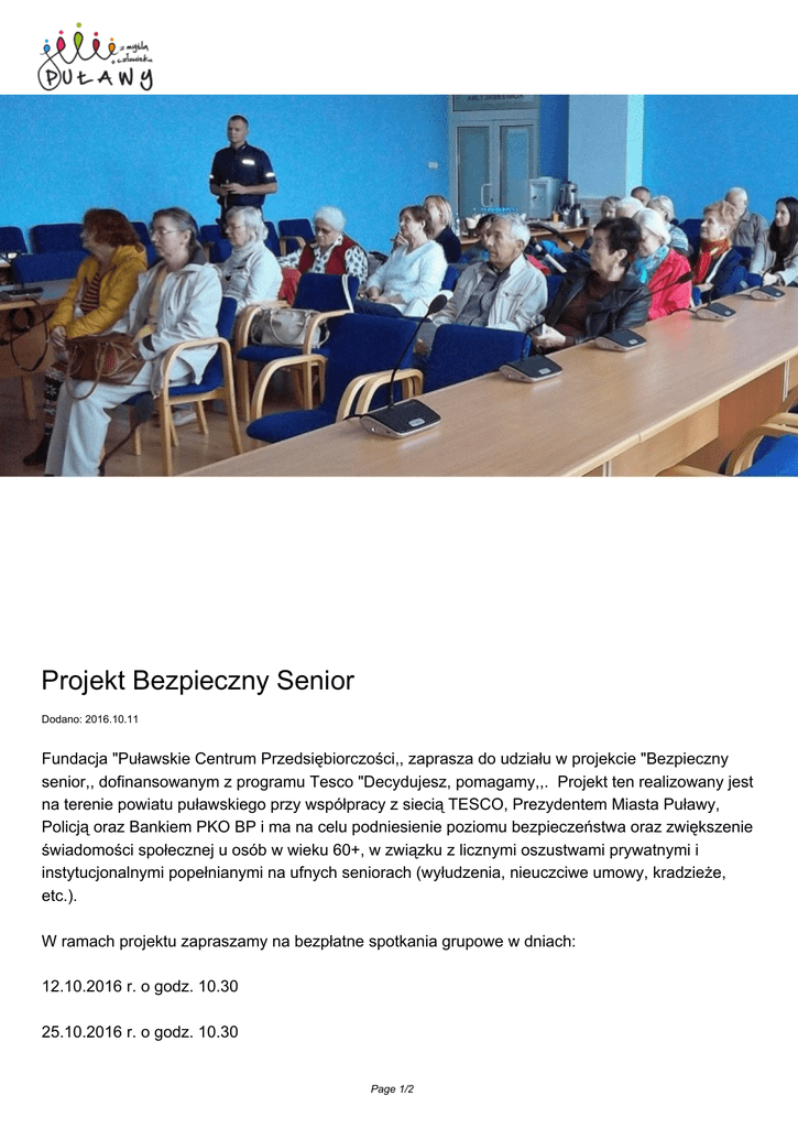 Projekt Bezpieczny Senior Dodano: 2016.10.11 Fundacja "Puławskie Centrum Przedsiębiorczości,, zaprasza do udziału w projekcie "Bezpieczny senior,, dofinansowanym z programu Tesco "Decydujesz, pomagamy,,. Projekt ten realizowany jest na terenie powiatu puławskiego przy współpracy z siecią TESCO, Prezydentem Miasta Puławy, Policją oraz Bankiem PKO BP i ma na celu podniesienie poziomu bezpieczeństwa oraz zwiększenie świadomości społecznej u osób w wieku 60+, w związku z licznymi oszustwami prywatnymi i instytucjonalnymi popełnianymi na ufnych seniorach (wyłudzenia, nieuczciwe umowy, kradzieże, etc.). W ramach projektu zapraszamy na bezpłatne spotkania grupowe w dniach: 12.10.2016 r. o godz. 10.30 25.10.2016 r. o godz. 10.30 Page 1/2 w sali konferencyjnej Urzędu Miasta Puławy przy ul. Lubelskiej 5 Ważna informacja: z przyczyn zależnych od grantodawcy (Regulamin programu Tesco "Decydujesz, pomagamy,,) uczestnikami spotkań mogą być wyłącznie osoby, które wyrażą zgodę na publikowanie swojego wizerunku do celów dokumentowania i promowania projektu (na podst. Art.81 Ustawy o prawie autorskim i prawach pokrewnych z dnia 4 lutego 1994 r., Dz.U. z 2016 r. poz.666). Wszystkich chętnych w wieku 60+ z terenu powiatu puławskiego prosimy o zgłaszanie chęci udziału w wybranych spotkaniach: - osobiście w siedzibie Fundacji "Puławskie Centrum Przedsiębiorczości,, przy ul. Mościckiego 1 (budynek PPNT) lub przy ul. Lubelskiej 2e w Puławach; - telefonicznie pod numerami: (81) 47-00-900, 47-00-901, 47-00-902. na co najmniej 5 dni przed spotkaniem. Źródło: Page 2/2