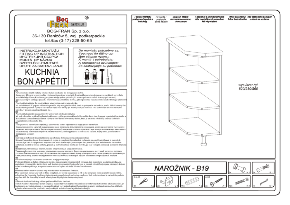 Podczas monta¿u Pri montáži postêpowaæ zgodnie z postupujte instrukcj¹. podla návodu Âîâðåìÿ ñáîðêè ïîñòöïàòü ñîãëàñíî èíñòðöêöèè A szerelést a szerelési útmutató által meghatározott sorrendben kell végrehajtani. While assembling Kod sastavljanja postupati follow the instruction. u skladu sa uputama. BOG-FRAN Sp. z o.o. 36-130 Rani¿ów 5, woj. podkarpackie tel./fax (0-17) 228-50-65 INSTRUKCJA MONTA¯U FITTING-UP INSTRUCTION ÈÍÑÒÐÓÊÖÈß ÑÁÎÐÊÈ MONTÁŽNY NÁVOD SZERELÉSI ÚTMUTATÓ UPUTE ZA SASTAVLJANJE Do monta¿u potrzebne s¹: You need for fitting-up: Äëÿ ñáîðêè íóæíû: K montáži potrebujete: A szereléshez szükséges: Za sastavljanje su potrebne: KUCHNIA BON APPÉTIT wys./szer./g³. 820/280/560 PL Powierzchniê mebli nale¿y czyœciæ tylko œrodkami do pielêgnacji mebli. Szanowny kliencie w przypadku reklamacji prosimy wype³niæ druki reklamacyjne dostêpne w punktach sprzeda¿y przedk³adaj¹c Kartê Reklamacyjn¹ (zawieraj¹c¹ datê produkcji i numer pakowacza lub zmiany pakowania) umieszczon¹ w ka¿dej z paczek, oraz instrukcjê monta¿u mebla, gdzie prosimy o zaznaczenie uszkodzonego elementu. SK Povrch nábytku èistite iba prostriedkami urèenými na ošetrovanie nábytku. Vážení zákazníci! V prípade reklamácie prosíme, aby ste vyplnili tlaèivá, ktoré sú prístupné v obchodoch, predložili Reklamaèný list (ktorý obsahuje dátum výroby a èíslo balièa alebo èíslo zmeny pri balení), ktorý sa nachádza v každom balení a návod na montáž nábytku, v ktorom oznaète poškodenú èas•. CZ Povrch nábytku èistìte pouze pøípravky urèenými k ošetøování nábytku. Vážený zákazníku, v pøípadì uplatnìní reklamace vyplòte prosím reklamaèní formuláøe, které jsou dostupné v prodejnách a pøedložte Reklamaèní kartu (obsahující datum výroby a èíslo balení nebo zmìny balení, která je umístìna v balíèku) a návod k obsluze s vyznaèením poškozeného dílu. BG Ïîâúðõíîñòòà íà ìåáåëèòå òðÿáâà äà ñå ïî÷èñòâà ñàìî ñ ïðåïàðàòè çà ïîääúðæàíå íà ìåáåëè. Óâàæàåìè êëèåíòè, â ñëó÷àé íà ðåêëàìàöèÿ ìîëÿ ïîïúëíåòå ôîðìóëÿðèòå çà ðåêëàìàöèÿ, êîèòî ùå ïîëó÷èòå â òúðãîâñêèòå ïóíêòîâå, êàòî ïðåäñòàâèòå Êàðòàòà çà ðåêëàìàöèÿ (ñúäúðæàùà äàòàòà íà ïðîèçâîäñòâî è íîìåðà íà îïàêîâ÷èêà èëè ñìÿíàòà çà îïàêîâàíå), êîÿòî ùå íàìåðèòå âúâ âñÿêà îïàêîâêà, è èíñòðóêöèÿòà çà ìîíòàæ íà ìåáåëà, âúðõó êîÿòî äà îòáåëåæèòå ïîâðåäåíèÿ åëåìåíò. RO Suprafaþa ei trebuie sã fie curãþatã numai cu substanþe destinate pentru curãþarea mobilei. Stimate Cumpãrãtor, în caz de reclamaþie vã rugãm sã completaþi formularul de reclamaþie pe care îl puteþi lua de la punctul de vânzare ºi pe care îl veþi prezenta împreunã cu Cartela de Garanþie ( care conþine data producþiei ºi nr ambalatorului sau turei de ambalare), însoþitã la fiecare ambalaj, precum ºi instrucþiunile de montaj ale mobilei, pe care vã rugãm sã marcaþi elementul deteriorat. RUS Ïîâåðõíîñòü ìåáåëè íàäî ÷èñòèòü òîëüêî ñðåäñòâàìè äëÿ óõîäà çà ìåáåëüþ. Óâàæàåìûé êëèåíò, äëÿ çàÿâëåíèÿ ðåêëàìàöèè, ïðîñèì çàïîëíèòü ôîðìóëÿð ðåêëàìàöèè, äîñòóïíûé â ïóíêòàõ ïðîäàæè, óêàçûâàÿ Ðåêëàìàöèîííóþ êàðòó (ñîäåðæàùóþ äàòó ïðîèçâîäñòâà è íîìåð óïàêîâùèêà èëè ñìåíû óïàêîâêè), ïðèëîæåííóþ ê êàæäîìó ïàêåòó, à òàêæå èíñòðóêöèþ ïî ìîíòàæó ìåáåëè, íà êîòîðîé ïðîñèì îáîçíà÷èòü ïîâðåæäåííûé ýëåìåíò. HR Površinu namještaja èistite samo sredstvama za njegu namještaja. Poštovani klijenti, u sluèaju reklamacije molimo za popunjenje reklamacijskih obrazaca, koji su dostupni u odjelima prodaje, uz predoèenje reklamacijske kartice (koja sadrži datum proizvodnje i broj osobe koja je pakirala robu ili broj smjene pakiranja), koja se nalazi u svakom pakiranju, te upustava za montažu u kojima ste obilježili ošteæene elemente. NARO¯NIK - B19 GB Furniture surface must be cleaned only with furniture maintenance formulas. Dear Customer, should you wish to file a complaint, we would request you to fill in the complaint forms available in our outlets, submitting the Complaint Card (specifying the date manufactured, packaging employee/ shift code) enclosed in each of the packets, together with the Assembly Manual, where please highlight the faulty component. 2x N1 2x S1 19x K3 1x K1 4x30 3,5x16 H A bútorok felületét kizárólag a bútorápolószerekkel lehet tisztítani. Tisztelt Vásárló! Reklamació esetén kérjük az eladási helyeken kapható reklamációs nyomtatványokat kitölteni a Reklamációs Lap (tartalmazza a gyártási dátumat és csomagoló számát vagy mûszakszámát) bemutatásával, amely mindegyik csomagban található, valamint a bútor szerelési utasítását, amelyen kérjük a sérült elemet bejelölni sziveskedjék. 8x A2 2x C1 16x K2 3x A1 Szafki dolne nale¿y ustawiaæ w odleg³oœci 56 mm od œciany. K3 K2 K3 K2 K2 K2 A1 K3 K3 S1 A1 K2 K2 K2 K2 K3 K3 Ø 8mm, Pokazane otwory w bokach umo¿liwiaj¹ skrêcenie szafki z s¹siedni¹ szafk¹ za pomoc¹ specjalnej œruby ³¹czeniowej S 1. Otwory te nale¿y samemu przewierciæ na wylot wiert³em Ø 8mm, fabrycznie wywiercone s¹ tylko do po³owy boku od œrodka szafki. K2 K2 K2 K2 K3 K3 K2 K2 K2 K2 K3 N1 A2 A2 A2 N1 Symbol e