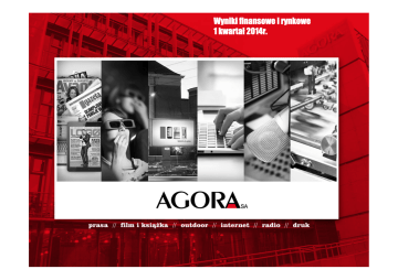 Wyniki finansowe i rynkowe 1 kwartał 2014r. Agenda -2- Sytuacja na rynku reklamy str. 3 Wyniki finansowe Grupy Agora str. 4 Wyniki oraz działania rozwojowe segmentów Grupy str. 5-10 Podsumowanie str. 11 Zmiany w sposobie raportowania segmentów Grupy Agora str. 12 Ożywienie na rynku reklamy Gospodarka wspomaga ożywienie na rynku reklamy Dynamika segmentów rynku reklamy zmiana % r/r PKB PKB rynek reklamy Rynek 35% reklamy 25% 30% internet 20% -8% -12% -8% -16% 1kw.10 2kw.10 3kw.10 4kw.10 1kw.11 2kw.11 3kw.11 4kw.11 1kw.12 2kw.12 3kw.12 4kw.12 1kw.13 2kw.13 3kw.13 4kw.13 -30% magazyny -35% 1kw.14 Wzrost wydatków na reklamę w 1kw.2014r. mln PLN dzienniki -25% Struktura rynku reklamy w 1kw.2014r. 0,5% Reklama zewnętrzna 5,5% zmiana % r/r 1 000 Internet 21,5% Kino 1% 0pkt% 800 1kw.2014 600 6% 400 13,5% 26% Telewizja 52% 6% 12% 2pkt% 16,5% 0 dzienniki -3- zmiana % i pkt% r/r 1pkt% 1pkt% 4,5% 200 1kw.2014 -4% (2,0%) kino 4kw.2013 -6% (5,5%) (6,5%) (5,0%) (7,0%) (7,0%) (3,5%) -20% 3kw.2013 (5,0%) -4% (2,5%) -15% 0% 2kw.2013 -2% 4% 1kw.2013 0,5% 0,0% 0% outdoor -5% -10% 4kw.2012 8% 3,5% 3kw.2012 5,5% 2kw.2012 2% 4,0% 3,5% radio 0% 1kw.2012 6,5% 4% 12% 8,5% 5% 1kw.2011 6% telewizja 10% 4kw.2011 16% 3kw.2011 20% 8% 2kw.2011 10% 15% kino magazyny outdoor telewizja radio internet Źródło: szacunki Agory (prasa na podstawie Kantar Media oraz monitoringu Agory, radio na podstawie Kantar Media), IGRZ (reklama zewnętrzna - od stycznia 2014 roku liczba podmiotów raportujących przychody do IGRZ uległa zmniejszeniu i rzeczywisty spadek wydatków reklamowych dla reklamy zewnętrznej był niższy niż raportowany przez IGRZ spadek o ponad 12%), Starlink (TV, kino, internet). Internet – zawiera przychody z e-mail marketingu, reklamy graficznej (display), marketingu w wyszukiwarkach internetowych oraz od 1 kwartału 2012 r. przychody z reklamy wideo. Prezentowane dynamiki dla rynku reklamy zachowują porównywalność danych. Dane makroekonomicze 1kw.2010-4kw.2013: Główny Urząd Statystyczny, PKB dla 1kw.2014, średnia prognoz analityków. Dzienniki 4% 1,5pkt% 1,6 mld PLN Magazyny 8% 0,5% 1pkt% Radio 8% 0,5pkt% Wyniki finansowe Grupy Agora w 1kw.2014r. Wyniki finansowe w mln zł 1kw.2014 1 1kw.2013 zmiana r/r 254,0 261,8 (3,0%) 111,0 127,1 (12,7%) Sprzedaż wydawnictw 33,1 35,6 (7,0%) wzrost frekwencji w kinach Sprzedaż biletów do kin 41,5 35,2 17,9% wzrost przychodów ze sprzedaży Sprzedaż usług poligraficznych 40,7 33,2 22,6% barowej Pozostała sprzedaż 27,7 30,7 (9,8%) wzrost przychodów z tytułu (263,6) (262,1) 0,6% Zużycie materiałów i energii oraz wartość sprzedanych towarów i materiałów (59,6) (54,8) 8,8% Amortyzacja (23,8) (25,3) (5,9%) Usługi obce (85,6) (84,2) 1,7% (72,9) (72,6) 0,4% (13,2) (12,6) 4,8% (9,6) (0,3) (3100,0%) (3,8%) (0,1%) (3,7pkt %) 14,2 25,0 (43,2%) 5,6% 9,5% (3,9pkt %) (8,9) (1,4) (535,7%) Przychody ze sprzedaży netto ograniczenie wydatków na reklamę Sprzedaż usług reklamowych zewnętrzną i w dziennikach działalności poligraficznej Koszty operacyjne netto, w tym: Wynagrodzenia i świadczenia 2 Reprezentacja i reklama Wynik operacyjny ‐ EBIT marża EBIT EBITDA marża EBITDA Strata netto brak przychodów z tytułu koprodukcji i dystrybucji filmowej w 1kw.2014r. wzrost kosztów związany z realizacją projektów rozwojowych w Grupie Źródło: skonsolidowane sprawozdanie finansowe wg MSSF, 1kw.2014; -4- 1 poszczególne pozycje przychodów ze sprzedaży, poza przychodami ze sprzedaży biletów, zawierają przychody ze sprzedaży Projektów Specjalnych (w tym kolekcji wydawniczych), 2 podana kwota za rok 2013 r. obejmuje również niegotówkowe koszty związane z płatnościami w formie papierów wartościowych rozliczanymi w instrumentach finansowych w wysokości 0,7 mln zł. Działalność prasowa Grupy w 1kw.2014 r. Wynik operacyjny działalności prasowej pod presją trendów rynkowych PRASA w mln zł 1kw.2014 Przychody, w tym: Przychody ze sprzedaży wydawnictw w tym Gazeta Wyborcza Przychody ze sprzedaży reklam zmiana r/r dalszy spadek wydatków na reklamę w prasie 69,2 85,5 (19,1%) 31,4 33,4 (6,0%) wpływ sprzedaży Poradnika Domowego na poziom 25,6 26,7 (4,1%) przychodów ze sprzedaży egzemplarzowej czasopism 4,2 5,5 (23,6%) 37,0 50,9 (27,3%) podwyżka ceny egz. ogranicza spadek przychodów 3,16 mln w tym Czasopisma 1kw.2013 24,8 36,3 (31,7%) ze sprzedaży egzemplarzy Gazety Wyborczej w tym Czasopisma 4,5 6,5 (30,8%) dalsze ograniczenie kosztów operacyjnych w tym Metro 4,7 5,2 (9,6%) (63,0) (66,9) (5,8%) 18,6 (66,7%) w tym Gazeta Wyborcza 1 Koszty operacyjne netto Wynik operacyjny ‐ EBIT 6,2 marża EBIT 9,0% EBITDA 21,8% (12,8pkt %) 8,4 marża EBITDA 20,9 12,1% (59,8%) 24,4% (12,3pkt %) Ograniczenie spadku przychodów ze sprzedaży egz. Gazety Wyborczej 40,0 Zmiany oferty wydawniczej Wysokie Obcasy Extra 35,0 jako miesięcznik 30,0 25,0 20,0 15,0 10,0 5,0 14 20 13 w. 1k 20 w. 4k 20 13 13 w. 20 w. 2k 3k 13 12 20 w. 1k 20 w. 4k 20 12 12 w. 3k 2k w. 20 12 11 20 w. 1k 20 20 11 w. 4k 11 w. 3k 20 20 w. 2k 20 11 10 w. 1k 10 w. 4k 10 20 20 w. 3k w. 2k 1k w. 20 10 0,0 sprzedaż egz. (mln PLN) -5- Źródło: finanse: skonsolidowane sprawozdanie finansowe wg MSSF, 1kw.2014; dane dotyczące liczby rozpowszechnianych egzemplarzy dzienników według Związku Kontroli i Dystrybucji Prasy (ZKDP). ¹ nie zawiera alokacji ogólnych kosztów okołozarządowych Agory S.A.; Nowe odsłony czasopism Poprawa wyniku operacyjnego segmentu FILM i KSIĄŻKA Wzrost przychodów dzięki wyższej frekwencji Sieć kin Helios FILM i KSIĄŻKA w mln zł 1kw.2014 Przychody, w tym: 70,9 1kw.2013 68,4 3,7% Otwarcie nowych kin Helios w marcu 2014 r. : Kalisz (7 ekranów) i Siedlce (5 ekranów) Przychody ze sprzedaży biletów do kina 41,5 35,2 17,9% Przychody ze sprzedaży barowej 13,2 10,3 28,2% 5,1 5,6 (8,9%) Przychody ze sprzedaży reklam w kinach 1 Przychody z działalności Projektów Specjalnych 6,5 7,3 (11,0%) Koszty operacyjne netto (65,8) (65,3) 0,8% Wynik ope