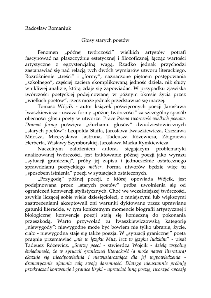 Radosław Romaniuk Głosy starych poetów Fenomen „późnej twórczości” wielkich artystów potrafi fascynować na płaszczyźnie estetycznej i filozoficznej, łącząc wartości artystyczne z egzystencjalną wagą. Rzadko jednak przychodzi zastanawiać się nad relacją tych dwóch wymiarów utworu literackiego. Rozróżnienie „treści” i „formy”, naznaczone piętnem postępowania „szkolnego”, częściej zaciera skomplikowaną jedność dzieła, niż służy wnikliwej analizie, którą zdaje się zapowiadać. W przypadku zjawiska twórczości poetyckiej podejmowanej w późnym okresie życia przez „wielkich poetów”, rzecz może jednak przedstawiać się inaczej. Tomasz Wójcik - autor książek poświęconych poezji Jarosława Iwaszkiewicza - uważa formę „późnej twórczości” za szczególny sposób obecności głosu poety w utworze. Pracę Późna twórczość wielkich poetów. Dramat formy poświęca „słuchaniu głosów” dwudziestowiecznych „starych poetów”: Leopolda Staffa, Jarosława Iwaszkiewicza, Czesława Miłosza, Mieczysława Jastruna, Tadeusza Różewicza, Zbigniewa Herberta, Wisławy Szymborskiej, Jarosława Marka Rymkiewicza. Naczelnym założeniem autora, sięgającym problematyki analizowanej twórczości, jest traktowanie późnej poezji jako wyrazu „sytuacji granicznej”, próby jej zapisu i jednocześnie ostatecznego sprawdzianu poetyckiego métier. Forma utworów będzie więc tu „sposobem istnienia” poezji w sytuacjach ostatecznych. „Przygodą” późnej poezji, o której opowiada Wójcik, jest podejmowana przez „starych poetów” próba uwolnienia się od ograniczeń konwencji stylistycznych. Choć we wcześniejszej twórczości, zwykle liczącej sobie wiele dziesięcioleci, z mniejszymi lub większymi zastrzeżeniami akceptowali oni warunki dyktowane przez uprawiane gatunki literackie, w tym konkretnym momencie biografii artystycznej i biologicznej konwencje poezji stają się konieczną do pokonania przeszkodą. Warto przywołać tu Iwaszkiewiczowską kategorię „niewygody”: niewygodne może być bowiem nie tylko ubranie, życie, ciało - niewygodna staje się także poezja. W „sytuacji granicznej” poeta pragnie przemawiać „nie w języku Muz, lecz w języku ludzkim” - pisał Tadeusz Różewicz. „Starzy poeci - stwierdza Wójcik - dzielą wspólną świadomość, że w sytuacji granicznej literackość (a może nawet literatura) okazuje się nieodpowiednia i niewystarczająca dla jej wypowiedzenia dramatycznie ujawnia całą swoją daremność. Dlatego nieustannie próbują przekraczać konwencje i granice liryki - uprawiać inną poezję, tworzyć <poezję żywą>. Taką, w której głos dominuje nad pismem, taką, w której ten głos ludzki staje się słyszalny - wbrew konwencji, zamiast konwencji, poza konwencją”. Spadają maski form, lecz poezja nie może istnieć bez formy i kolejny etap poszukiwań polega na stworzeniu takiej formy, która wewnętrznie ignoruje siebie samą, stanowi zapis najbliższy dykcji nieliterackiej. Wójcik szczegółowo omawia mechanizmy takich „ucieczek” przed literackością. Realizują je formy pojemne, łączące cechy kilku literackich gatunków. Do form szczególnie chętnie używanych przez „starych poetów” można zaliczyć: dialog (w kilku niezależnych od siebie przypadkach - u Iwaszkiewicza, Różewicza i Przybosia - będzie rozmową z matką, bywają to rozmowy z przyjaciółmi, nieżyjącymi mistrzami, intertekstualne dialogi z dziełami literatury i sztuki, lecz także rozmowy toczone ze sobą samym) czy chociażby konwencję testamentu, pożegnania (każdy wiersz traktowany jak ostatni i konsekwentne, trwające niekiedy wiele lat, publikowanie „ostatnich” zbiorów wierszy). I one są oczywiście formami zakorzenionymi w kulturze, tak więc najczęściej tradycyjne realizacje tych stylistyk zostają wzięte w cudzysłów ironii. Elegijność wierszy „starych poetów” XX wieku - w imię zerwania z „literackością” - staje się elegijnością ironiczną, w świadomy sposób łamie zasady poetyckiego kunsztu i stylistycznej „odpowiedniości”. Dramatyczne pożegnanie przybiera formę piosenki. Testament staje się pozbawionym porządku wyliczeniem. Tomasz Wójcik wiele uwagi poświęca „poetykom negatywnym”, które tradycyjne dykcje poetyckie zastępują awangardową zasadą ekonomiczności środków: notatką, fragmentem, wyliczeniem (enumeracją) i w końcu - milczeniem. Późna poezja nieoczekiwanie dla autorów - odnajduje się w awangardzie nowoczesności. „Stary poeta”, podejmując ryzyko formalnych poszukiwań, wygrywa artystyczną młodość. Zmagania „wielkich poetów” z formą są dla autora książki istotniejsze niż sam zapis doświadczenia egzystencjalnego, literacka antropologia starości. Mądrość samoograniczenia podpowiada autorowi, że droga do rzeczy ważniejszych wiedzie przez rozpoznanie spraw, które pozornie wydają się drugorzędne. Założenie to - osadzone w duchu omawianych dzieł: wszak inicjują one wielkie przewartościowania - potrafi przybliżyć także antropologiczną tajemnicę starości artysty. Walka o formę jest w niej nie tylko usiłowaniem odnalezienia nowych źródeł poezji, lecz także poszukiwaniem ocalenia i usprawiedliwienia twórczości.