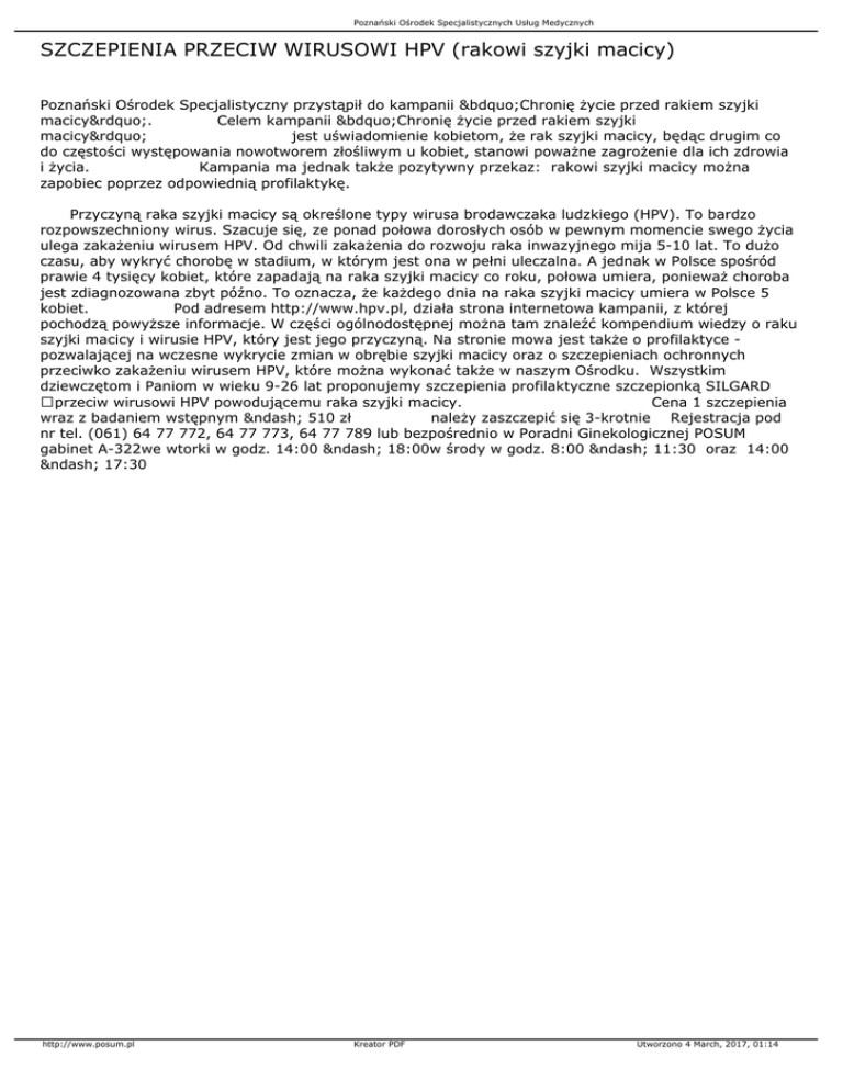 Poznański Ośrodek Specjalistycznych Usług Medycznych SZCZEPIENIA PRZECIW WIRUSOWI HPV (rakowi szyjki macicy) Poznański Ośrodek Specjalistyczny przystąpił do kampanii „Chronię życie przed rakiem szyjki macicy”. Celem kampanii „Chronię życie przed rakiem szyjki macicy” jest uświadomienie kobietom, że rak szyjki macicy, będąc drugim co do częstości występowania nowotworem złośliwym u kobiet, stanowi poważne zagrożenie dla ich zdrowia i życia. Kampania ma jednak także pozytywny przekaz: rakowi szyjki macicy można zapobiec poprzez odpowiednią profilaktykę. Przyczyną raka szyjki macicy są określone typy wirusa brodawczaka ludzkiego (HPV). To bardzo rozpowszechniony wirus. Szacuje się, ze ponad połowa dorosłych osób w pewnym momencie swego życia ulega zakażeniu wirusem HPV. Od chwili zakażenia do rozwoju raka inwazyjnego mija 5-10 lat. To dużo czasu, aby wykryć chorobę w stadium, w którym jest ona w pełni uleczalna. A jednak w Polsce spośród prawie 4 tysięcy kobiet, które zapadają na raka szyjki macicy co roku, połowa umiera, ponieważ choroba jest zdiagnozowana zbyt późno. To oznacza, że każdego dnia na raka szyjki macicy umiera w Polsce 5 kobiet. Pod adresem http://www.hpv.pl, działa strona internetowa kampanii, z której pochodzą powyższe informacje. W części ogólnodostępnej można tam znaleźć kompendium wiedzy o raku szyjki macicy i wirusie HPV, który jest jego przyczyną. Na stronie mowa jest także o profilaktyce pozwalającej na wczesne wykrycie zmian w obrębie szyjki macicy oraz o szczepieniach ochronnych przeciwko zakażeniu wirusem HPV, które można wykonać także w naszym Ośrodku. Wszystkim dziewczętom i Paniom w wieku 9-26 lat proponujemy szczepienia profilaktyczne szczepionką SILGARD ® przeciw wirusowi HPV powodującemu raka szyjki macicy. Cena 1 szczepienia wraz z badaniem wstępnym – 510 zł należy zaszczepić się 3-krotnie Rejestracja pod nr tel. (061) 64 77 772, 64 77 773, 64 77 789 lub bezpośrednio w Poradni Ginekologicznej POSUM gabinet A-322we wtorki w godz. 14:00 – 18:00w środy w godz. 8:00 – 11:30 oraz 14:00 – 17:30 http://www.posum.pl Kreator PDF Utworzono 4 March, 2017, 01:14
