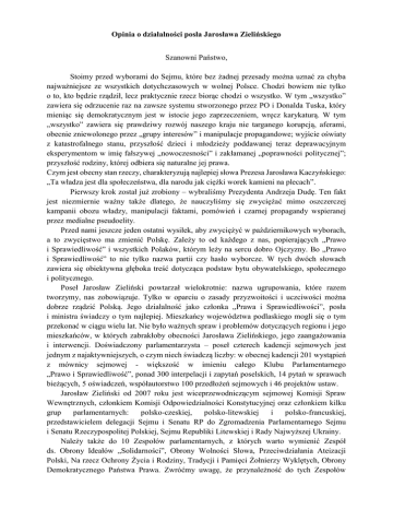 Opinia o działalności posła Jarosława Zielińskiego Szanowni Państwo, Stoimy przed wyborami do Sejmu, które bez żadnej przesady można uznać za chyba najważniejsze ze wszystkich dotychczasowych w wolnej Polsce. Chodzi bowiem nie tylko o to, kto będzie rządził, lecz praktycznie rzecz biorąc chodzi o wszystko. W tym „wszystko” zawiera się odrzucenie raz na zawsze systemu stworzonego przez PO i Donalda Tuska, który mieniąc się demokratycznym jest w istocie jego zaprzeczeniem, wręcz karykaturą. W tym „wszystko” zawiera się prawdziwy rozwój naszego kraju nie targanego korupcją, aferami, obecnie zniewolonego przez „grupy interesów” i manipulacje propagandowe; wyjście oświaty z katastrofalnego stanu, przyszłość dzieci i młodzieży poddawanej teraz deprawacyjnym eksperymentom w imię fałszywej „nowoczesności” i zakłamanej „poprawności politycznej”; przyszłość rodziny, której odbiera się naturalne jej prawa. Czym jest obecny stan rzeczy, charakteryzują najlepiej słowa Prezesa Jarosława Kaczyńskiego: „Ta władza jest dla społeczeństwa, dla narodu jak ciężki worek kamieni na plecach”. Pierwszy krok został już zrobiony – wybraliśmy Prezydenta Andrzeja Dudę. Ten fakt jest niezmiernie ważny także dlatego, że nauczyliśmy się zwyciężać mimo oszczerczej kampanii obozu władzy, manipulacji faktami, pomówień i czarnej propagandy wspieranej przez medialne pseudoelity. Przed nami jeszcze jeden ostatni wysiłek, aby zwyciężyć w październikowych wyborach, a to zwycięstwo ma zmienić Polskę. Zależy to od każdego z nas, popierających „Prawo i Sprawiedliwość” i wszystkich Polaków, którym leży na sercu dobro Ojczyzny. Bo „Prawo i Sprawiedliwość” to nie tylko nazwa partii czy hasło wyborcze. W tych dwóch słowach zawiera się obiektywna głęboka treść dotycząca podstaw bytu obywatelskiego, społecznego i politycznego. Poseł Jarosław Zieliński powtarzał wielokrotnie: nazwa ugrupowania, które razem tworzymy, nas zobowiązuje. Tylko w oparciu o zasady przyzwoitości i uczciwości można dobrze rządzić Polską. Jego działalność jako członka „Prawa i Sprawiedliwości”, posła i ministra świadczy o tym najlepiej. Mieszkańcy województwa podlaskiego mogli się o tym przekonać w ciągu wielu lat. Nie było ważnych spraw i problemów dotyczących regionu i jego mieszkańców, w których zabrakłoby obecności Jarosława Zielińskiego, jego zaangażowania i interwencji. Doświadczony parlamentarzysta – poseł czterech kadencji sejmowych jest jednym z najaktywniejszych, o czym niech świadczą liczby: w obecnej kadencji 201 wystąpień z mównicy sejmowej - większość w imieniu całego Klubu Parlamentarnego „Prawo i Sprawiedliwość”, ponad 300 interpelacji i zapytań poselskich, 14 pytań w sprawach bieżących, 5 oświadczeń, współautorstwo 100 przedłożeń sejmowych i 46 projektów ustaw. Jarosław Zieliński od 2007 roku jest wiceprzewodniczącym sejmowej Komisji Spraw Wewnętrznych, członkiem Komisji Odpowiedzialności Konstytucyjnej oraz członkiem kilku grup parlamentarnych: polsko-czeskiej, polsko-litewskiej i polsko-francuskiej, przedstawicielem delegacji Sejmu i Senatu RP do Zgromadzenia Parlamentarnego Sejmu i Senatu Rzeczypospolitej Polskiej, Sejmu Republiki Litewskiej i Rady Najwyższej Ukrainy. Należy także do 10 Zespołów parlamentarnych, z których warto wymienić Zespół ds. Obrony Ideałów „Solidarności”, Obrony Wolności Słowa, Przeciwdziałania Ateizacji Polski, Na rzecz Ochrony Życia i Rodziny, Tradycji i Pamięci Żołnierzy Wyklętych, Obrony Demokratycznego Państwa Prawa. Zwróćmy uwagę, że przynależność do tych Zespołów świadczy jednoznacznie o korzeniach ideowych Jarosława Zielińskiego, o wierności tradycji i zaangażowaniu w obronę wartości stanowiących podstawy polskiej tożsamości. Jarosław Zieliński nie jest posłem gabinetowym, lecz człowiekiem spontanicznego czynu, uczestniczył w manifestacjach w obronie gwałconych praw obywateli i je współorganizował – jak marsz przeciw podwyższeniu wieku emerytalnego (Warszawa), marsze w obronie wolności mediów i TV „Trwam” (Warszawa, Białystok, Suwałki, Sokółka, Augustów), marsz „Obudź się Polsko” (Warszawa, Białystok), pikieta przed MEN przeciw ograniczeniom w nauce historii i inne. Forum ogólnopolskie, zaangażowanie w sprawy całego państwa nie przysłaniają Jarosławowi Zielińskiemu poczucia odpowiedzialności za swój region, za tych, którzy na niego głosują i za „zwykłych” ludzi potrzebujących interwencji i pomocy. W swoich biurach poselskich przyjął ponad 2 000 interesantów, odbył ponad 500 spotkań z mieszkańcami województwa podlaskiego. Znają go szkoły wszystkich szczebli, policja, straż pożarna, związkowcy, przedsiębiorcy, kombatanci, samorządowcy, kolejarze, pielęgniarki i wiele innych środowisk, z którymi współpracuje. Punktem honoru Jarosława Zielińskiego jest zakończenie sprawy Obławy Augustowskiej, w czym nieustępliwie domaga się od rządu jej wyjaśnienia i napiętnowania oprawców oraz odpowiedniego uczczenia ofiar i zapewnienia im godnej pamięci. Za historyczne można uznać jego boje na forum sejmowym o drogi i połączenia kolejowe miast województwa podlaskiego z resztą Polski, zaś podsumowaniem trwających od lat rażących zaniedbań, marginalizowania potrzeb, problemów i aspiracji województwa podlaskiego oraz nigdy nie spełnionych obietnic rządu PO-PSL jest „List otwarty do Ewy Kopacz” z dnia 14 września 2015 roku , w którym Jarosław Zieliński bezlitośnie obnaża to, do czego doprowadziły ośmioletnie rządy tej koalicji. Wszystko, co wyżej powiedziano, niechaj nie będzie odebrane jako panegiryk czy okolicznościowa laurka wystawiona na potrzeby kampanii wyborczej. Jarosław Zieliński takich laurek nie potrzebuje, jest bowiem człowiekiem dającym jednoznaczne świadectwo swoi
