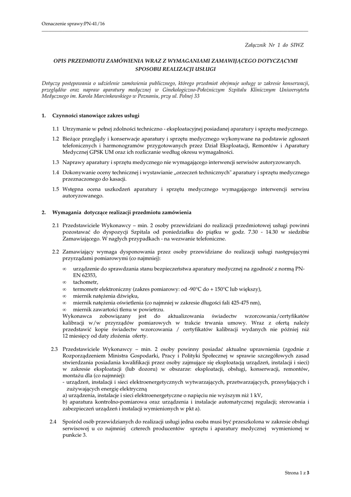 Oznaczenie sprawy:PN-41/16 ____________________________________________________________________________________________________________________ Załącznik Nr 1 do SIWZ OPIS PRZEDMIOTU ZAMÓWIENIA WRAZ Z WYMAGANIAMI ZAMAWIJĄCEGO DOTYCZĄCYMI SPOSOBU REALIZACJI USŁUGI Dotyczy postępowania o udzielenie zamówienia publicznego, którego przedmiot obejmuje usługę w zakresie konserwacji, przeglądów oraz napraw aparatury medycznej w Ginekologiczno-Położniczym Szpitalu Klinicznym Uniwersytetu Medycznego im. Karola Marcinkowskiego w Poznaniu, przy ul. Polnej 33 1. Czynności stanowiące zakres usługi 1.1 Utrzymanie w pełnej zdolności techniczno - eksploatacyjnej posiadanej aparatury i sprzętu medycznego. 1.2 Bieżące przeglądy i konserwacje aparatury i sprzętu medycznego wykonywane na podstawie zgłoszeń telefonicznych i harmonogramów przygotowanych przez Dział Eksploatacji, Remontów i Aparatury Medycznej GPSK UM oraz ich rozliczanie według okresu wymagalności. 1.3 Naprawy aparatury i sprzętu medycznego nie wymagającego interwencji serwisów autoryzowanych. 1.4 Dokonywanie oceny technicznej i wystawianie ,,orzeczeń technicznych" aparatury i sprzętu medycznego przeznaczonego do kasacji. 1.5 Wstępna ocena uszkodzeń aparatury i sprzętu medycznego wymagającego interwencji serwisu autoryzowanego. 2. Wymagania dotyczące realizacji przedmiotu zamówienia 2.1 Przedstawiciele Wykonawcy – min. 2 osoby przewidziani do realizacji przedmiotowej usługi powinni pozostawać do dyspozycji Szpitala od poniedziałku do piątku w godz. 7.30 - 14.30 w siedzibie Zamawiającego. W nagłych przypadkach - na wezwanie telefoniczne. 2.2 Zamawiający wymaga dysponowania przez osoby przewidziane do realizacji usługi następującymi przyrządami pomiarowymi (co najmniej): • urządzenie do sprawdzania stanu bezpieczeństwa aparatury medycznej na zgodność z normą PNEN 62353, • tachometr, • termometr elektroniczny (zakres pomiarowy: od -90°C do + 150°C lub większy), • miernik natężenia dźwięku, • miernik natężenia oświetlenia (co najmniej w zakresie długości fali 425-475 nm), • miernik zawartości tlenu w powietrzu. Wykonawca zobowiązany jest do aktualizowania świadectw wzorcowania/certyfikatów kalibracji w/w przyrządów pomiarowych w trakcie trwania umowy. Wraz z ofertą należy przedstawić kopie świadectw wzorcowania / certyfikatów kalibracji wydanych nie później niż 12 miesięcy od daty złożenia oferty. 2.3 Przedstawiciele Wykonawcy – min. 2 osoby powinny posiadać aktualne uprawnienia (zgodnie z Rozporządzeniem Ministra Gospodarki, Pracy i Polityki Społecznej w sprawie szczegółowych zasad stwierdzania posiadania kwalifikacji przez osoby zajmujące się eksploatacją urządzeń, instalacji i sieci) w zakresie eksploatacji (lub dozoru) w obszarze: eksploatacji, obsługi, konserwacji, remontów, montażu dla (co najmniej): - urządzeń, instalacji i sieci elektroenergetycznych wytwarzających, przetwarzających, przesyłających i zużywających energię elektryczną a) urządzenia, instalacje i sieci elektroenergetyczne o napięciu nie wyższym niż 1 kV, b) aparatura kontrolno-pomiarowa oraz urządzenia i instalacje automatycznej regulacji; sterowania i zabezpieczeń urządzeń i instalacji wymienionych w pkt a). 2.4 Spośród osób przewidzianych do realizacji usługi jedna osoba musi być przeszkolona w zakresie obsługi serwisowej u co najmniej czterech producentów sprzętu i aparatury medycznej wymienionej w punkcie 3. Strona 1 z 13 Oznaczenie sprawy:PN-41/16 ____________________________________________________________________________________________________________________ 2.5 Wykonawca jest zobowiązany do wyposażenia swoich pracowników w stosowne oznakowanie umożliwiające identyfikację podczas prowadzonych prac. 2.6 Wykonawca zobowiązany jest powiadomić Zamawiającego o każdym potencjalnym opóźnieniu w wykonaniu przedmiotowej usługi. 2.7 Wykonawca oświadcza, że zapewni realizację umowy z udziałem osób wskazanych w wykazie stanowiącym załącznik do oferty. W przypadku zmiany tych osób w trakcie umowy Wykonawca ma obowiązek przydzielenia pracownika spełniającego wymagania postawione w postępowaniu o udzielenie zamówienia publicznego. Wykonawca każdorazowo przedstawia Zamawiającemu do akceptacji, w terminie co najmniej 3 dni przed planowaną zmianą, informacje o proponowanym nowym pracowniku oraz dokumenty potwierdzające wykonanie badań okresowych , odbycie szkoleń BHP, potwierdzenie zapoznania się z instrukcjami i procedurami obowiązującymi na terenie Szpitala. 3. Zestawienie aparatury i sprzętu medycznego objętego przedmiotową usługą L. p. Nazwa aparatury Wytwórca Rok produkcji Ilość 1 Inkubatory noworodkowe Atom, Dräger, Air Shields, GE Healthcare 1994-2010 65 2 Inkubatory transportowe Atom, Dräger 2003-2010 6 3 Stanowiska do resuscytacji noworodka Datex-Ohmeda, Air Shields, Unimed 1994-2014 30 4 Respiratory Bear, Sechrist, Dräger, Bennett 1996-2011 25 5 Pompy infuzyjne Ascor, Atom, Aesculap AG, Graseby, Viltechmeda 1996-2015 150 6 Lampy diagnostyczne Famed 1994-2014 30 7 Ssaki elektryczne, próżniowe 1994-2014 80 8 Kardiomonitory 1994-2012 50 9 Elektrokardiografy 1996-2007 4 10 Kardiotokografy 11 Aesculap AG, Ogarit, CA.MI., Medela Spacelabs Healthcare, Biazet, DatexOhmeda, Nihon Kohden 1999-2014 70 Wirówki laboratoryjne Aspel, BTL HP, Philips, Medical Econet, Edan Instruments, Inc., Bionet Co., Ltd MPW, Eppendorf, Diahem, MLW 1993-2011 20 12 Cieplarki laboraotryjne Stabilitherm, Jouan, Binder 1994-2010 20 13 Fotele ginekologiczne Famed, Resi 1994-2011 25 14 Łóżka porodowe Hill Rom 2004-2015 10 15 Łóżka szpitalne Famed 1999 300 16 Ultrasonografy Aloka, GE Healthcare, Philips, Esaote 2000-2011 15 17 Lampy i łóżeczka do fototerapii Medela, Air Shields, Datex-Ohmeda, GE 1998-2011 45 18 Przepływomierze i reduktory Korgiel, Avamed, Farum 1997-2012 150 19 Mikroskopy 1978-2012 35 20 Diater