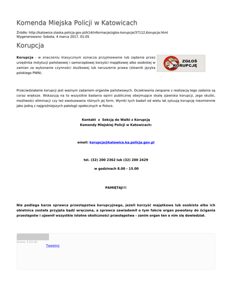 Komenda Miejska Policji w Katowicach Źródło: http://katowice.slaska.policja.gov.pl/k14/informacje/zglos-korupcje/37112,Korupcja.html Wygenerowano: Sobota, 4 marca 2017, 01:05 Korupcja Korupcja - w znaczeniu klasycznym oznacza przyjmowanie lub żądanie przez urzędnika instytucji państwowej i samorządowej korzyści majątkowej albo osobistej w zamian za wykonanie czynności służbowej lub naruszenie prawa (słownik języka polskiego PWN). Przeciwdziałanie korupcji jest ważnym zadaniem organów państwowych. Oczekiwania związane z realizacją tego zadania są coraz większe. Wskazują na to wszystkie badania opinii publicznej obejmujące skalę zjawiska korupcji, jego skutki, możliwości eliminacji czy też ewoluowania różnych jej form. Wyniki tych badań od wielu lat sytuują korupcję niezmiennie jako jedną z najgroźniejszych patologii społecznych w Polsce. Kontakt z Sekcją do Walki z Korupcją Komendy Miejskiej Policji w Katowicach: email: [email protected] tel. (32) 200 2362 lub (32) 200 2429 w godzinach 8.00 - 15.00 PAMIĘTAJ!!! Nie podlega karze sprawca przestępstwa korupcyjnego, jeżeli korzyść majątkowa lub osobista albo ich obietnica została przyjęta bądź wręczona, a sprawca zawiadomił o tym fakcie organ powołany do ścigania przestępstw i ujawnił wszystkie istotne okoliczności przestępstwa - zanim organ ten o nim się dowiedział. Ocena: 3.5/5 (6) Tweetnij
