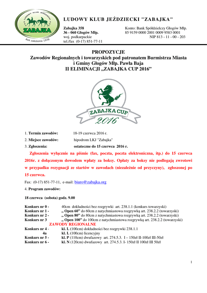 LUDOWY KLUB JEŹDZIECKI "ZABAJKA" Zabajka 358 36 - 060 Głogów Młp. woj. podkarpackie tel./fax (0-17) 851-77-11 Konto: Bank Spółdzielczy Głogów Młp. 85 9159 0000 2001 0009 9583 0001 NIP 813 - 11 - 00 - 203 PROPOZYCJE Zawodów Regionalnych i towarzyskich pod patronatem Burmistrza Miasta i Gminy Głogów Młp. Pawła Baja II ELIMINACJI „ZABAJKA CUP 2016” 1. Termin zawodów: 18-19 czerwca 2016 r. 2. Miejsce zawodów: hipodrom LKJ "Zabajka" 3. Zgłoszenia: ostateczne do 15 czerwca 2016 r. Zgłoszenia wyłącznie na piśmie (fax, poczta, poczta elektroniczna, itp.) do 15 czerwca 2016r. z dołączonym dowodem wpłaty za boksy. Opłaty za boksy nie podlegają zwrotowi w przypadku rezygnacji ze startów w zawodach (niezależnie od przyczyny), zgłoszonej po 15 czerwca. Fax: (0-17) 851-77-11, e-mail: [email protected] 4. Program zawodów: 18 czerwca (sobota) godz. 9.00 Konkurs nr 0 Konkurs nr 1 Konkurs nr 2 Konkurs nr 3 40cm dokładności bez rozgrywki art. 238.1.1 (konkurs towarzyski) „ Open 60” do 60cm z natychmiastowa rozgrywką art. 238.2.2 (towarzyski) „ Open 80” do 80cm z natychmiastowa rozgrywką art. 238.2.2 (towarzyski) „ Open 100” do 100cm z natychmiastowa rozgrywką art. 238.2.2 (towarzyski) ZAWODY REGIONALNE Konkurs nr 4 kl. L (100cm) dokładności bez rozgrywki 238.1.1 4a kl. L (100cm) licencyjny Konkurs nr 5 kl. P (110cm) dwufazowy art. 274.5.3. I – 150zł II-100zł III-50zł Konkurs nr 6 kl. N (120cm) dwufazowy art. 274.5.3. I- 150zł II 100zł III 50zł 1 19 czerwca (niedziela) godz. 9.30 Konkurs nr 0 Konkurs nr 7 Konkurs nr 8 Konkurs nr 9 40cm dokładności bez rozgrywki art. 238.1.1 (konkurs towarzyski) „ Open 60” do 60cm z natychmiastowa rozgrywką art. 238.2.2 (towarzyski) „ Open 80” do 80cm z natychmiastowa rozgrywką art. 238.2.2 (towarzyski) „ Open 100” do 100cm z natychmiastowa rozgrywką art. 238.2.2 (towarzyski) ZAWODY REGIONALNE kl. L (100cm) dokładności bez rozgrywki 238.1.1 kl. P (110cm) zwykły art.238.2.1 I – 150zł II- 100zł III – 50zł kl. N (120cm) zwykły art.238.2.1 I – 150zł II- 100zł III – 50zł Konkurs nr 10 Konkurs nr 11 Konkurs nr 12 - KONKURSY 1,2,3,7,8,9 zaliczane do II eliminacji „ZABAJKA CUP” Pozostałe konkursy to zawody regionalne. Sobota godz. 20.00 OGNISKO DLA WSZYSTKICH ZAWODNIKÓW, TRENERÓW, LUZAKÓW, SZEFÓW EKIP, WŁAŚCICIELI KONI, SĘDZIÓW 6. OPŁATY Opłaty za start - tylko w „ZABJKA CUP” opłata od zawodnika 110zł + boks 50zł od konia za całe zawody - „ZABAJKACUP” + ZAWODY REGIONALNE opłata od zawodnika 160zł + boks 50zł od konia za całe zawody - ZAWODY REGIONALNE opłata od zawodnika 160zł + boks 50zł od konia za całe zawody - start za 1 dzień zawodów ( „ZABAJKA CUP” lub „ZABAJKA CUP” + ZAWODY REGIONALNE ) 110zł od konia (w tym boks) Boksy przygotowane od 6 maja 2016 r., godz. 16.00. Wpłaty można przelać na konto Bank Spółdzielczy Głogów Młp. 85 9159 0000 2001 0009 9583 0001 Opłata organizacyjna musi być uregulowana na godzinę przed rozpoczęciem pierwszego konkursu. W przypadku nieuregulowania opłat, do startu nie zostanie dopuszczona cała ekipa. - cisza nocna w stajni od godz. 22.00 – 6.00 - prosimy o przestrzeganie przepisów BHP i p.poż. 7. Zakwaterowanie: Zawodnicy, szefowie ekip, trenerzy, luzacy – noclegi na własny koszt. Można dokonać rezerwacji w LKJ „Zabajka”: -stare domki 2- osobowe: cena 50zł z własnymi śpiworami; -nowe domki 2-osobowe: cena 70zł 2 nowy domek 4-osobowy: cena 140zł -w 6 pokojach gościnnych po 2osobowy – 90zł 3osobowy – 135zł Wyżywienie: We własnym zakresie w Gospodzie Wiśta-wio! na terenie zawodów. 8. Warunki techniczne: zawody odbywać się będą na terenie otwartym tor konkursowy, wymiary: 70 x 80 [m]– podłoże piaszczysto-trawiaste rozprężania, wymiary: 35 x 70 [m] – podłoże piaszczyste 9. Klasyfikacja ogólna: - flots dla 25% startujących w konkursie, - po każdym konkursie odbędzie się dekoracja zwycięzców. 10. Zebranie techniczne: nie przewiduje się zebrania technicznego Sprawdzanie dokumentów koni i zawodników odbędzie się w biurze zawodów w dniu 18 czerwca 2016 r. (sobota) godz. 8.00. 11. Uczestnictwo: W „ZABAJKA CUP”: Zgodnie z Regulaminem Zabajka Cup 2016. 12. Osoby oficjalne: Komisja sędziowska: Przewodniczący WZJ / Styl: Komisarz: III: Gospodarz toru: Lekarz weterynarii: A. Kloc K. Bącal B. Galuba D. Zakrzewska, Z. Włoch A. Galuba dr Jacek Sołtyski, Tel.: 500 049 955 13. Informacje ogólne: Odpowiedzialność: Organizatorzy nie ponoszą odpowiedzialności z tytułu wypadków i zachorowań trenerów, zawodników, luzaków i koni, jak również w przypadku kradzieży, zniszczeń, pożarów i innych wydarzeń wynikłych w czasie transportu i trwania zawodów. Organizacja zawodów: W nadzwyczajnych okolicznościach nieprzewidzianych przepisami, organizator zastrzega sobie prawo do odwołania zwodów. Ubezpieczenie: Przypominamy o obowiązkowym ubezpieczeniu NNW zawodników oraz aktualnych badaniach zawodników. 3 Wstęp do stajni: Poza osobami oficjalnymi, prawo wstępu do stajni mają tylko: szefowie ekip, trenerzy, zawodnicy, luzacy, właściciele koni. 14. Listy startowe: Dokonanie zmian na listach startowych (po ich wywieszeniu) za zgodą Sędziego Głównego – 0 zł. 15. Protesty i skargi (art. 65 i art.66 Przepisów ogólnych PZJ) Każdy protest i skarga, ażeby były ważne, muszą być zgłoszone na piśmie z dołączeniem kaucji w wysokości 200 PLN. KODEKS POSTĘPOWANIA Z KONIEM I. Na wszystkich etapach treningu i przygotowań konia do startu w zawodach, dobro konia musi stać ponad wszelkimi innymi wymaganiami. Dotyczy to stałej opieki, metod treningu, starannego obrządku, kucia i transportu. II. Konie i jeźdźcy muszą być wytrenowani, kompetentni i zdrowi zanim wezmą udział w zawodach. Odnosi się to także do podawania leków środków medycznych, zabiegów chirurgicznych zagrażających dobru konia lub ciąży klaczy, oraz do pr