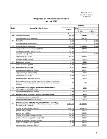 Załącznik nr 1 do Uchwały budŜetowej na rok 2009 Prognoza dochodów budŜetowych na rok 2009 Dochody Dział Nazwa / źródło dochodu w tym: ogółem 1 600 630 700 2 dotacja celowa - drogi powiatowe 328 145 328 145 Turystyka 25 650 0 dotacja ze źródeł zagranicznych 25 650 Gospodarka mieszkaniowa wpływy z usług (§ 0830) 1 139 064 80 000 80 000 751 500 751 500 20 000 2 000 Działalność usługowa 12 000 12 000 opłata cmentarna (§ 0690) 12 000 12 000 Administracja publiczna 98 072 98 072 dotacja celowa na zadania zlecone 69 577 69 577 3 000 3 000 20 000 20 000 5 000 5 000 495 495 Urzędy naczelnych organów władzy państwowej, kontroli i ochrony prawa oraz sądownictwa 2 000 2 000 dotacja celowa na zadania zlecone 2 000 2 000 16 000 16 000 1 000 1 000 15 000 15 000 18 178 116 18 178 116 8 044 116 8 044 116 15 000 15 000 wpływy z róŜnych dochodów (§ 0970) Dochody jednostek samorządu terytorialnego związane z realizacją z zakresu administracji rządowej oraz innych zadań zleconych ustawami (§ 2360) Bezpieczeństwo publiczne i ochrona przeciwpoŜarowa dotacja celowa otrzymana z powiatu wpływy z mandatów karnych (§ 0570) Dochody od osób prawnych, od osób fizycznych i od innych jednostek nieposiadających osobowości prawnej oraz wydatki związane z ich poborem podatek od nieruchomości (§ 0310) podatek rolny (§ 0320) 25 650 20 000 20 000 2 000 wpływy z usług (§ 0830) 756 1 159 064 305 564 wpływy z róŜnych opłat (§ 0690) 0 25 650 305 564 pozostałe odsetki (§ 0920) 754 5 328 145 sprzedaŜ mienia (§ 0770) 751 4 328 145 dochody z dzierŜawy i najmu (§ 0750) 750 majątkowe Transport i łączność opłaty za uŜytkowanie wieczyste (§ 0470) 710 3 bieŜące podatek leśny (§ 0330) 105 000 105 000 podatek od środków transportu (§ 0340) 200 000 200 000 podatek w formie karty podatkowej (§ 0350) 26 000 26 000 podatek od spadków i darowizn (§ 0360) 50 000 50 000 opłata od posiadania psów (§ 0370) 15 000 15 000 wpływy z opłaty skarbowej (§ 0410) 70 000 70 000 0 0 0 0 0 1 wpływy z opłaty targowej (§ 0430) 760 000 760 000 wpływy z opłaty miejscowej (§ 0440) 750 000 750 000 opłata eksploatacyjna (§ 0460) 150 000 150 000 wpływy z opłaty za zezwolenia na sprzedaŜ napojów alkoholowych (§ 0480) 600 000 600 000 wpływy z innych lokalnych opłat (§ 0490) 110 000 110 000 podatek od czynności cywilnoprawnych (§ 0500) 900 000 900 000 20 000 20 000 1 000 1 000 wpływy z róŜnych opłat (§ 0690) 26 000 26 000 odsetki (§ 0910) 80 000 80 000 6 250 000 6 250 000 6 000 6 000 RóŜne rozliczenia 4 715 822 4 715 822 część oświatowa subwencji ogólnej 4 300 403 4 300 403 335 419 335 419 80 000 80 000 789 914 789 914 dotacja celowa na zadania własne 18 462 18 462 Dochody z najmu (§ 0750) 17 501 17 501 opłata za stołówkę (§ 0690) 423 916 423 916 wpływy z usług (§ 0830) - odpłatność za przedszkole 327 035 327 035 3 000 3 000 Pomoc społeczna 3 169 510 3 169 510 dotacja celowa na zadania zlecone 2 767 143 2 767 143 356 567 356 567 20 000 20 000 1 800 1 800 24 000 24 000 505 000 505 000 25 000 25 000 480 000 480 000 0 zaległości z podatków zniesionych (§ 0560) kary i grzywny (§ 0570) udziały w podatkach stanowiących dochód budŜetu państwa rekompensaty utraconych dochodów w podatkach i opłatach lokalnych (§ 2680) 758 część wyrównawcza subwencji ogólnej odsetki od środków na rachunku bankowym 801 Oświata i wychowanie pozostałe odsetki (§ 0920) 852 dotacja celowa na zadania własne odpłatność za usługi opiekuńcze (§ 0830) pozostałe odsetki (§ 0920) wpływy z róŜnych dochodów (§ 0970) 900 Gospodarka komunalna i ochrona środowiska wpływy z róŜnych opłat (§ 0690) dochody z korzystania z urządzeń komunalnych (§ 0830) 921 926 Kultura i ochrona dziedzictwa narodowego 4 486 931 dotacje ze źródeł zagranicznych na dofinansowanie zadań inwestycyjnych 4 486 931 Kultura fizyczna i sport 2 971 477 dotacje ze źródeł zagranicznych na dofinansowanie zadań inwestycyjnych 2 971 477 RAZEM 36 457 701 0 0 0 0 4 486 931 4 486 931 0 2 971 477 2 971 477 28 953 643 7 504 058 2