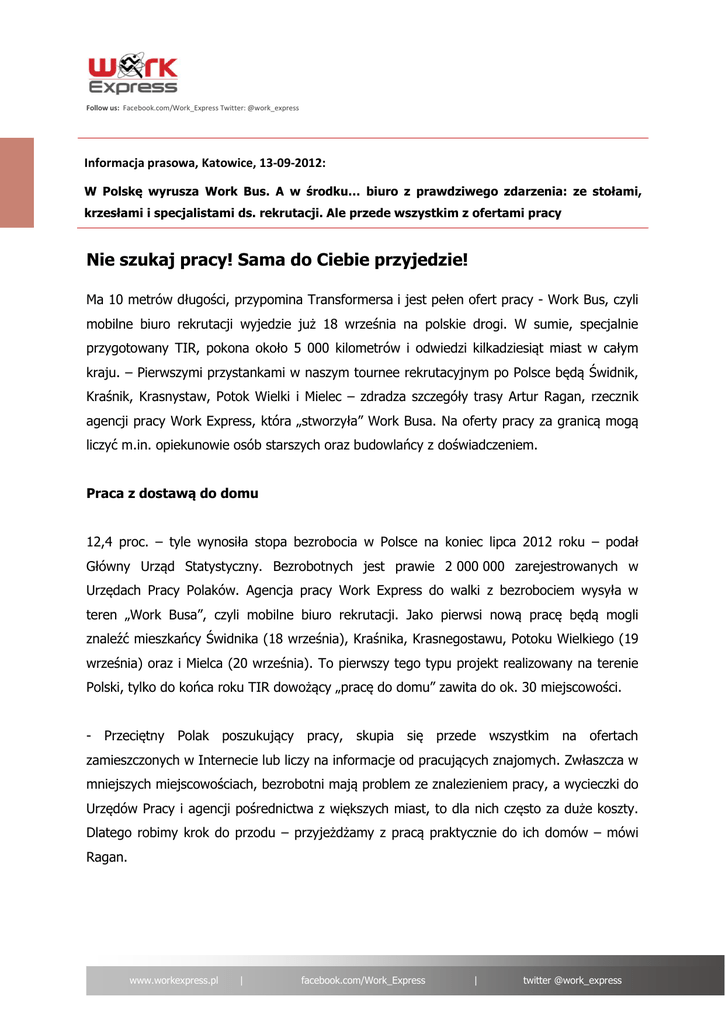 Follow us: Facebook.com/Work_Express Twitter: @work_express Informacja prasowa, Katowice, 13-09-2012: W Polskę wyrusza Work Bus. A w środku… biuro z prawdziwego zdarzenia: ze stołami, krzesłami i specjalistami ds. rekrutacji. Ale przede wszystkim z ofertami pracy Nie szukaj pracy! Sama do Ciebie przyjedzie! Ma 10 metrów długości, przypomina Transformersa i jest pełen ofert pracy - Work Bus, czyli mobilne biuro rekrutacji wyjedzie już 18 września na polskie drogi. W sumie, specjalnie przygotowany TIR, pokona około 5 000 kilometrów i odwiedzi kilkadziesiąt miast w całym kraju. – Pierwszymi przystankami w naszym tournee rekrutacyjnym po Polsce będą Świdnik, Kraśnik, Krasnystaw, Potok Wielki i Mielec – zdradza szczegóły trasy Artur Ragan, rzecznik agencji pracy Work Express, która „stworzyła” Work Busa. Na oferty pracy za granicą mogą liczyć m.in. opiekunowie osób starszych oraz budowlańcy z doświadczeniem. Praca z dostawą do domu 12,4 proc. – tyle wynosiła stopa bezrobocia w Polsce na koniec lipca 2012 roku – podał Główny Urząd Statystyczny. Bezrobotnych jest prawie 2 000 000 zarejestrowanych w Urzędach Pracy Polaków. Agencja pracy Work Express do walki z bezrobociem wysyła w teren „Work Busa”, czyli mobilne biuro rekrutacji. Jako pierwsi nową pracę będą mogli znaleźć mieszkańcy Świdnika (18 września), Kraśnika, Krasnegostawu, Potoku Wielkiego (19 września) oraz i Mielca (20 września). To pierwszy tego typu projekt realizowany na terenie Polski, tylko do końca roku TIR dowożący „pracę do domu” zawita do ok. 30 miejscowości. - Przeciętny Polak poszukujący pracy, skupia się przede wszystkim na ofertach zamieszczonych w Internecie lub liczy na informacje od pracujących znajomych. Zwłaszcza w mniejszych miejscowościach, bezrobotni mają problem ze znalezieniem pracy, a wycieczki do Urzędów Pracy i agencji pośrednictwa z większych miast, to dla nich często za duże koszty. Dlatego robimy krok do przodu – przyjeżdżamy z pracą praktycznie do ich domów – mówi Ragan. www.workexpress.pl | facebook.com/Work_Express | twitter @work_express Follow us: Facebook.com/Work_Express Twitter: @work_express Mobilne znaczy lepsze Bezrobotni poszukujący pracy nie tylko oszczędzą pieniądze i czas na dojazd do Urzędu Pracy w większym mieście, ale także będą mieli możliwość bezpośrednio i na miejscu otrzymać wszelkie niezbędne informacje, dotyczące danej oferty pracy. Mało tego, nigdy wcześniej nie można było zdobyć pracy w 45 minut. Tyle właśnie czasu może zająć proces rekrutacyjny, od rozmowy z kandydatem, do podjęcia decyzji o jego zatrudnieniu. - Podczas postojów Work Busa będziemy pomagać osobom zainteresowanym znalezieniem zatrudnienia a także przywieziemy interesujące oferty pracy za granicą. Większość z nich jest przeznaczona dla osób z doświadczeniem w branży budowlanej albo opiece nad osobami starszymi, ale każdy kto zgłosi się do Work Busa, uzyska cenne informacje związane z zatrudnieniem. Podpowiemy, jak zwycięsko przejść przez proces rekrutacji, jak wygląda rozmowa kwalifikacyjna, a także, w jaki sposób należy się do niej przygotować. Nasi doradcy odpowiedzą na wszystkie pytania osób poszukujących pracy. W ten właśnie sposób, zamierzamy aktywnie wesprzeć działania podejmowane przez Powiatowe Urzędy Pracy w wielu miejscowościach dotkniętych wysokim bezrobociem – tłumaczy rzecznik agencji pracy. Trasa: Świdnik, Kraśnik, Krasnystaw i Mielec Work Bus wyrusza na misję we wtorek 18 września. Pierwszym etapem jego podróży będzie województwo lubelskie, w którym bezrobocie na koniec lipca 2012 wynosiło 12,9 proc. W Urzędach Pracy zarejestrowanych jest prawie 120 000 ludzi. Więcej informacji: Artur RAGAN – rzecznik prasowy Work Express, tel. 513 015 260, mail. [email protected] O Work Express Sp. z.o.o. Work Express to certyfikowana agencja doradztwa personalnego i pracy tymczasowej, która działa na rynku od 2004 r. Firma oferuje usługi z zakresu pracy tymczasowej i doradztwa personalnego, pozostając jednym z liderów branży HR a od 2009 rozwija również ofertę outsourcingową. Centrala firmy znajduje się w Katowicach, a oddziały w Częstochowie, Gliwicach, Grodzisku Mazowieckim, Krakowie, Łodzi, Poznaniu i Wrocławiu. Poza Polską prowadzi działalność także na terenie Francji, Niemiec i Belgii. Spółka należy do Polskiego Forum HR a prezes zarządu agencji działa we władzach tej organizacji. Zespół Work Express to ponad 170 fachowców, którzy zatrudnili już ponad 50 000 pracowników tymczasowych. Firma została uhonorowana godłem EU Standard 2007 za stworzenie nowoczesnego systemu informatycznego HR Express Manager, wspierającego proces rekrutacji oraz usługi pracy tymczasowej. W 2011 agencja zdobyła godło programu „Firma Przyjazna Klientowi” a w 2012 uzyskała certyfikat ISO 9001. www.workexpress.pl | facebook.com/Work_Express | twitter @work_express