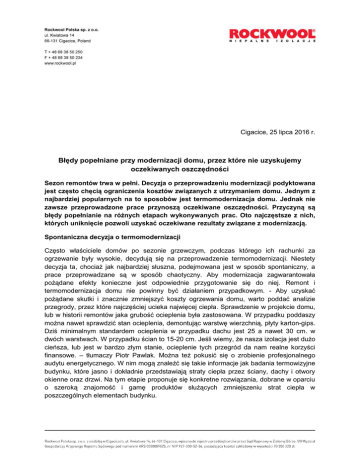 Cigacice, 25 lipca 2016 r. Błędy popełniane przy modernizacji domu, przez które nie uzyskujemy oczekiwanych oszczędności Sezon remontów trwa w pełni. Decyzja o przeprowadzeniu modernizacji podyktowana jest często chęcią ograniczenia kosztów związanych z utrzymaniem domu. Jednym z najbardziej popularnych na to sposobów jest termomodernizacja domu. Jednak nie zawsze przeprowadzone prace przynoszą oczekiwane oszczędności. Przyczyną są błędy popełnianie na różnych etapach wykonywanych prac. Oto najczęstsze z nich, których uniknięcie pozwoli uzyskać oczekiwane rezultaty związane z modernizacją. Spontaniczna decyzja o termomodernizacji Często właściciele domów po sezonie grzewczym, podczas którego ich rachunki za ogrzewanie były wysokie, decydują się na przeprowadzenie termomodernizacji. Niestety decyzja ta, chociaż jak najbardziej słuszna, podejmowana jest w sposób spontaniczny, a prace przeprowadzane są w sposób chaotyczny. Aby modernizacja zagwarantowała pożądane efekty konieczne jest odpowiednie przygotowanie się do niej. Remont i termomodernizacja domu nie powinny być działaniem przypadkowym. - Aby uzyskać pożądane skutki i znacznie zmniejszyć koszty ogrzewania domu, warto poddać analizie przegrody, przez które najczęściej ucieka najwięcej ciepła. Sprawdzenie w projekcie domu, lub w historii remontów jaka grubość ocieplenia była zastosowana. W przypadku poddaszy można nawet sprawdzić stan ocieplenia, demontując warstwę wierzchnią, płyty karton-gips. Dziś minimalnym standardem ocieplenia w przypadku dachu jest 25 a nawet 30 cm. w dwóch warstwach. W przypadku ścian to 15-20 cm. Jeśli wiemy, że nasza izolacja jest dużo cieńsza, lub jest w bardzo złym stanie, ocieplenie tych przegród da nam realne korzyści finansowe. – tłumaczy Piotr Pawlak. Można też pokusić się o zrobienie profesjonalnego audytu energetycznego. W nim mogą znaleźć się takie informacje jak badania termowizyjne budynku, które jasno i dokładnie przedstawiają straty ciepła przez ściany, dachy i otwory okienne oraz drzwi. Na tym etapie proponuje się konkretne rozwiązania, dobrane w oparciu o szeroką znajomość i gamę produktów służących zmniejszeniu strat ciepła w poszczególnych elementach budynku. Przygotowanie to klucz do sukcesu W zależności od analiz i zakresu prac jakie planujemy, warto zastanowić się nad wykonaniem projektu architektoniczno-budowlanego. Ma on istotny wpływ nie tylko na ustalenie zapotrzebowania na ciepło do ogrzewania budynku oraz optymalnego ocieplenia, ale także na wygląd zewnętrznej elewacji budynku. Jeśli decydujemy się na takie działania, należy również uzyskać odpowiednie pozwolenia lub zgłosić prowadzenie prac budowlanych odpowiedniemu organowi. - Ściany naszego domu można ocieplać bez pozwolenia na budowę, gdy jego wysokość nie przekracza wysokości 12 m. W związku z tym jedyną czynnością administracyjną, którą należy wykonać w procesie termomodernizacji tego domu jest zgłoszenie właściwemu organowi (np. urzędowi gminy lub powiatu albo też urzędowi miejskiemu) przeprowadzenia robót budowlanych. Formularz zgłoszenia można znaleźć na stronach internetowych organów administracyjnych lub też w samych siedzibach działów architektoniczno-budowlanych jednostek administracyjnych. W samym zgłoszeniu (należy opisać rodzaj i grubość materiału ociepleniowego oraz sposób przeprowadzenia prac budowlanych. Taki opis zaczerpnąć można dosłownie z broszur czy stron producentów materiałów budowlanych. Zgodnie z prawem budowlanym wszystkich tych formalności należy dopełnić przed terminem zamierzonego rozpoczęcia robót budowlanych. Do wykonywania prac można przystąpić dopiero po terminie 30 dni od dnia doręczenia zgłoszenia do właściwego organu – podkreśla Piotr Pawlak, ekspert ROCKWOOL Polska. Jakość i optymalny dobór ocieplenia to podstawa Ocieplając dom, lub przeprowadzając inne prace remontowe, często szukamy oszczędności, aby nasze nakłady na inwestycję były jak najniższe. Należy jednak dokładnie zastanowić się, gdzie możemy szukać oszczędności, a gdzie nie. Dużym błędem jest cięcie kosztów materiałów budowlanych. Musimy pamiętać, że takie znaczące prace przeprowadzamy raz na kilka lub nawet kilkanaście lat, więc użyte produkty muszą charakteryzować się dużą trwałością. Jeżeli zaoszczędzimy na materiale lub wybierzemy jego nieodpowiedni rodzaj może się okazać, że izolacja straci swoją szczelność już po kilku latach, a co za tym idzie pieniądze znowu zaczną nam uciekać przez ściany i dach. Ważny jest także dobór optymalnej grubości ocieplenia – aby była ona uzasadniona rachunkiem ekonomicznym. - Od lat radzimy inwestorom indywidualnym sprawdzoną metodę – dostosowanie domu do tzw. Standardu ROCKWOOL. Podpowiadamy takie grubości ocieplenia, które pomagają obniżyć zużycie energii i jednocześnie „zwracają się” w przeciągu kilku lat. Dzięki takim kalkulatorom jak OptiHouse, inwestorzy sami mogą konkretnie sprawdzić, ile zaoszczędzą w swoim przyszłym domu. Co więcej mogą zoptymalizować grubość ocieplenia, czyli dobrać ją tak by korzyści były największe a nakłady najmniejsze. Nie sztuką jest przepłacić za zaawansowane instalacje grzewcze. Sztuką jest zainwestowanie tam, gdzie się to faktycznie opłaci - tłumaczy Piotr Pawlak. Sprawdzony i doświadczony wykonawca Innym aspektem jest wykonawstwo. Efekty nawet najlepszego planu, projektu, analizy można zwyczajowo popsuć wykonawstwem. Dlatego kluczowe znaczenie ma doświadczenie wykonawcy i jego wiedza, poparta np. certyfikatami. Z pomocą mogą przyjść tu producenci materiałów, którzy udostępniają informacje na temat certyfikowanych wykonawców na swoich stronach. Mamy wtedy pewność, ze wykonawca taki przeszedł proces nie tylko teoretyczny, ale i praktyczny w ramach którego zapozn
